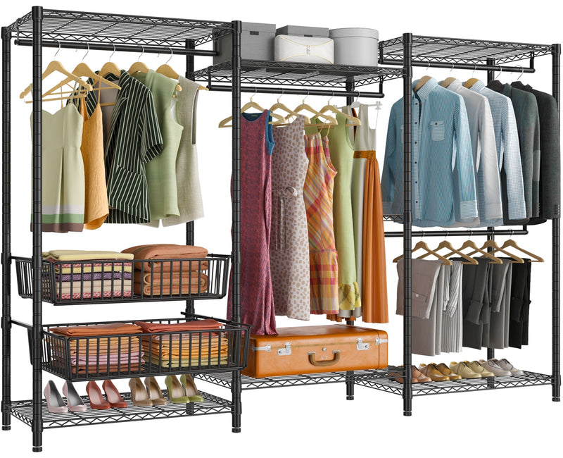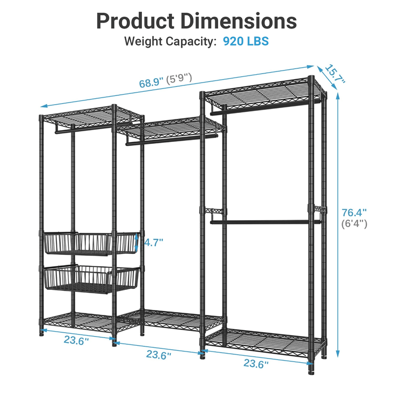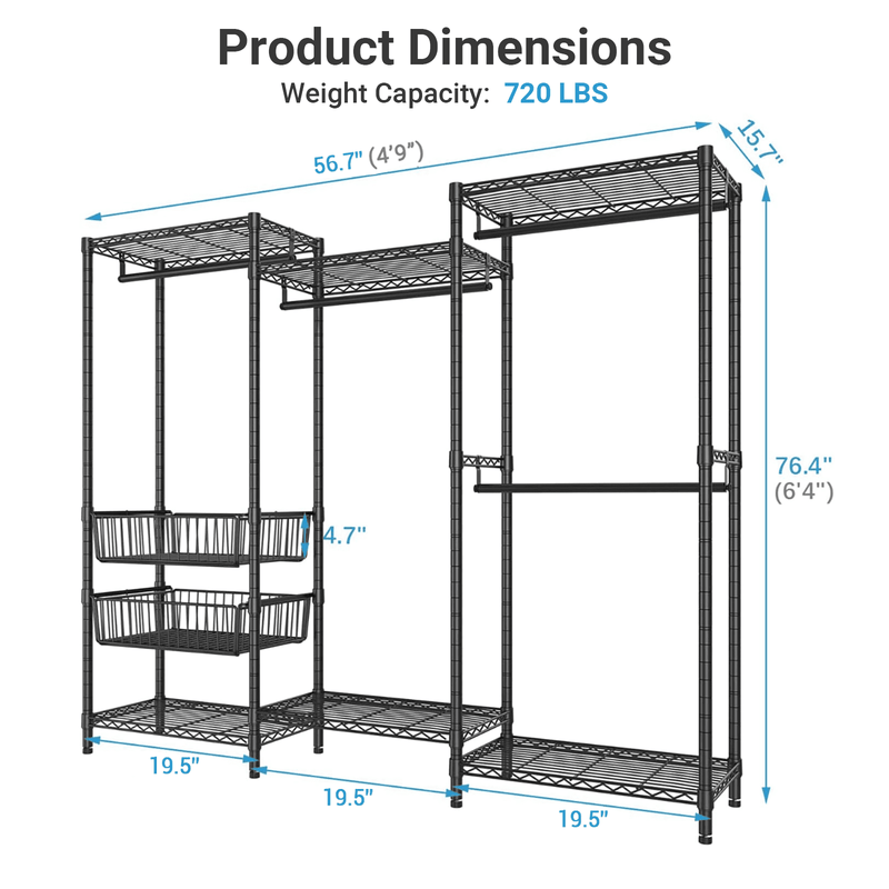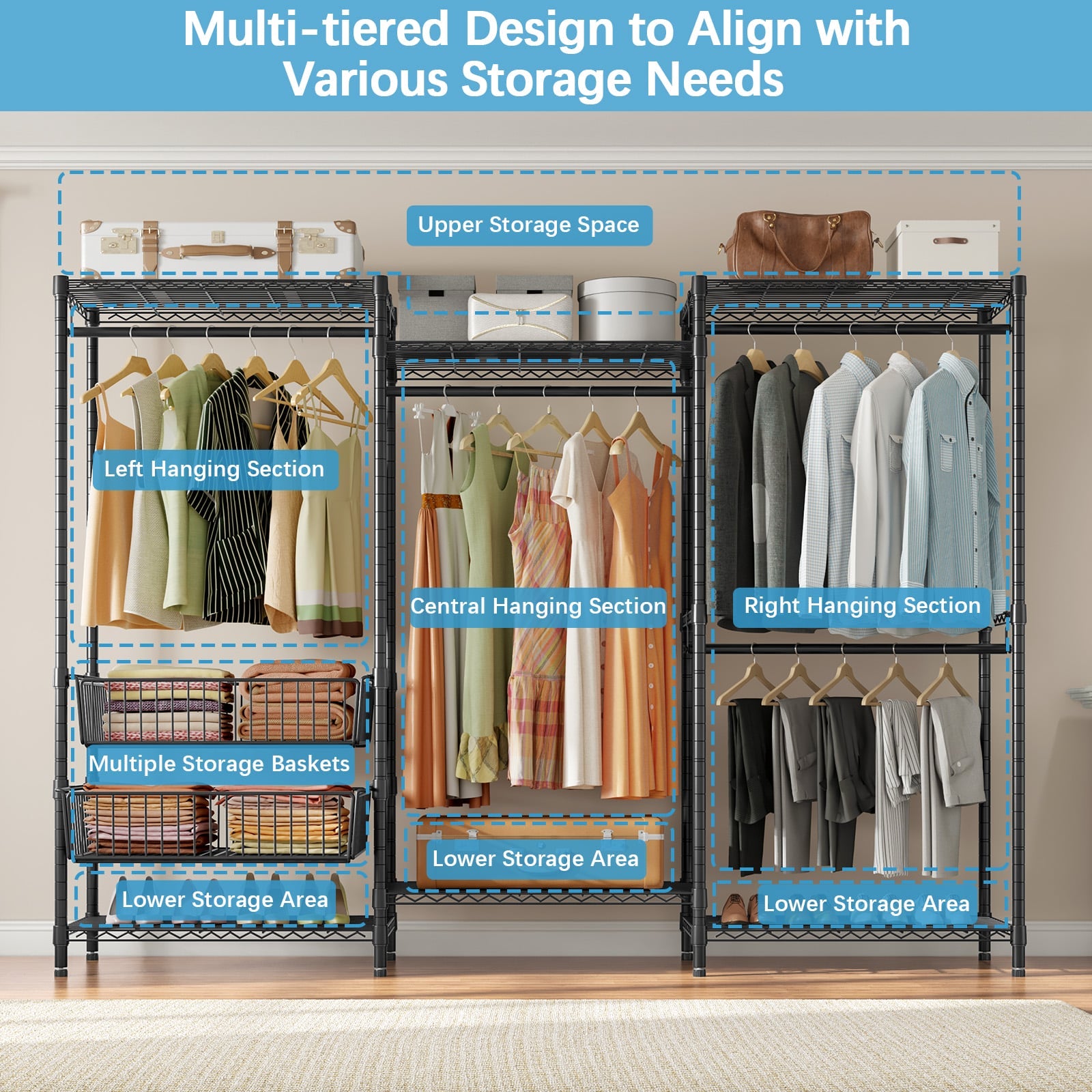 - MULTIFUNCTION STEEL CLOSET SYSTEM ORGANIZER: 5 Tiers clothes racks for hanging clothes, placing accessories, bedding, lining, shoes, etc. Easily maximize your storage space by providing shoe storage, double hang storage, long hang storage, folded storage.