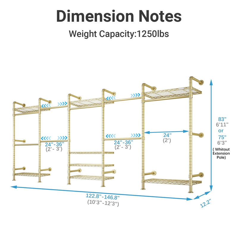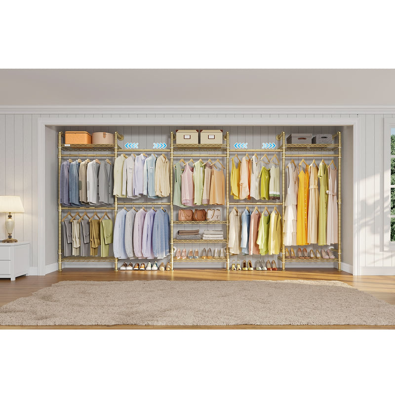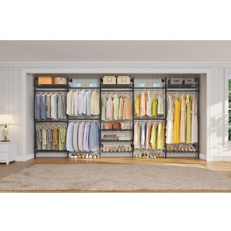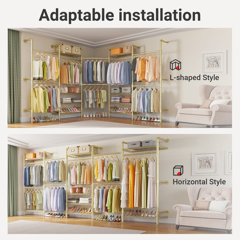 - Fully Customizable Storage Layout:Features 8 adjustable shelves and 4 expandable hanging rods, allowing flexible configurations like L-shape or U-shape designs, It also comes with six 8-inch extension poles that can increase the overall height from 75 inches to 83 inches to meet varied organization needs.