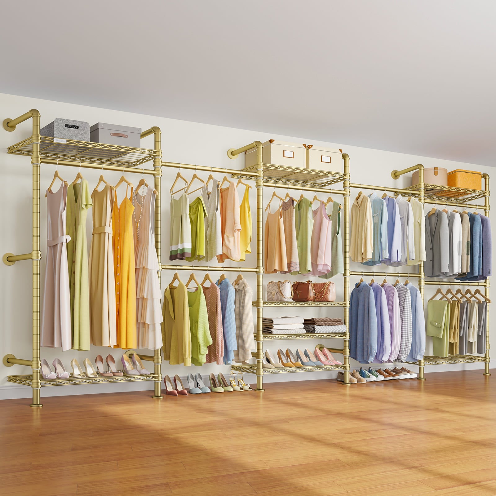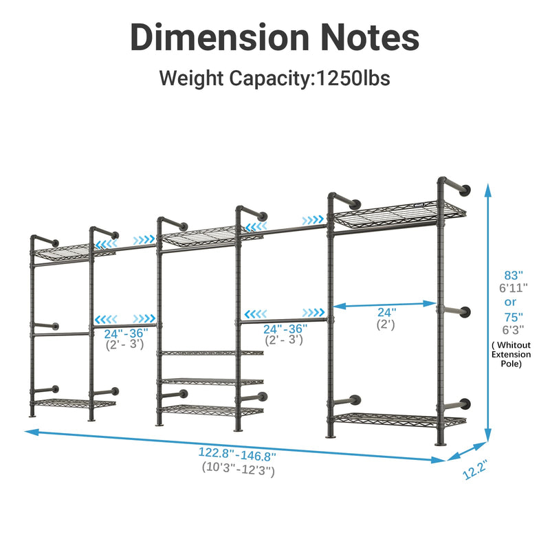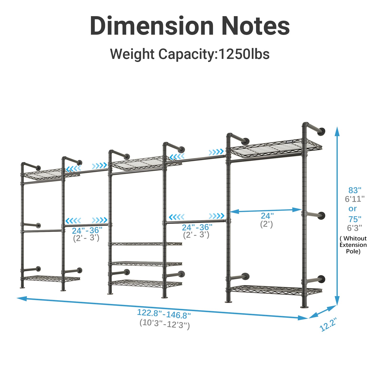- Solution for Large Spaces:Designed for expansive areas from 10'3" to 12'3", this heavy duty wall mounted clothing rack maximizes storage in walk-in closets, dressing rooms, and master bedrooms, offering superior space utilization.