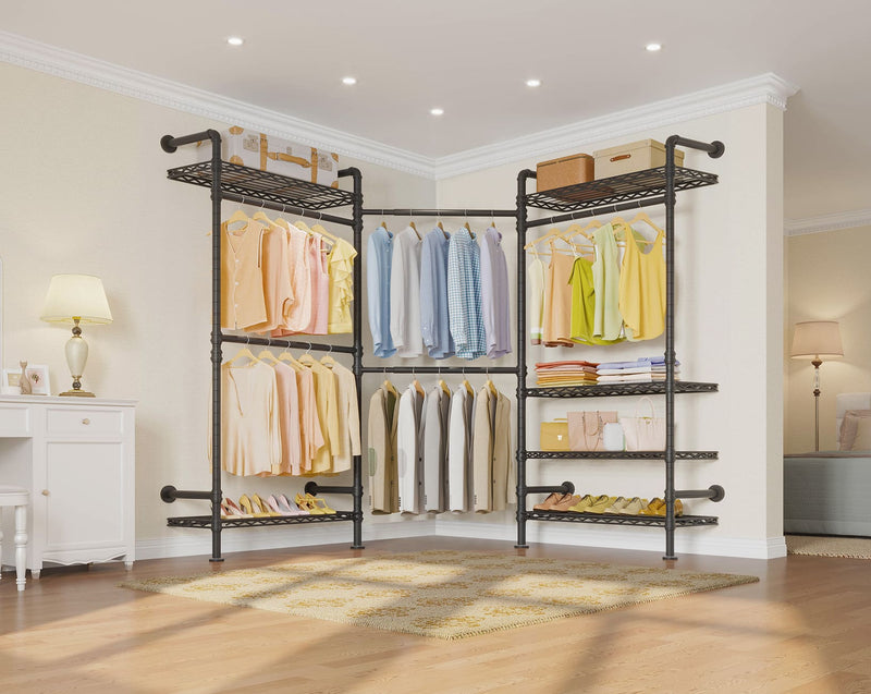 Timate L3 L‑Shape Closet System blends rugged industrial style with smart organization for any corner space. With 6 adjustable shelves and 5 rods (2 expandable), it fits 54"–64.8" walls to create versatile layouts that maximize storage. Built from matte powder‑coated steel, it supports up to 950 lbs, staying sturdy and rust‑free. Perfect for bedrooms, laundry rooms, or walk‑in closets, it adds strength, flexibility, and style to your home.