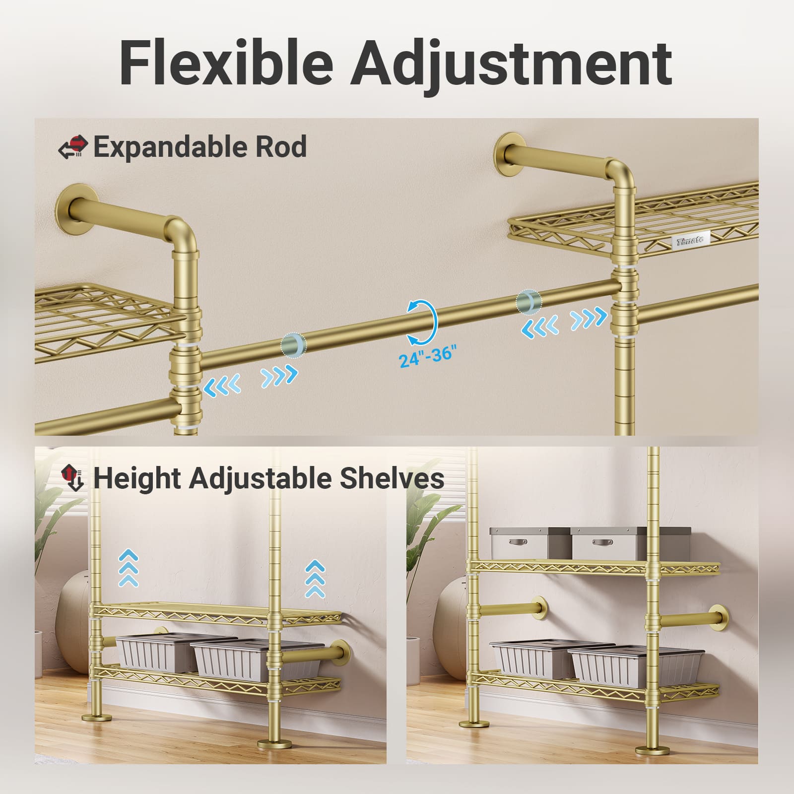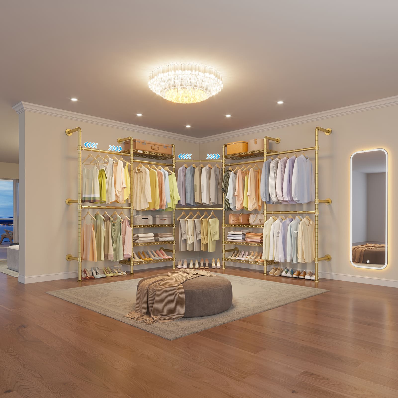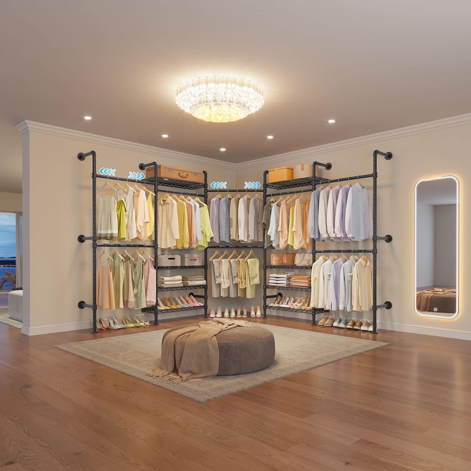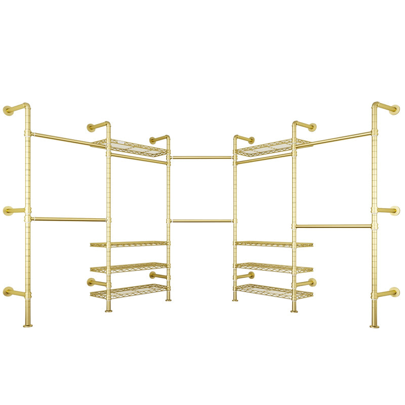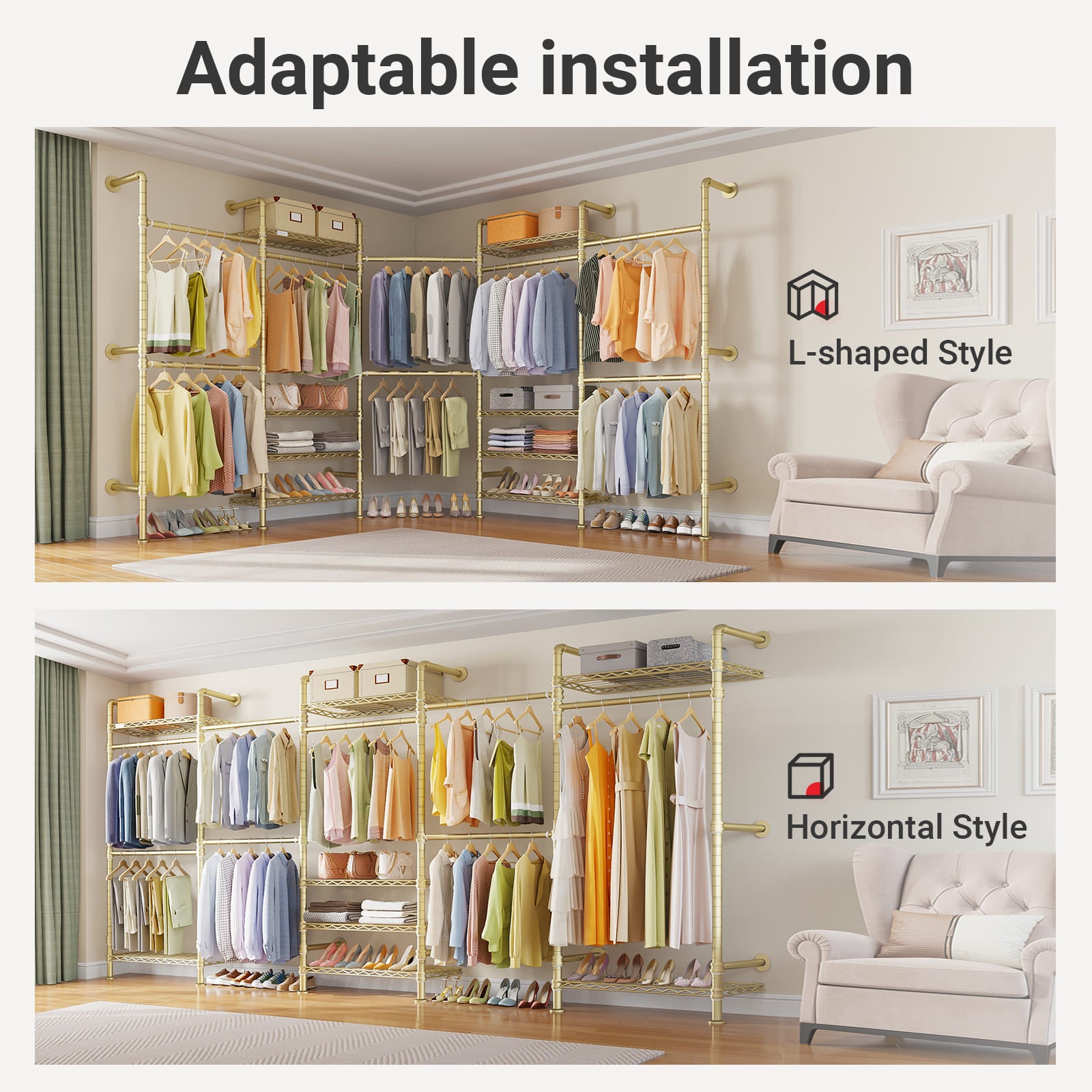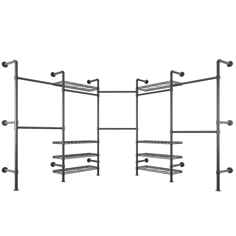 - 3 installation methods: Fully customizable storage layout. Features 8 adjustable shelves and 4 expandable hanging rods, allowing flexible configurations like I-shape or U-shape designs to meet varied organization needs. It also comes with six 8-inch extension poles that can increase the overall height from 75 inches to 83 inches to meet varied organization needs.