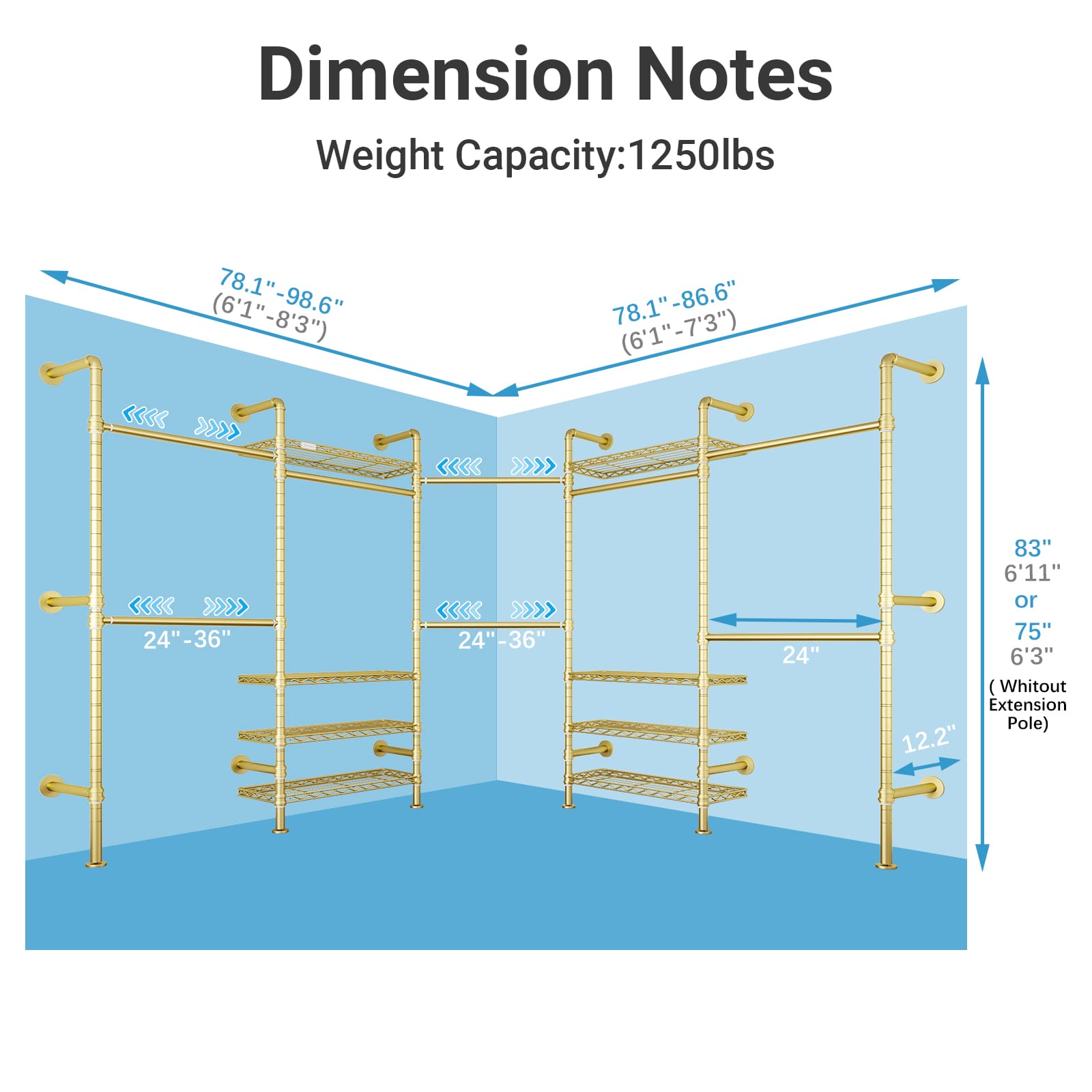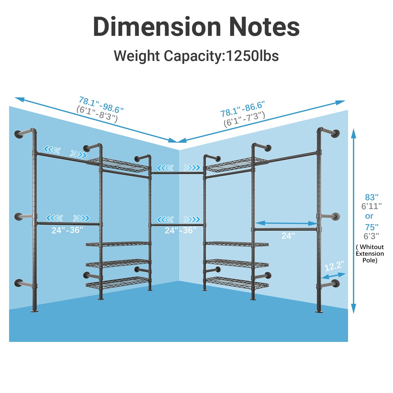 - Solution for Corner:Designed for corner, one side fits spaces 78.1"- 98.6" and other side fits spaces 78.1"- 86.6", this heavy duty wall mounted clothing rack maximizes storage in walk-in closets, dressing rooms, and master bedrooms, offering superior space utilization.