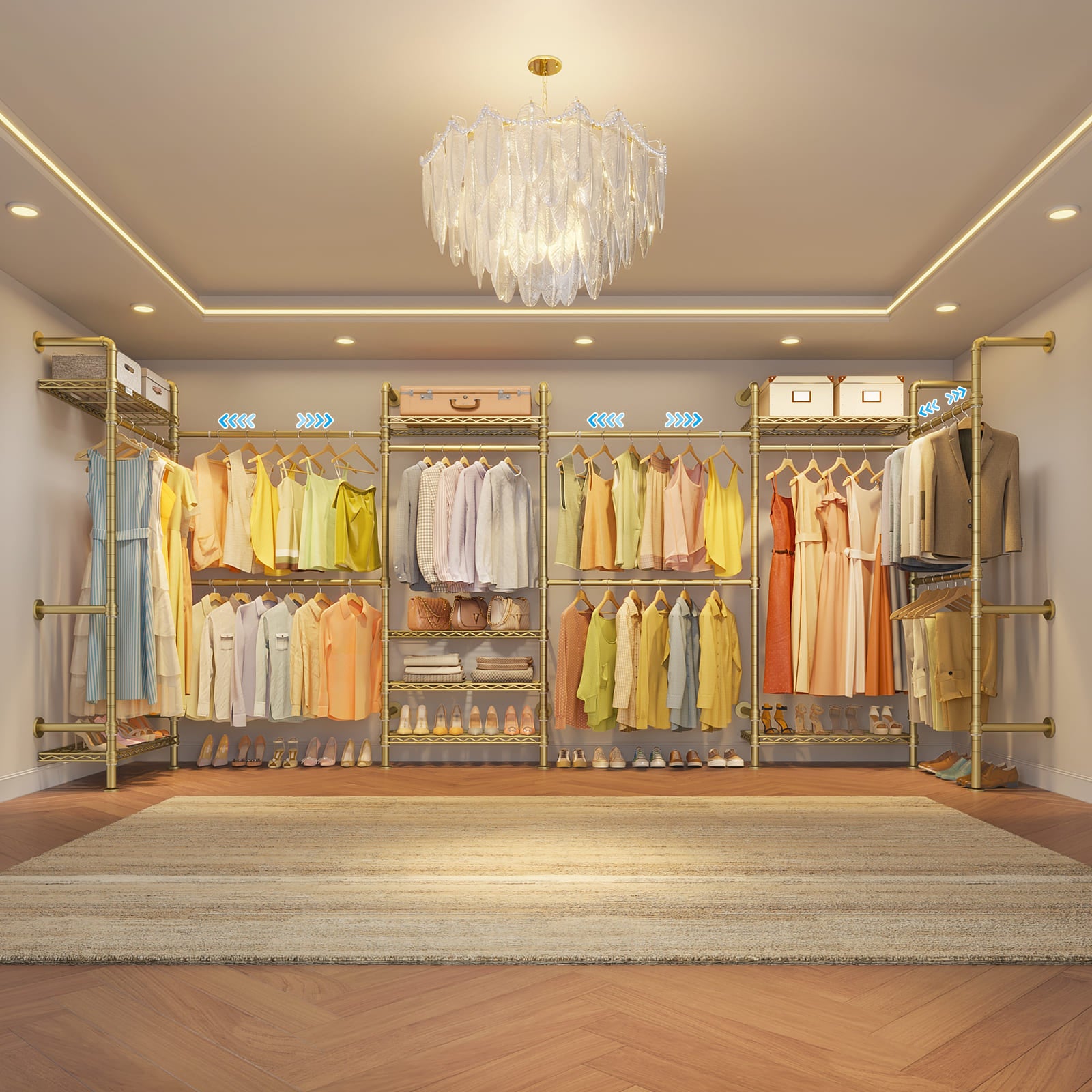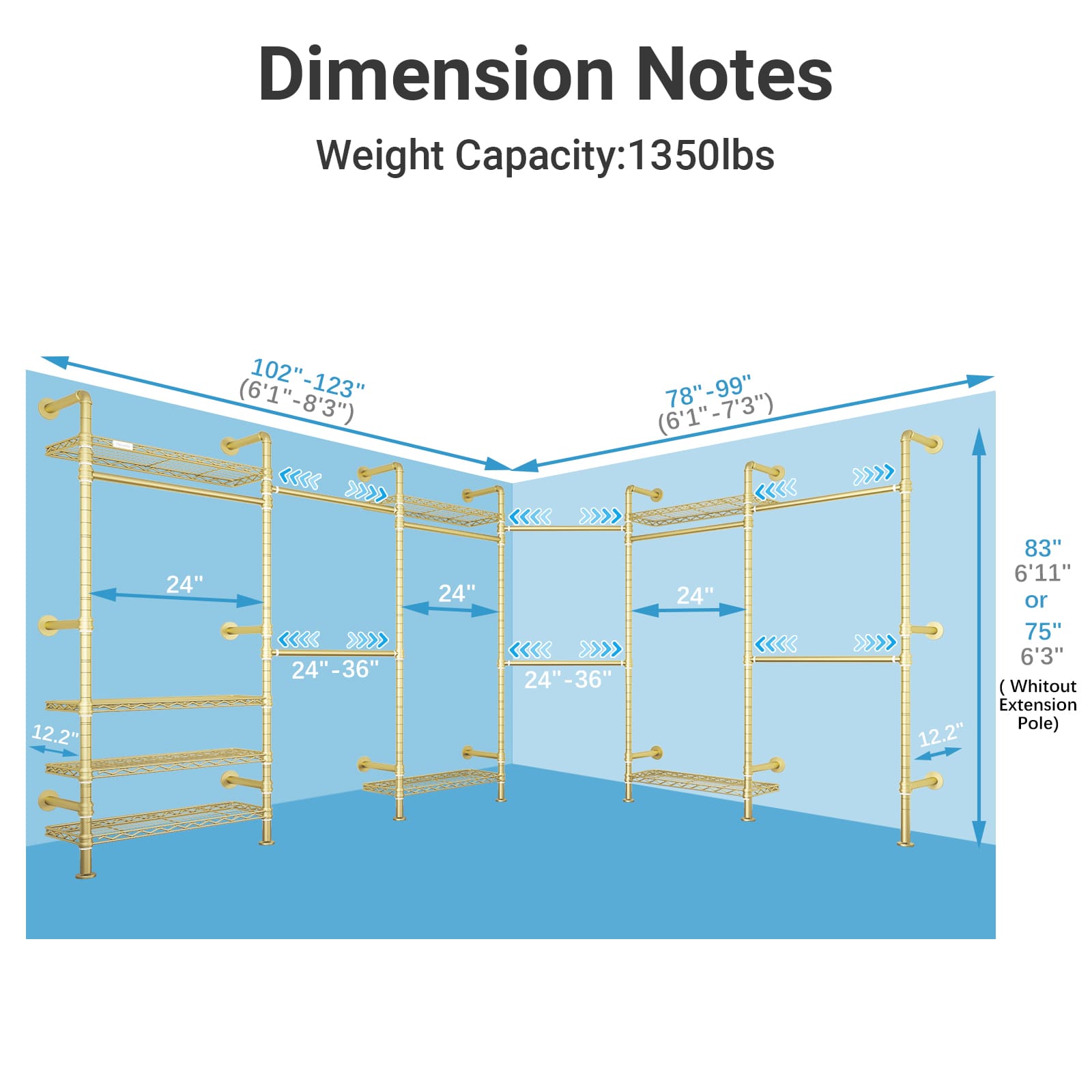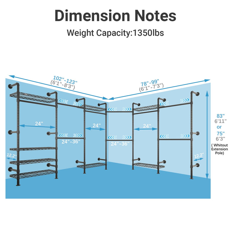 - Dimensions & Load Capacity-- (78"-99")L x (102"-123")W x (75"-83")H, Depth:12.2”. Load capacity up to 1350 lbs. It includes Expandable hanging rods (adjustable range: 24-36 ") and height-adjustable metal shelves (adjustable height: 75-83 ")