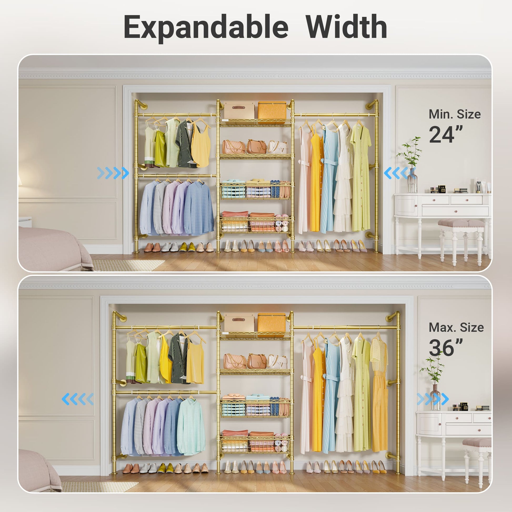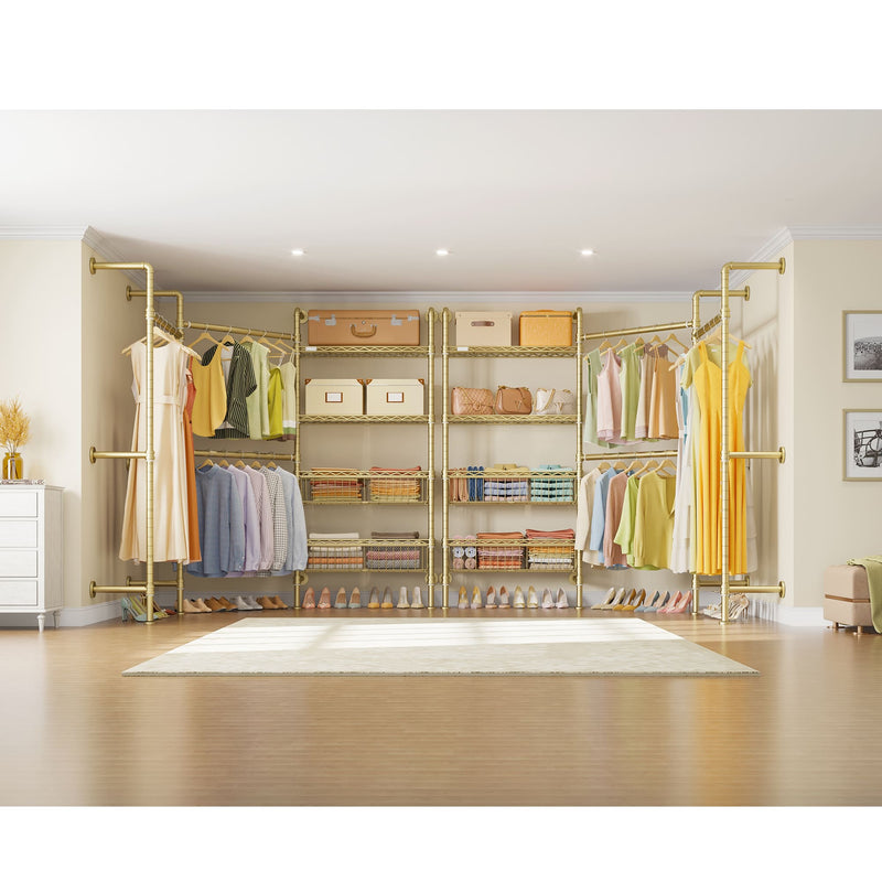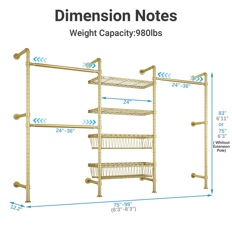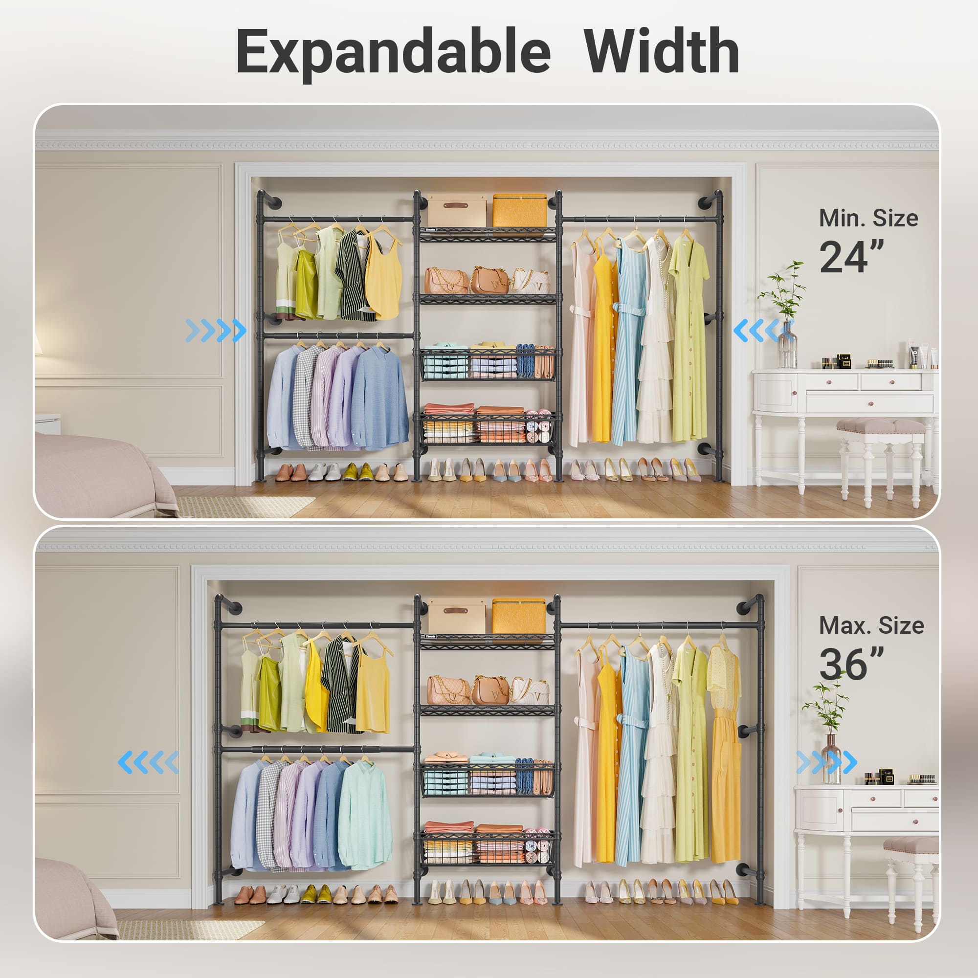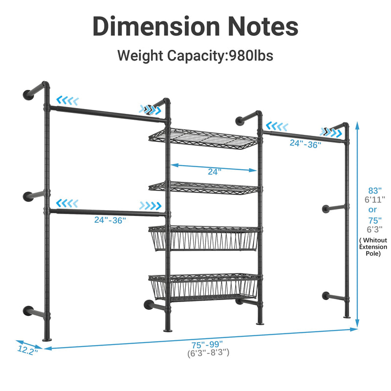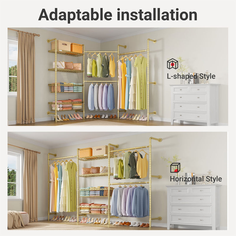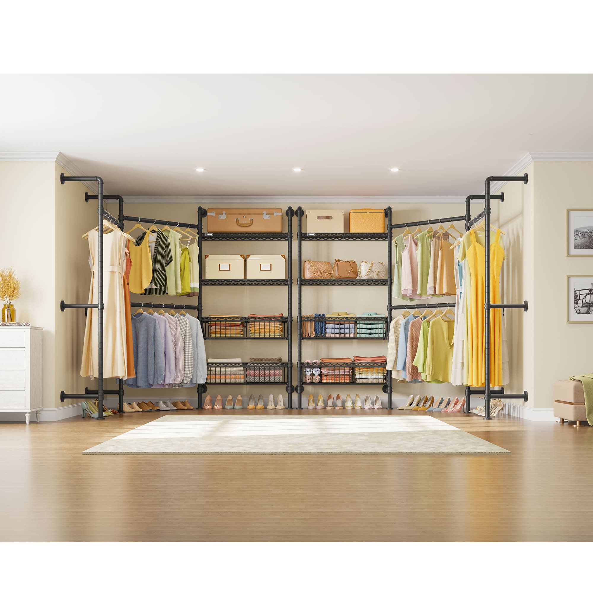 Timate X3 Wall Mounted Clothes Rack offers a large, expandable closet solution supporting up to 980 lbs. Crafted from scratch-resistant matte powder-coated metal, this industrial-style rack ensures stability without sagging. It features baskets and drawers for added organization, making it perfect for walk-in closets and multi-use spaces.