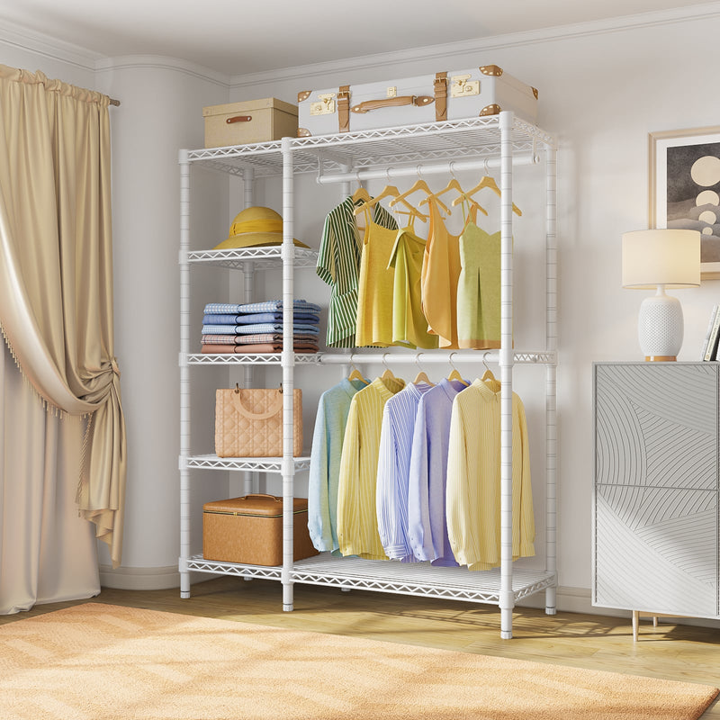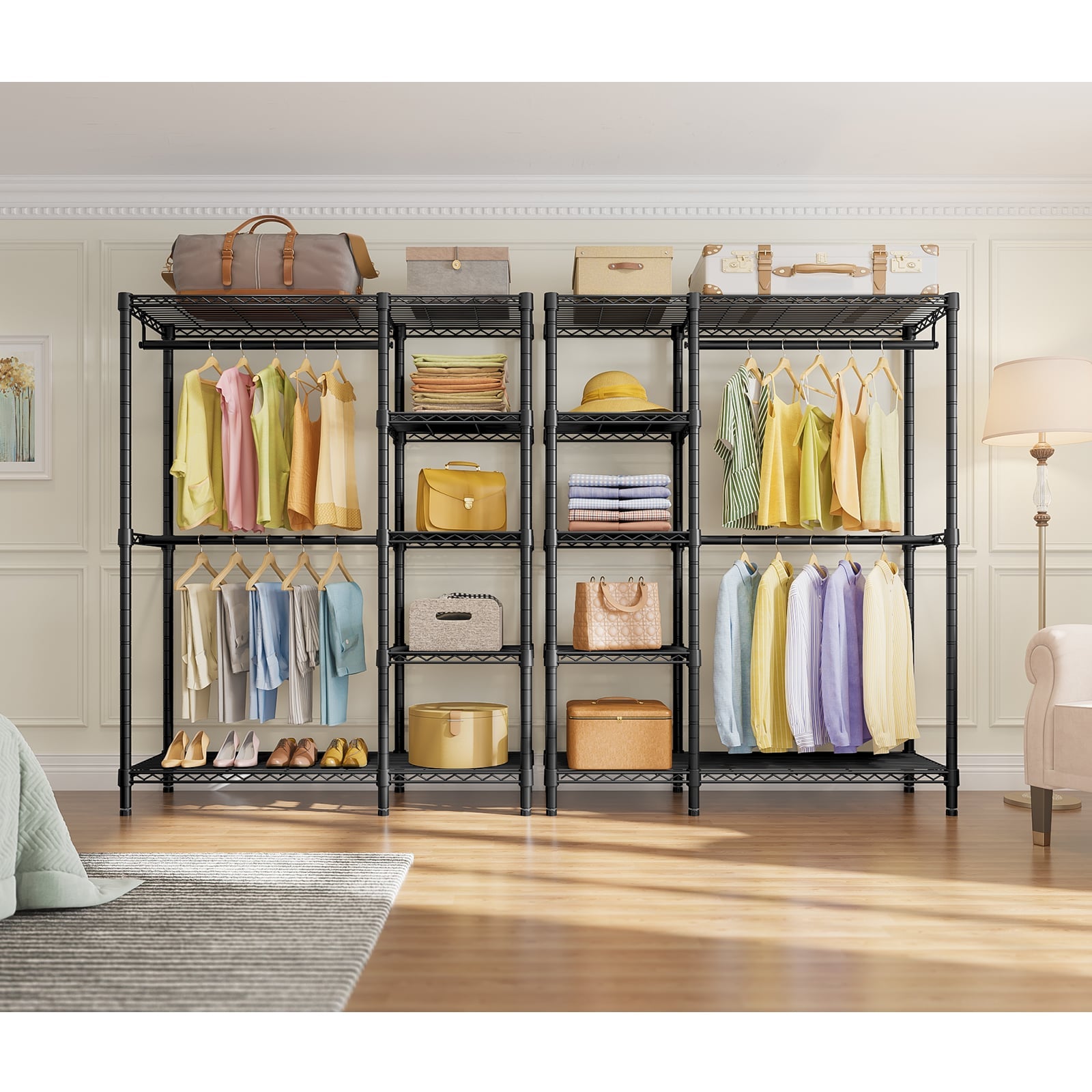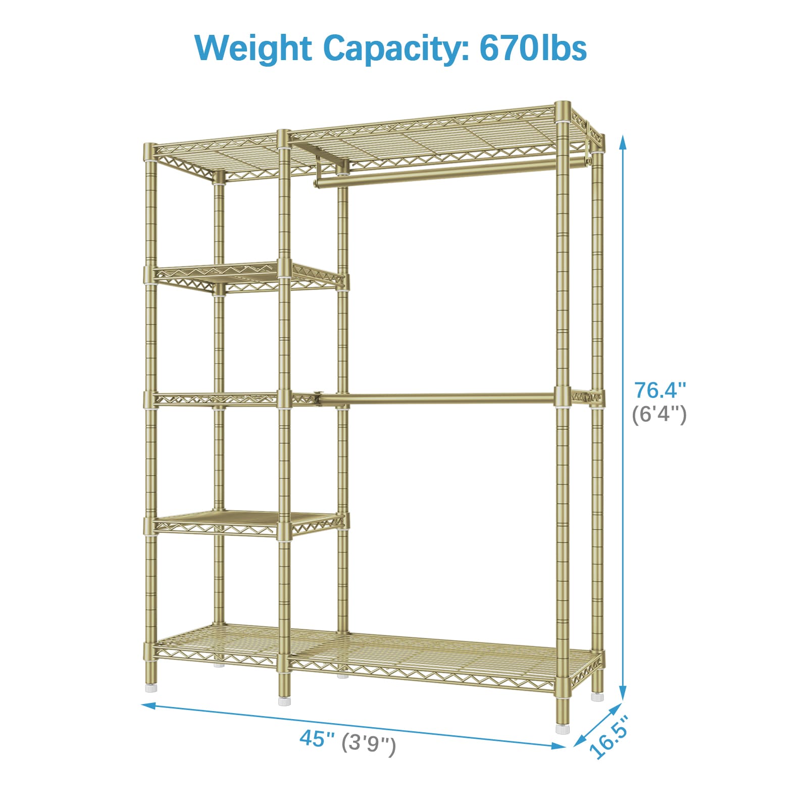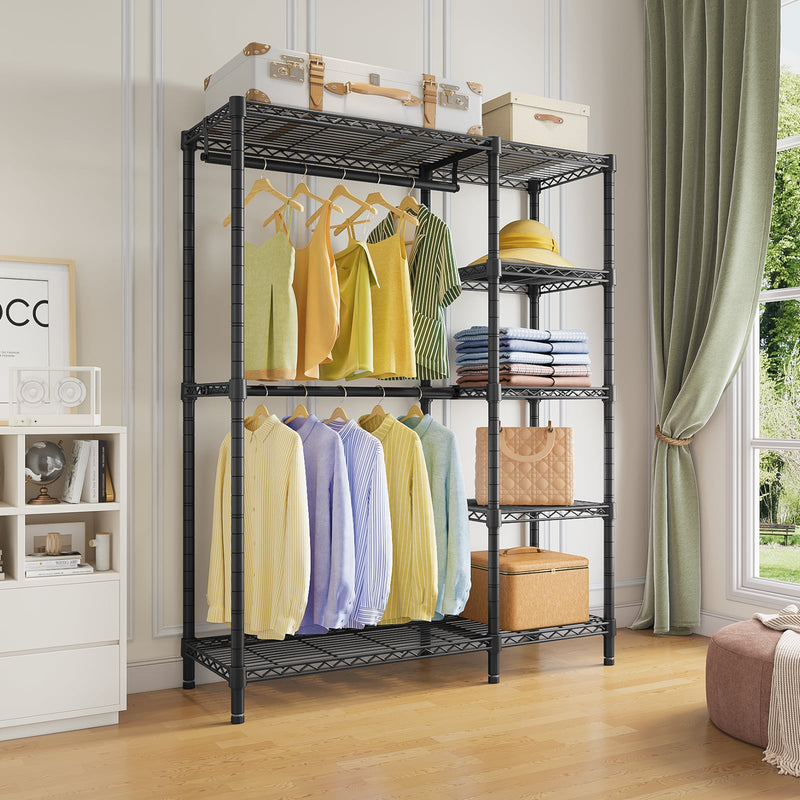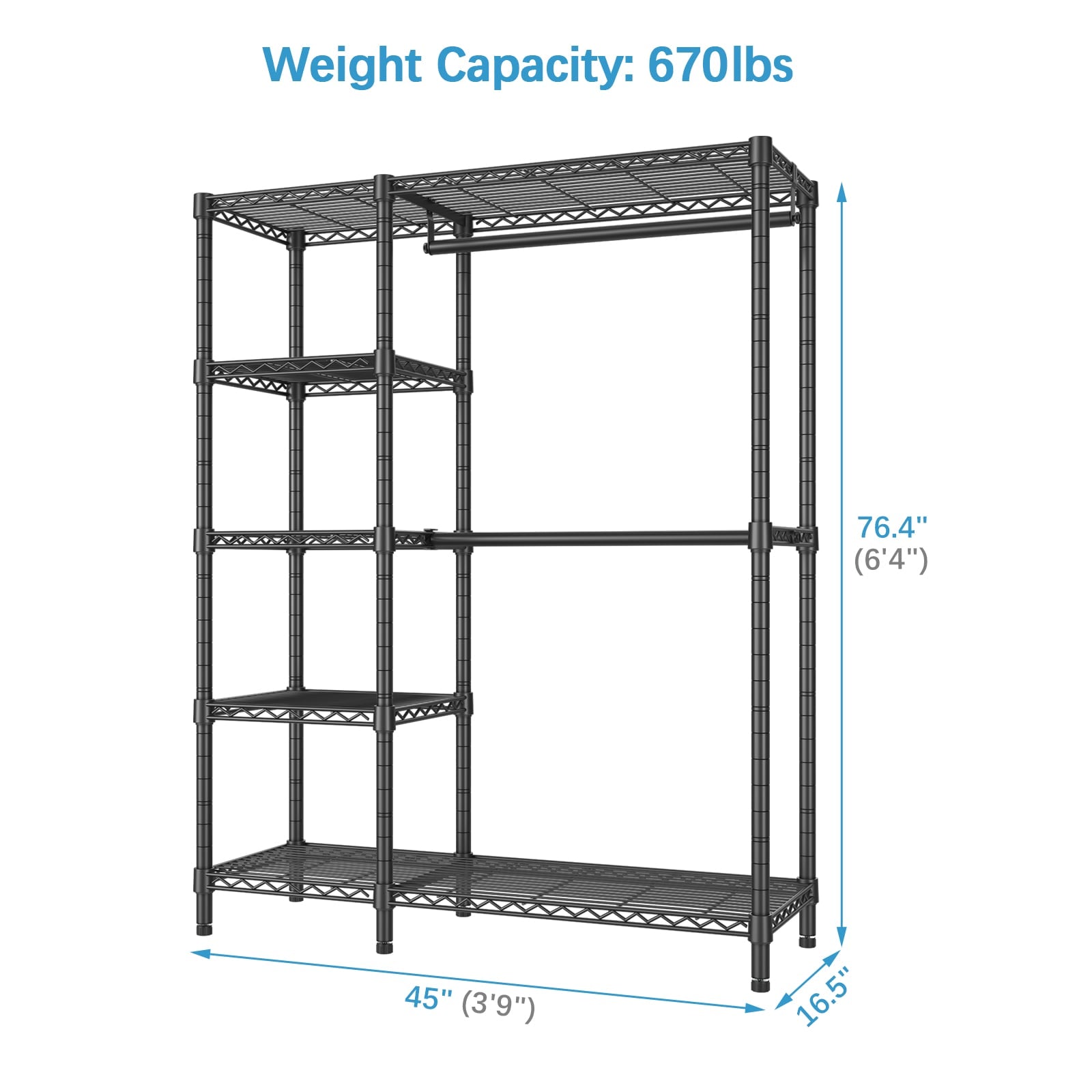 - 【Well-Organized Garment Rack】Double hanging rod is for hanging dress, suits, shirts, pants without wrinkle. And 5 tiers storage shelves provide enough place for handbag, hat, fold clothes, storage box, bedding. Say goodbye to messy!