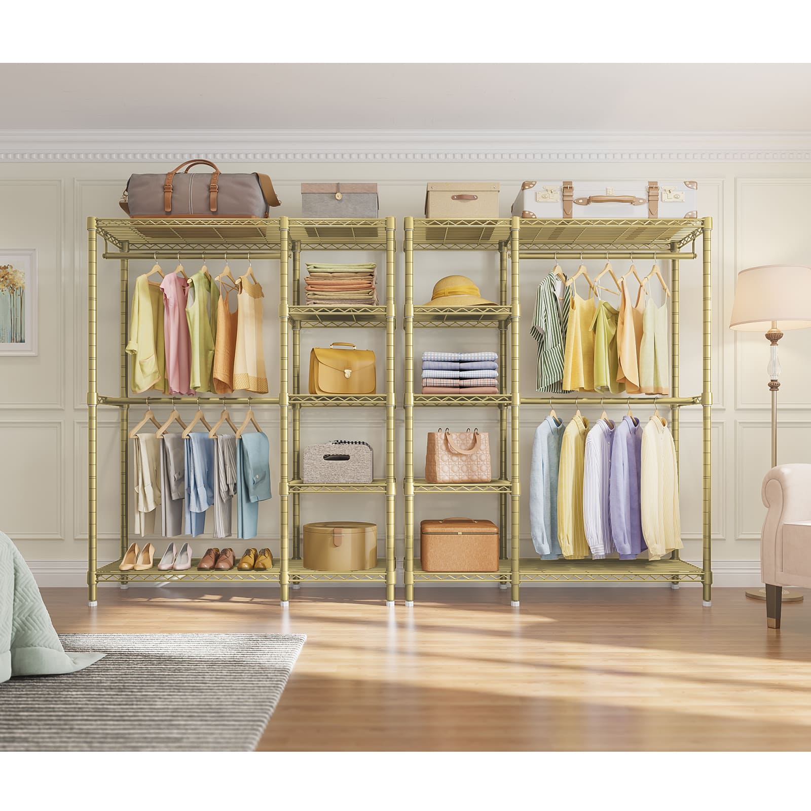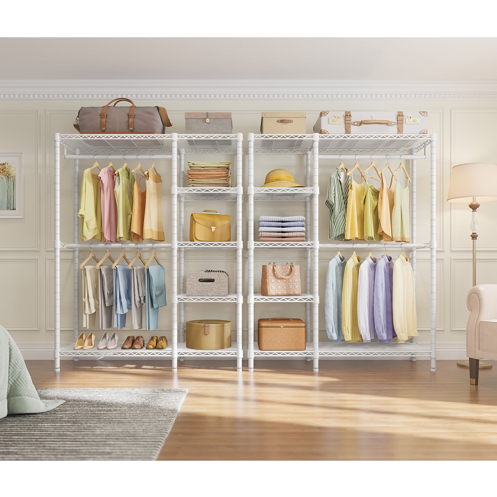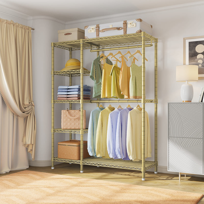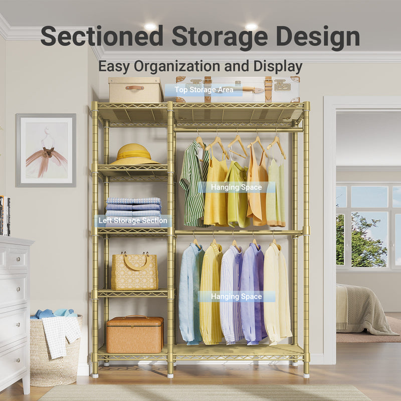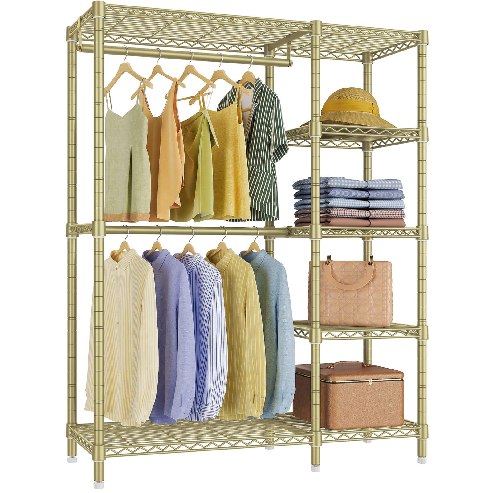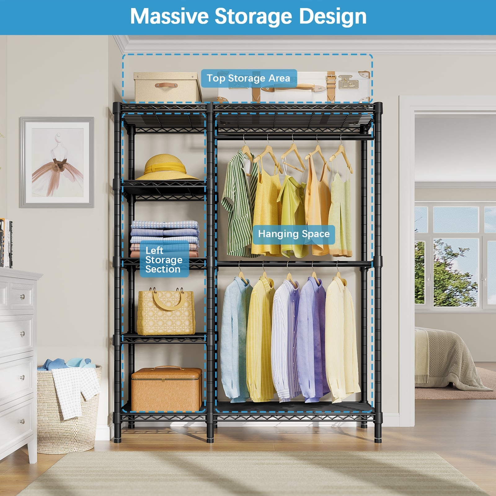 - 【Well-Organized Garment Rack】Double hanging rod is for hanging dress, suits, shirts, pants without wrinkle. And 5 tiers storage shelves provide enough place for handbag, hat, fold clothes, storage box, bedding. Say goodbye to messy!