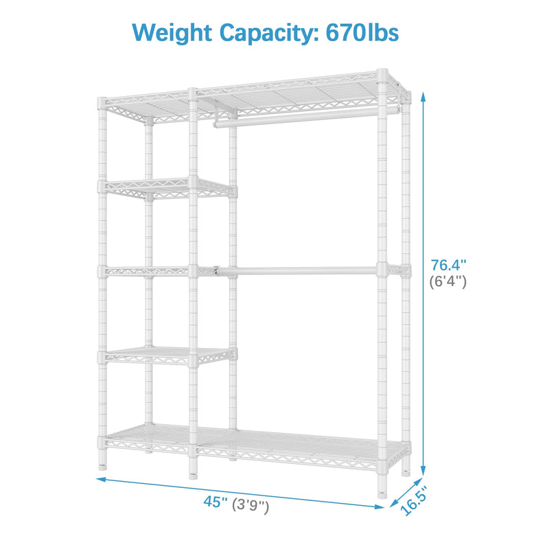 - 【Dimension & Load Capacity】VIPEK V7 closet system is with dimension 45"Lx16.5"Wx76.4"H,max load 670 lbs. Besides, single hanging rod hold up to 90lbs and single wire shelf 88lbs. Maximize your storage space.