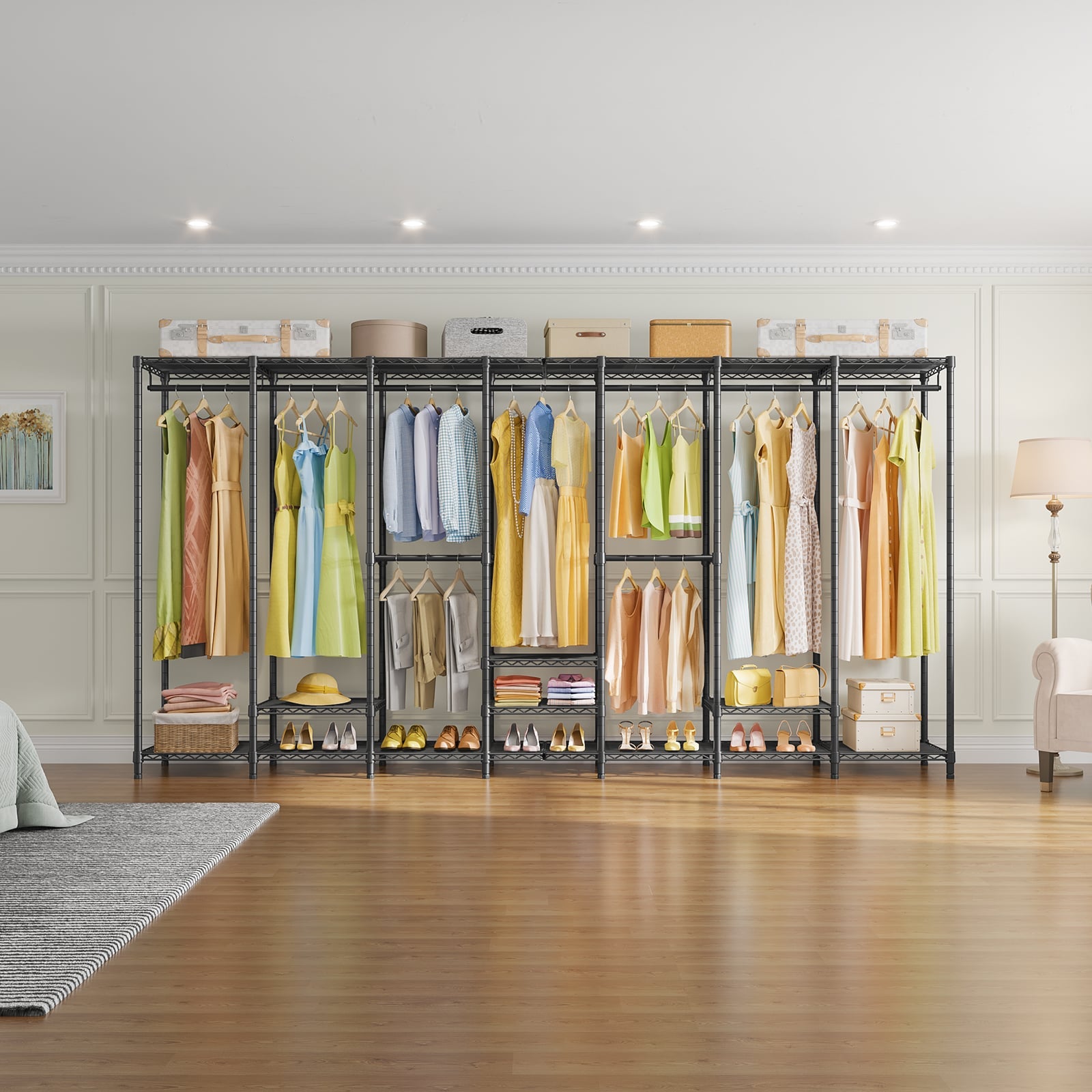 - SPACIOUS DESIGN: This clothes rack provides ample space for all your clothing storage needs. Dimensions & Load Capacity : 130.6" L x 15.7" W x 76.4" H. Max Load capacity 1670 lbs.