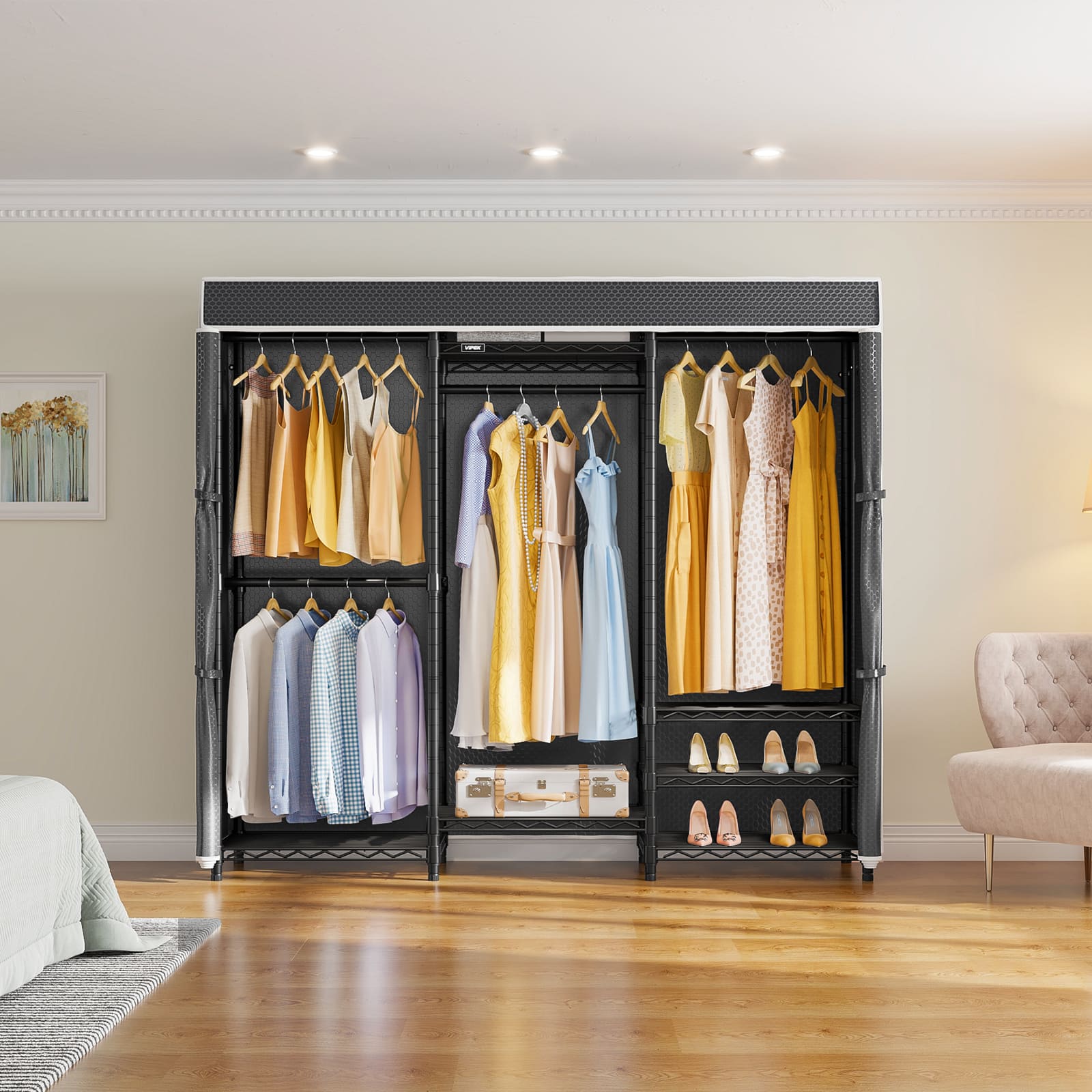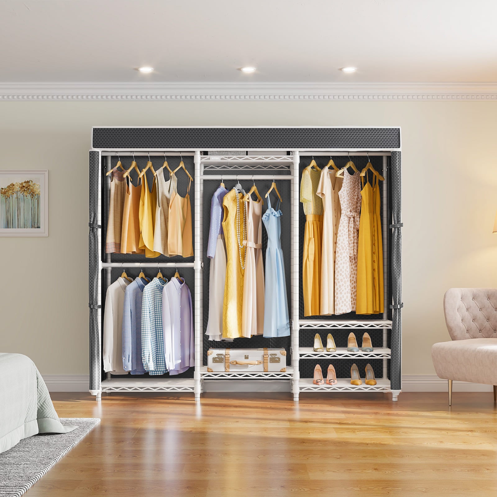 • Zippered Dustproof Cover: Smooth nylon zipper start from top to the bottom and strap fix the parted curtains on both sides, which makes clothes easy to take out and hang in. You can zipper your racks closed to keep your private space if you have visiting guests. it's especially good for off-season storage and for anything white or other pricier garments.