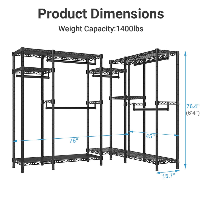 - Dimensions & Load Capacity: 76"L x 45"W x 76.4"H, Depth: 15.7". This heavy-duty wardrobe is made of high quality carbon steel, it features stable and sturdy. Load capacity up to 1400 lbs.