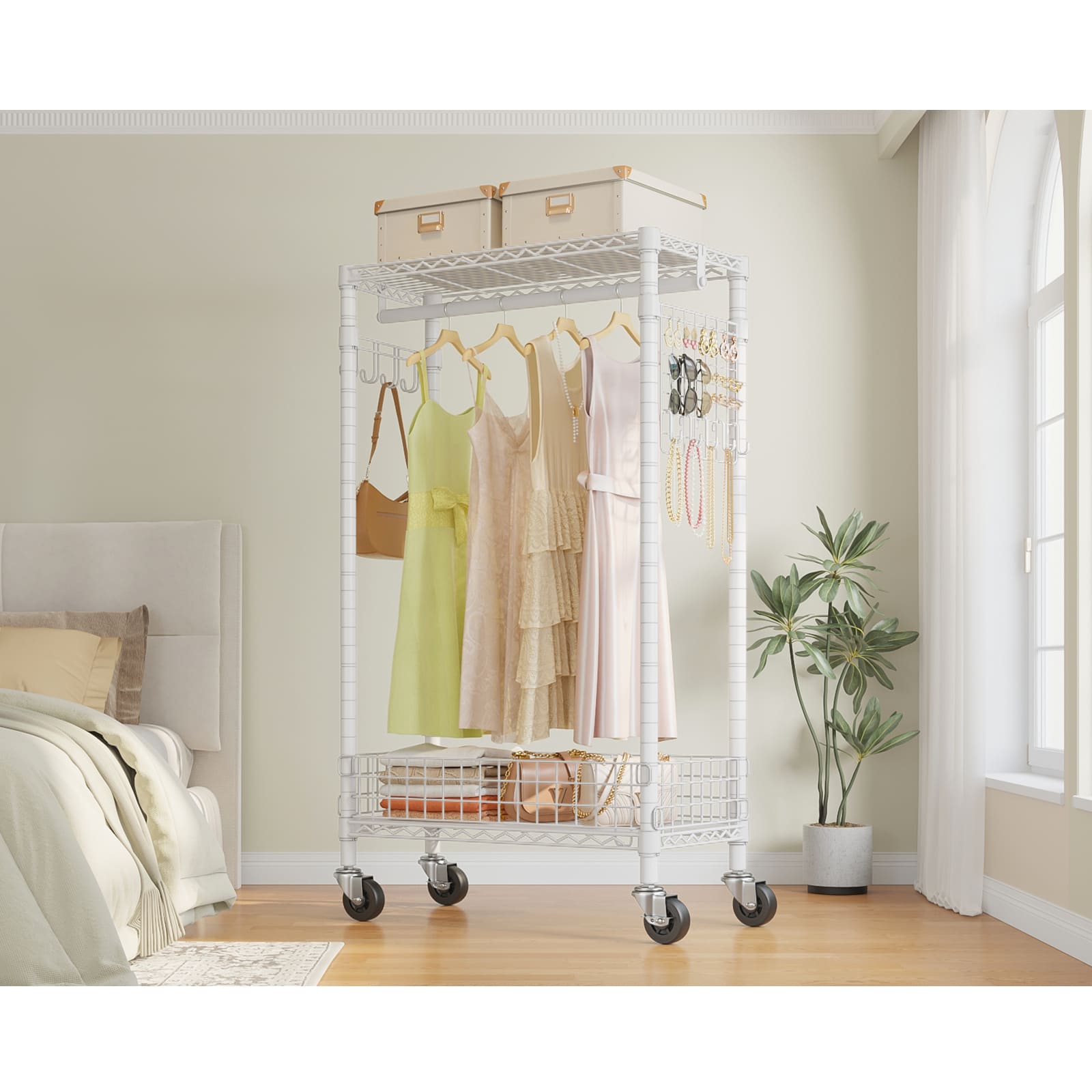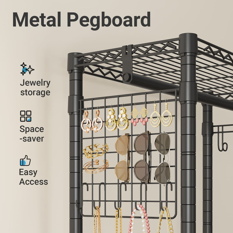 VIPEK R1 is a versatile clothes rack designed to simplify and organize your home effortlessly. Featuring a pegboard with 5 hooks, it keeps earrings, necklaces, and bracelets visible and accessible. Its removable laundry basket holds clothes, towels, or pet toys, while 360° silent lockable wheels make moving it smooth and easy. Combining style, convenience, and durability, VIPEK R1 is perfect for keeping your space neat and organized.
