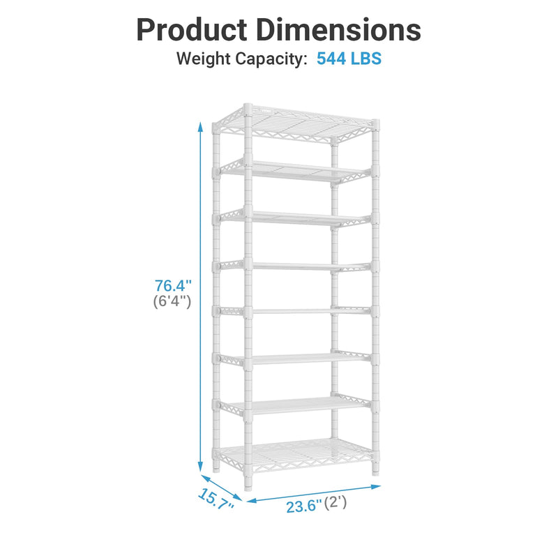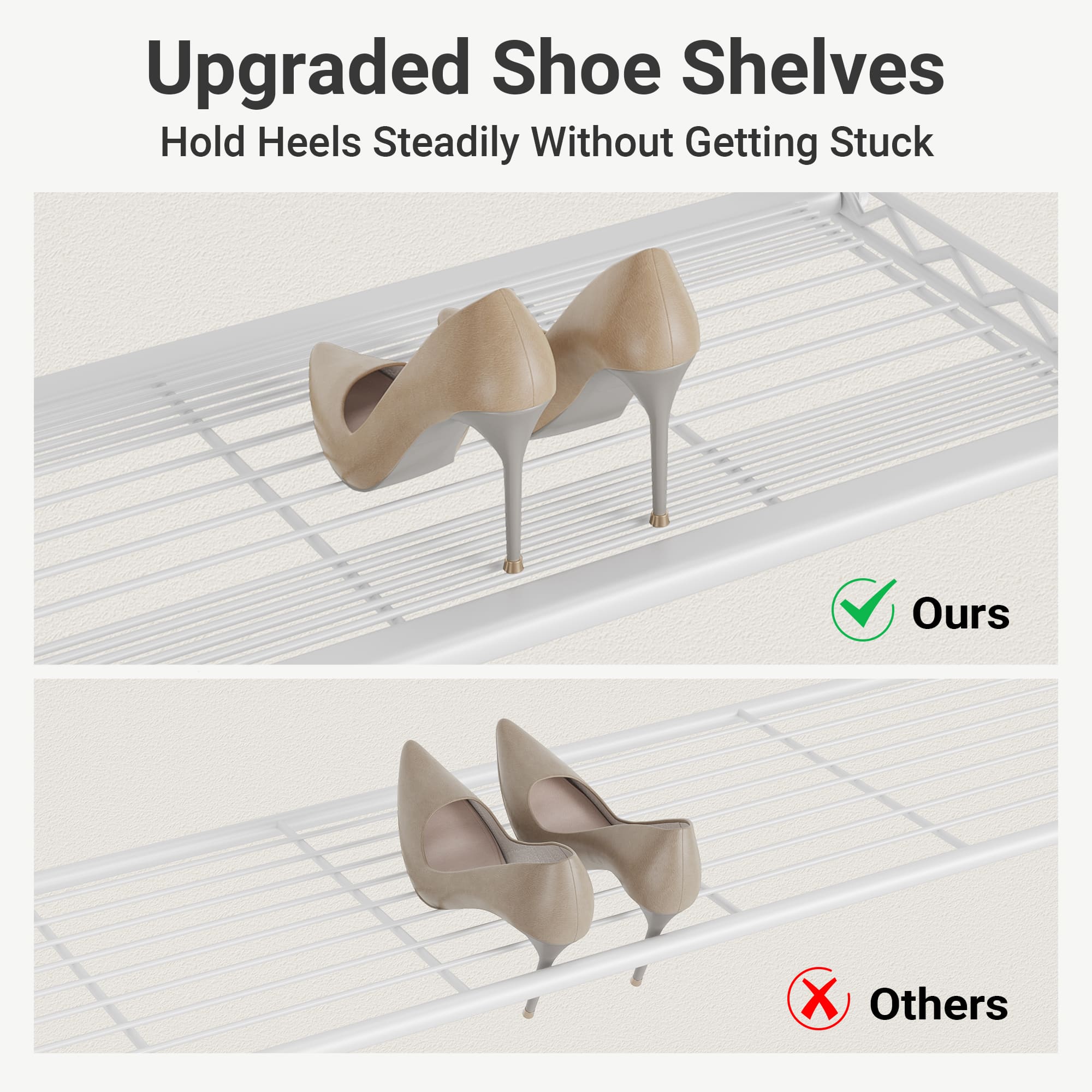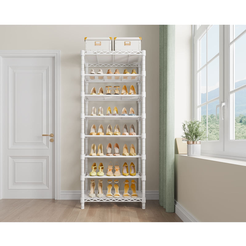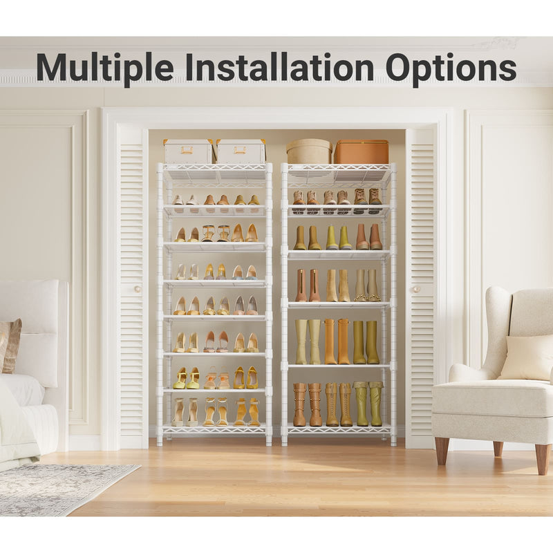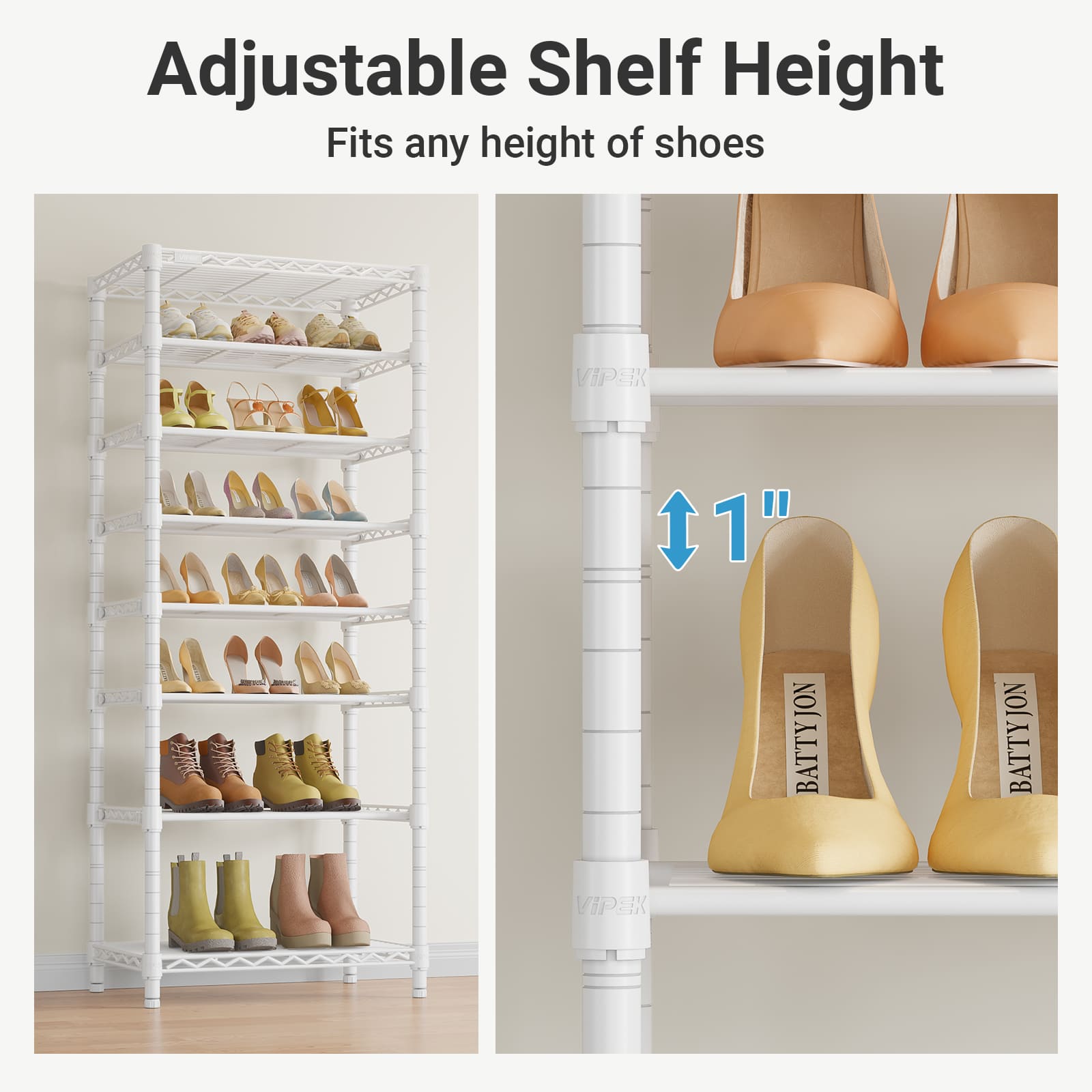 - CUSTOMIZABLE STORAGE: It comes with 8 tiers for flexible storage of various items. Extra front and back wires on the shoe shelves prevent heel slipping. Detachable shoe shelves, you can remove one tier to make extra space for boots, higher shoes, you can also split into shoe racks 2 units