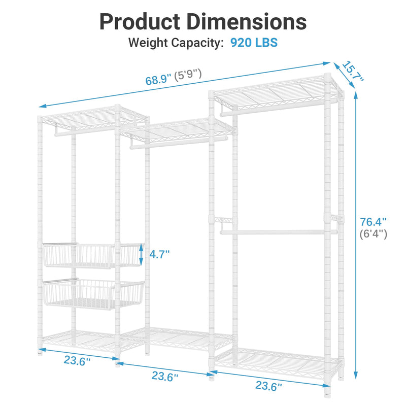 - STURDY & RELIABLE CLOSET ORGANIZER: Made of high quality iron, it features stable, sturdy and reliable freestanding closet system. Each hanging rod can support up to 75 lbs. Easy access in bedroom, cloakroom, clothing store, laundry room, walk-in closet and more.