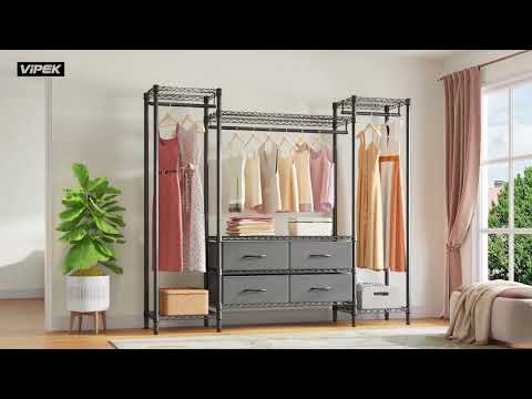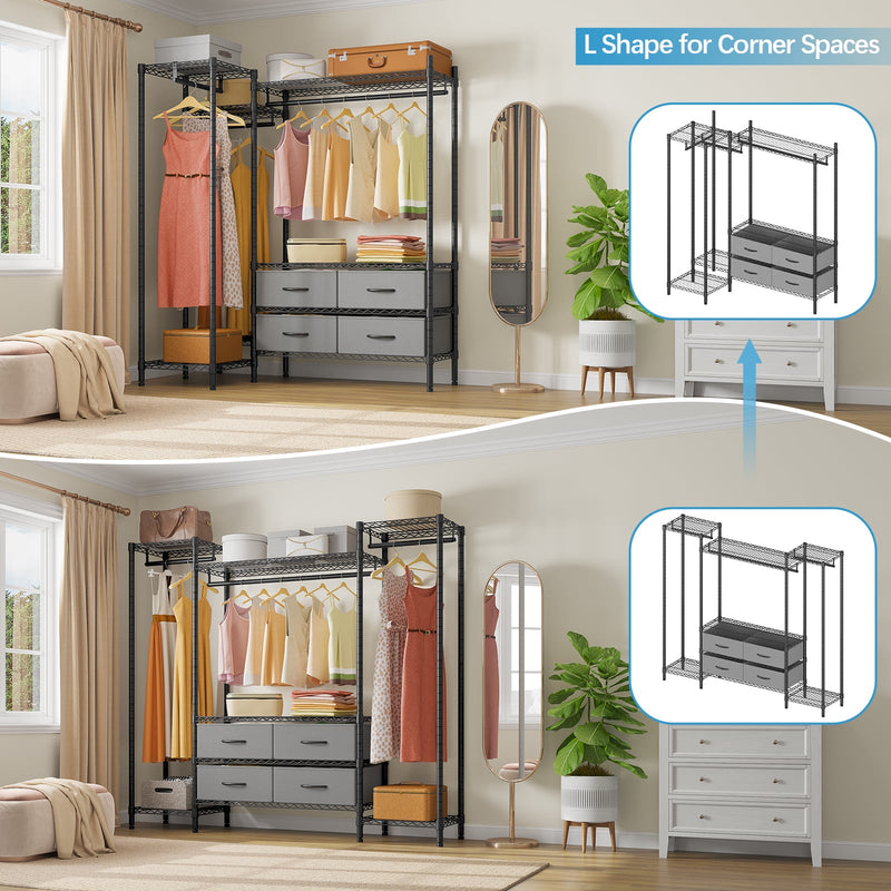 - All-in-one Multifunction Closet Rack: 6 Tiers Garment Rack V20 with compact design offers you various storage area to place your clothes, accessories, shoes, etc. It features 6 height adjustable shelves for extra storage capacity, 3 detachable hanging bars that easily accommodates to the length and size of your garments and 4 fabric drawers with wooden handles which makes it easy to grab and pull from shelves.