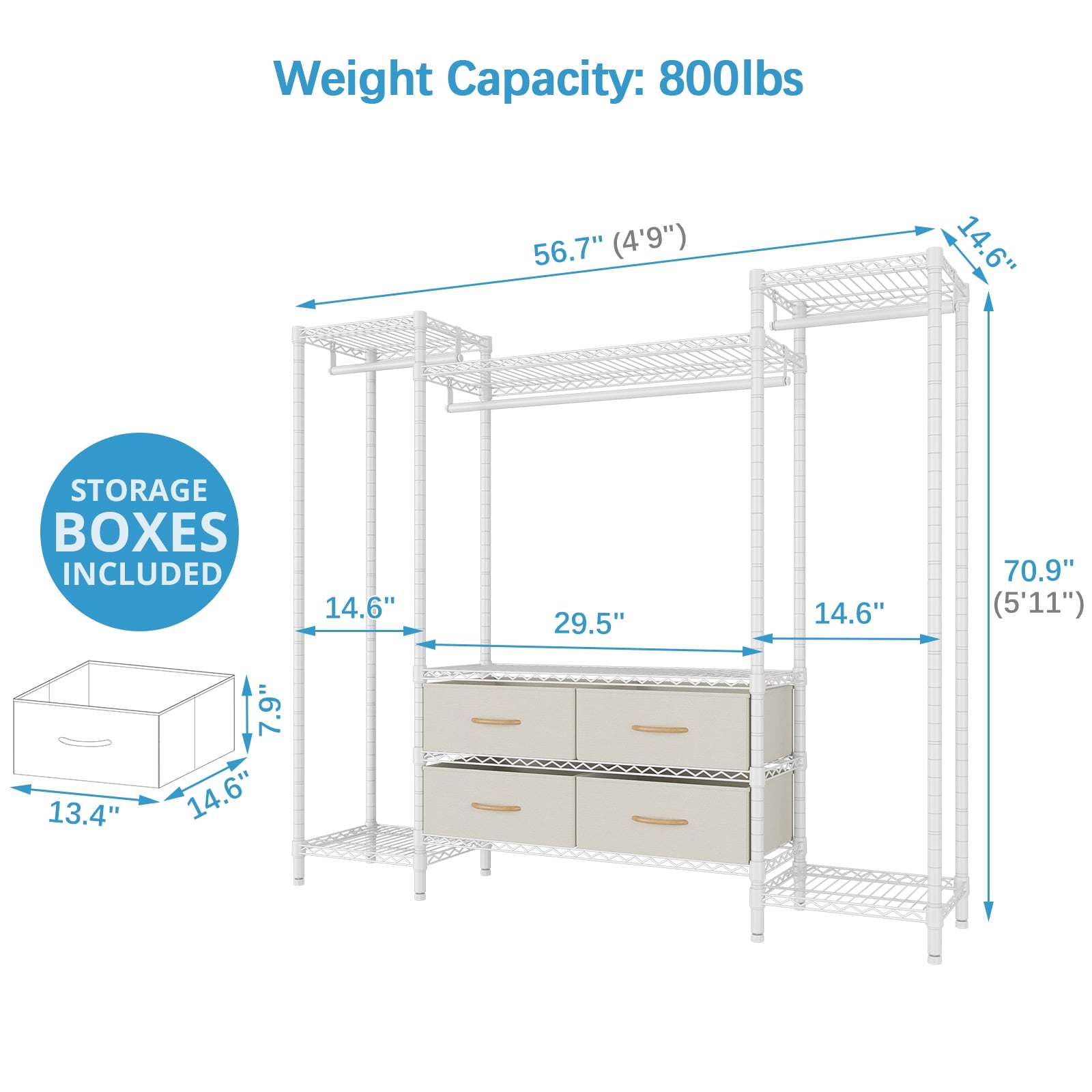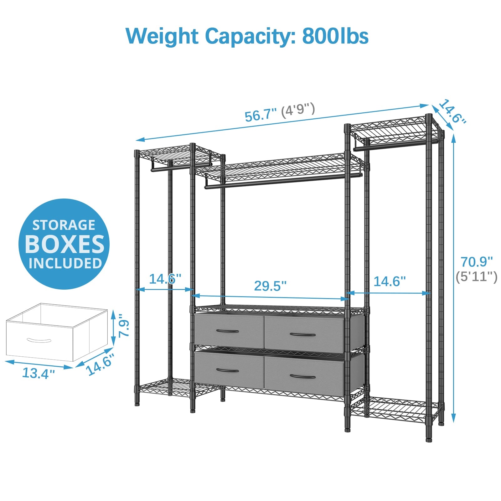- Dimensions & Load capacity : 56.7" L x 14.6" W x 70.9" H. Load capacity up to 800 lbs. Single hanging rod can support up to 75 lbs, Wire shelf can support up to 88 lbs for each.