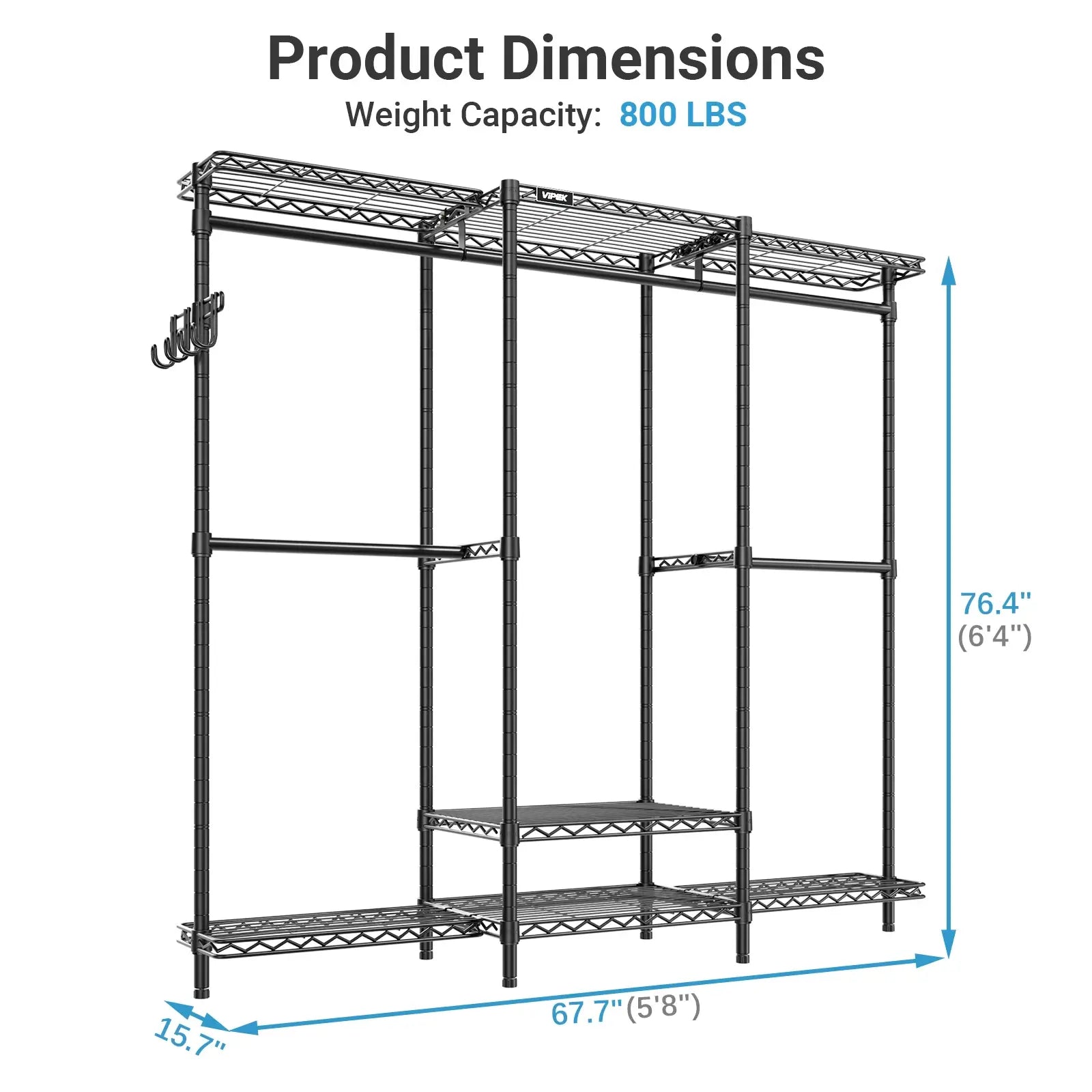 - Dimensions & Load Capacity: 67.7" W x 15.7" D x 76.4" H, maximum load capacity 800 lbs. This Clothing Rack adopted efficient structure, yet still delivering outstanding load-bearing capacity and stability