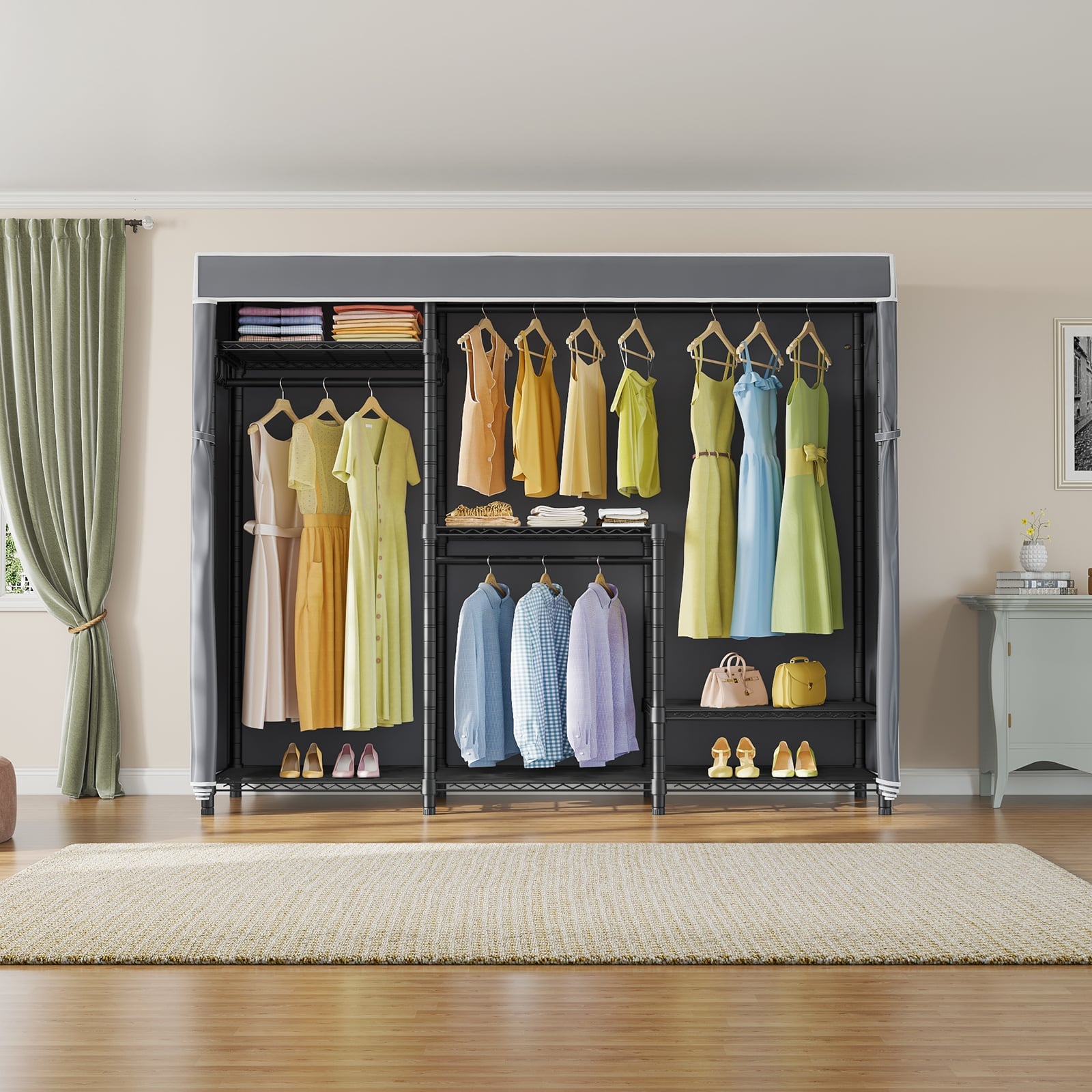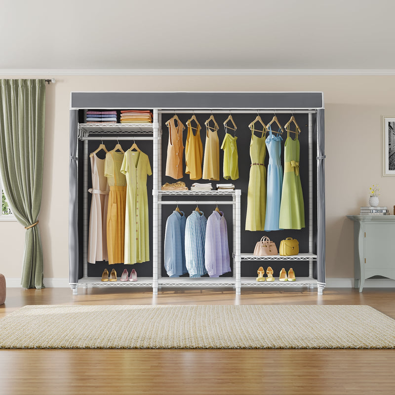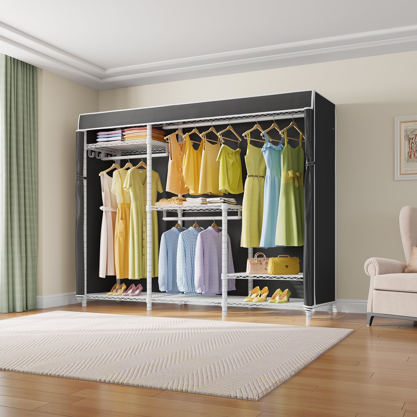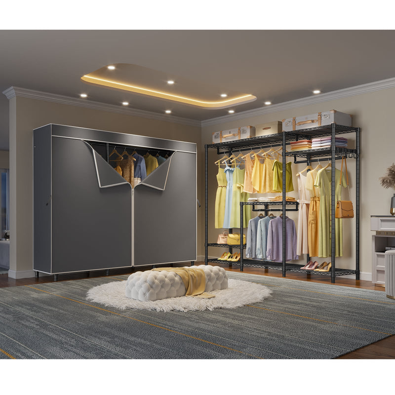 - PROTECTIVE FABRIC COVER: The included fabric cover provides a stylish and protective barrier for your clothes. It keeps them dust-free, protected from moisture, and offers privacy while maintaining a neat appearance.