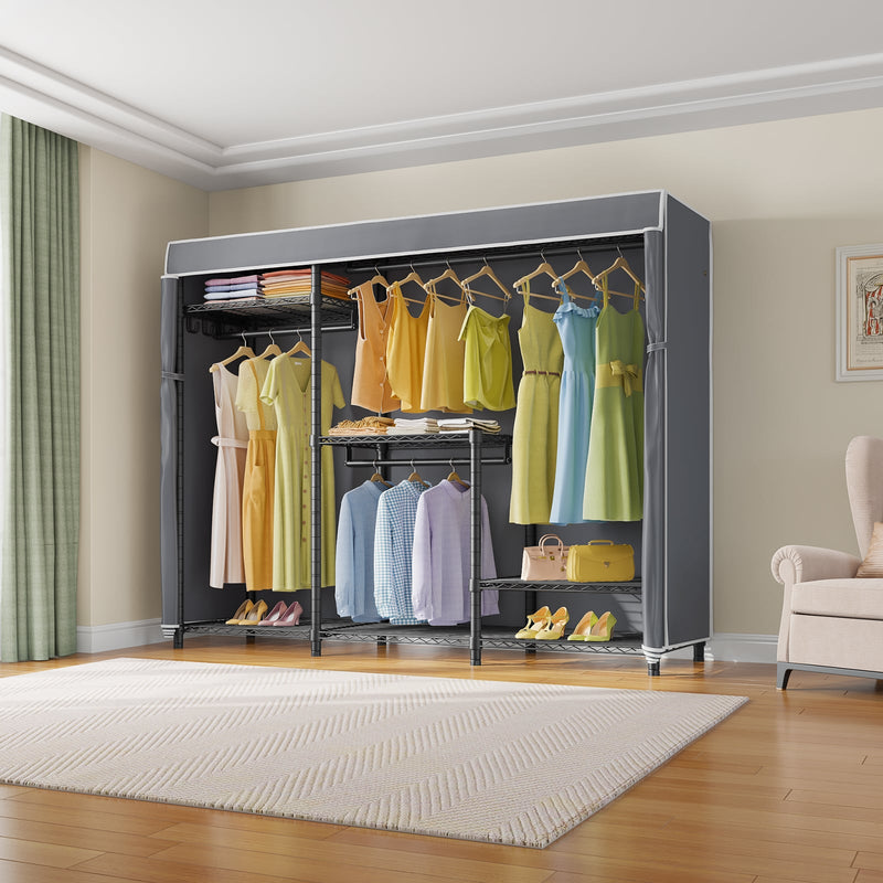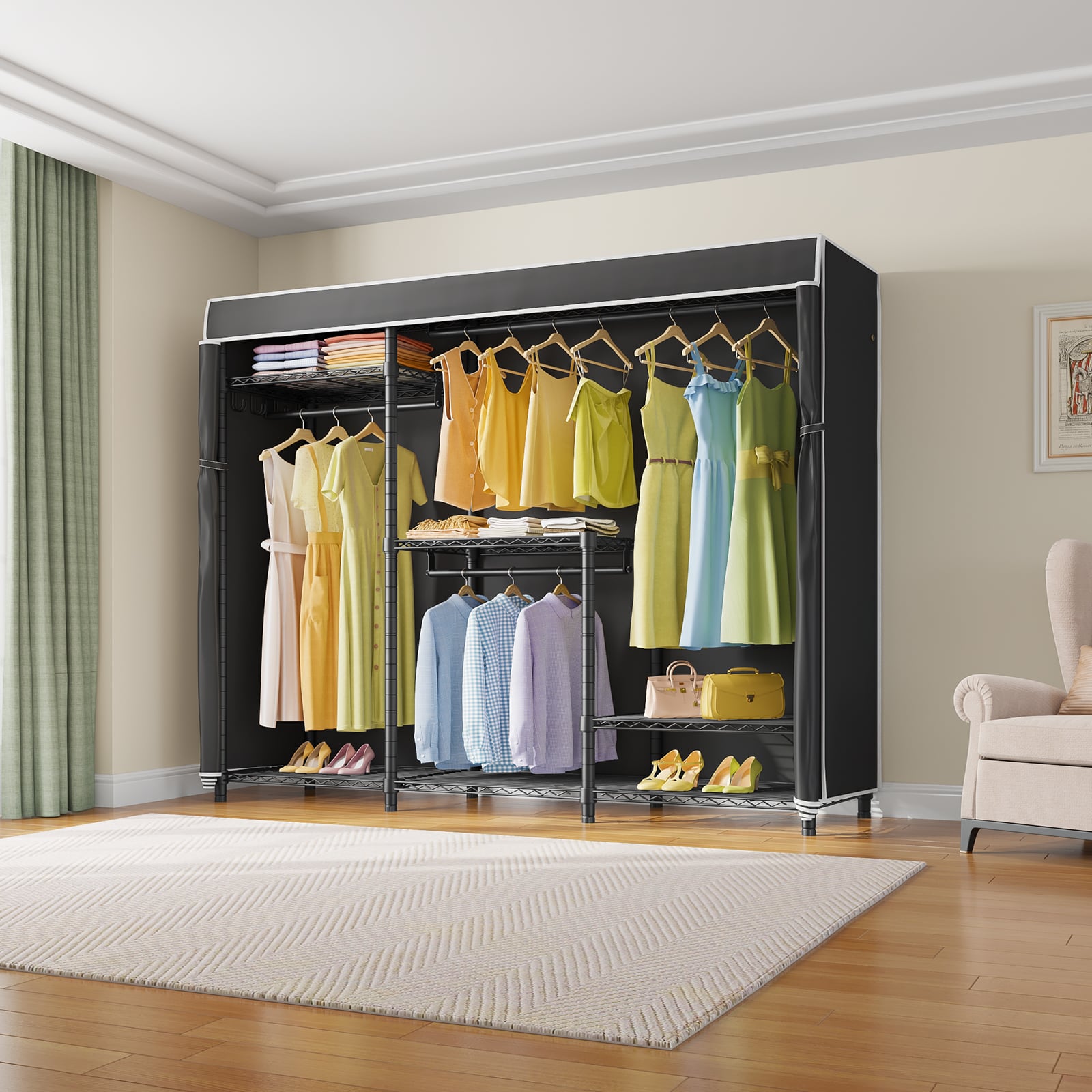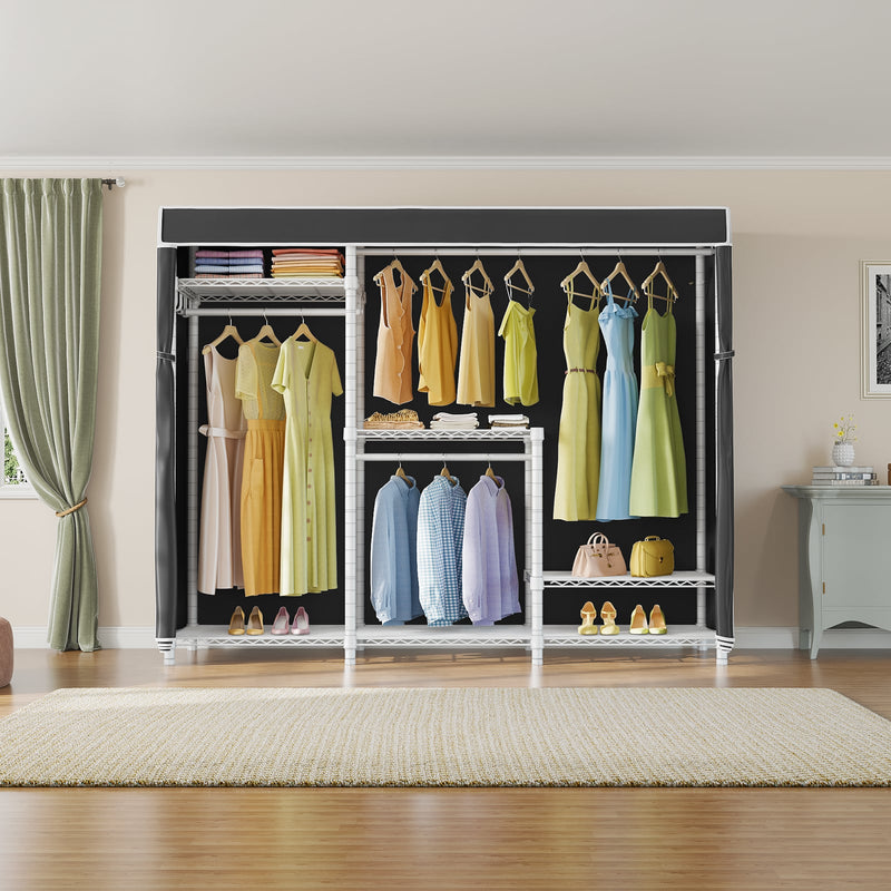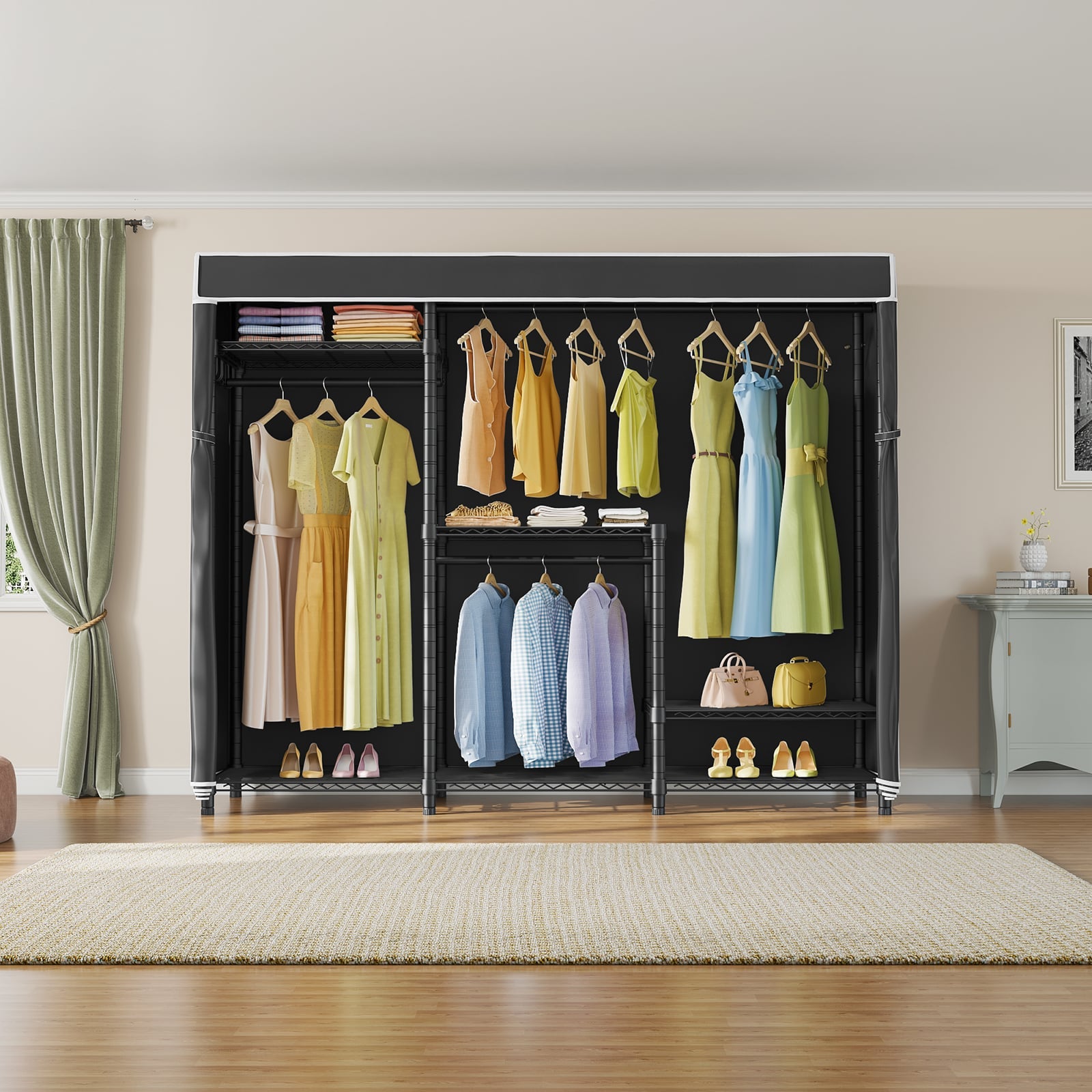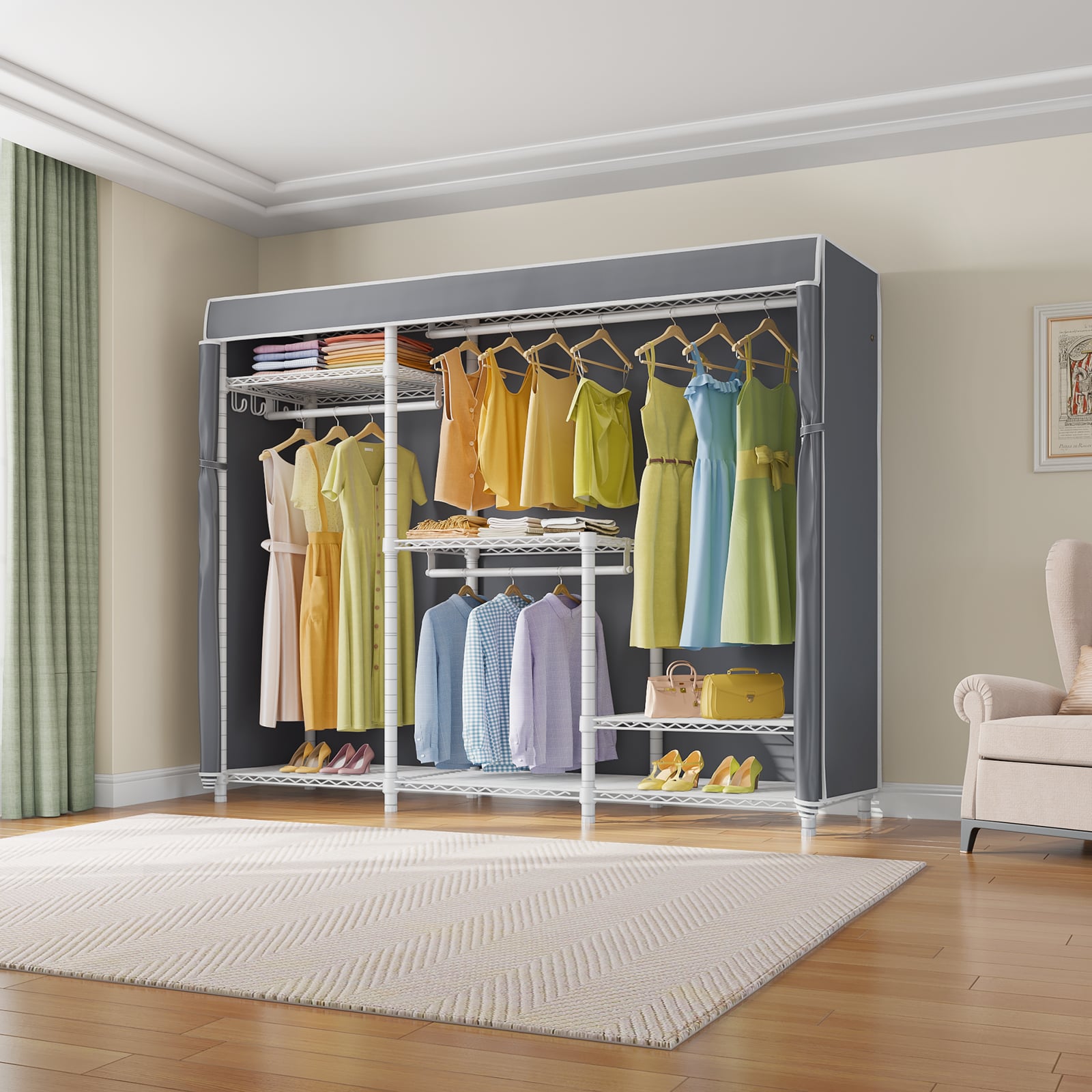 - PROTECTIVE FABRIC COVER: The included fabric cover provides a stylish and protective barrier for your clothes. It keeps them dust-free, protected from moisture, and offers privacy while maintaining a neat appearance.