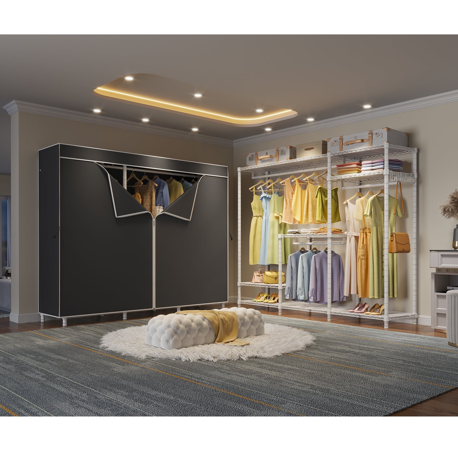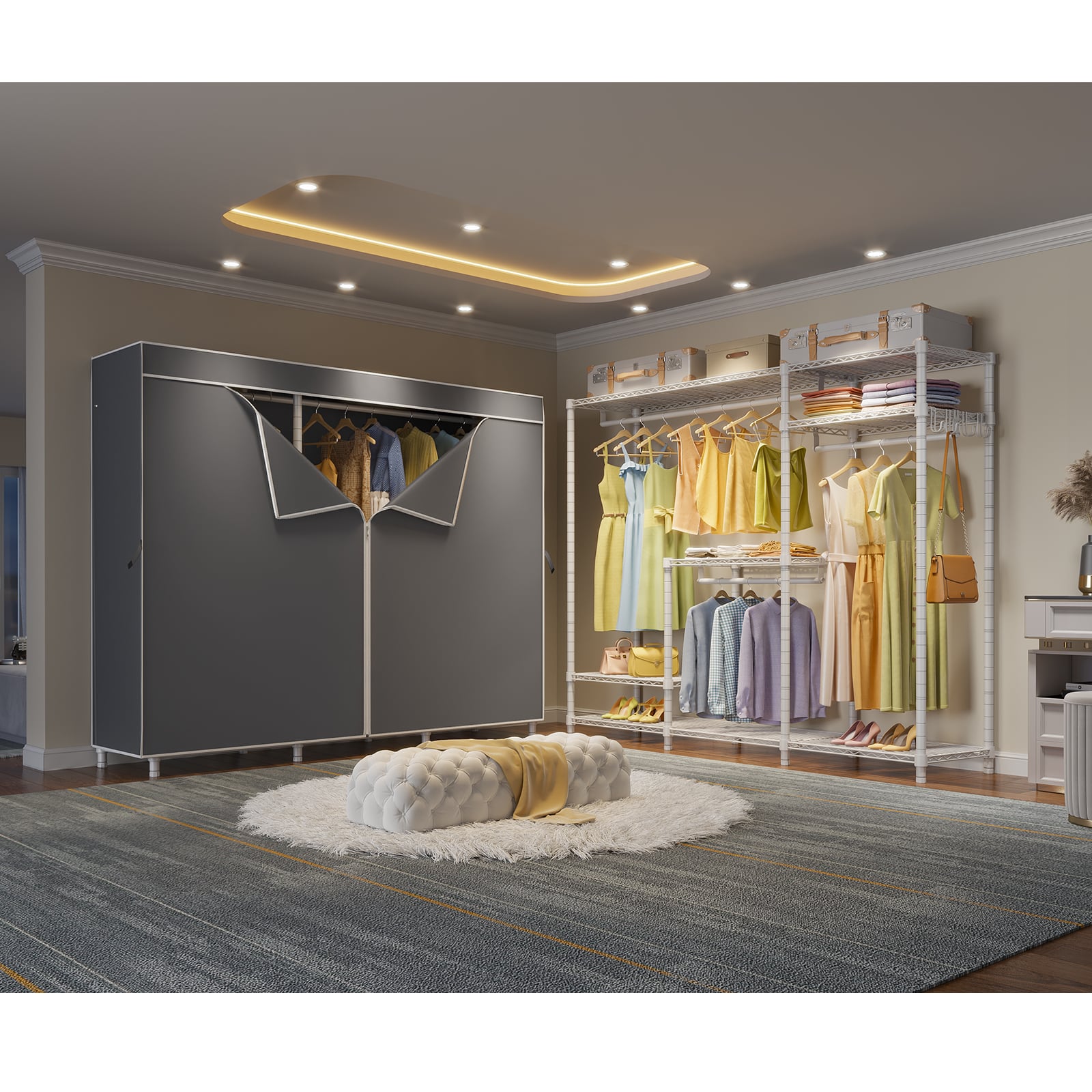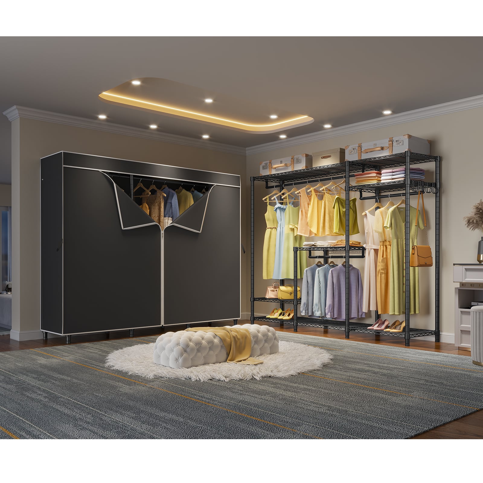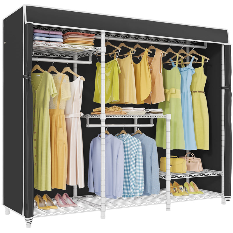 - PROTECTIVE FABRIC COVER: The included fabric cover provides a stylish and protective barrier for your clothes. It keeps them dust-free, protected from moisture, and offers privacy while maintaining a neat appearance.