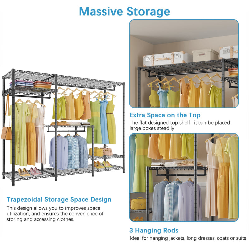 - SPACIOUS DESIGN: This clothes rack provides ample space for all your clothing storage needs. Dimensions: 70.1"L x 17.3"W x 76.4"H, 950 lbs weight capacity.