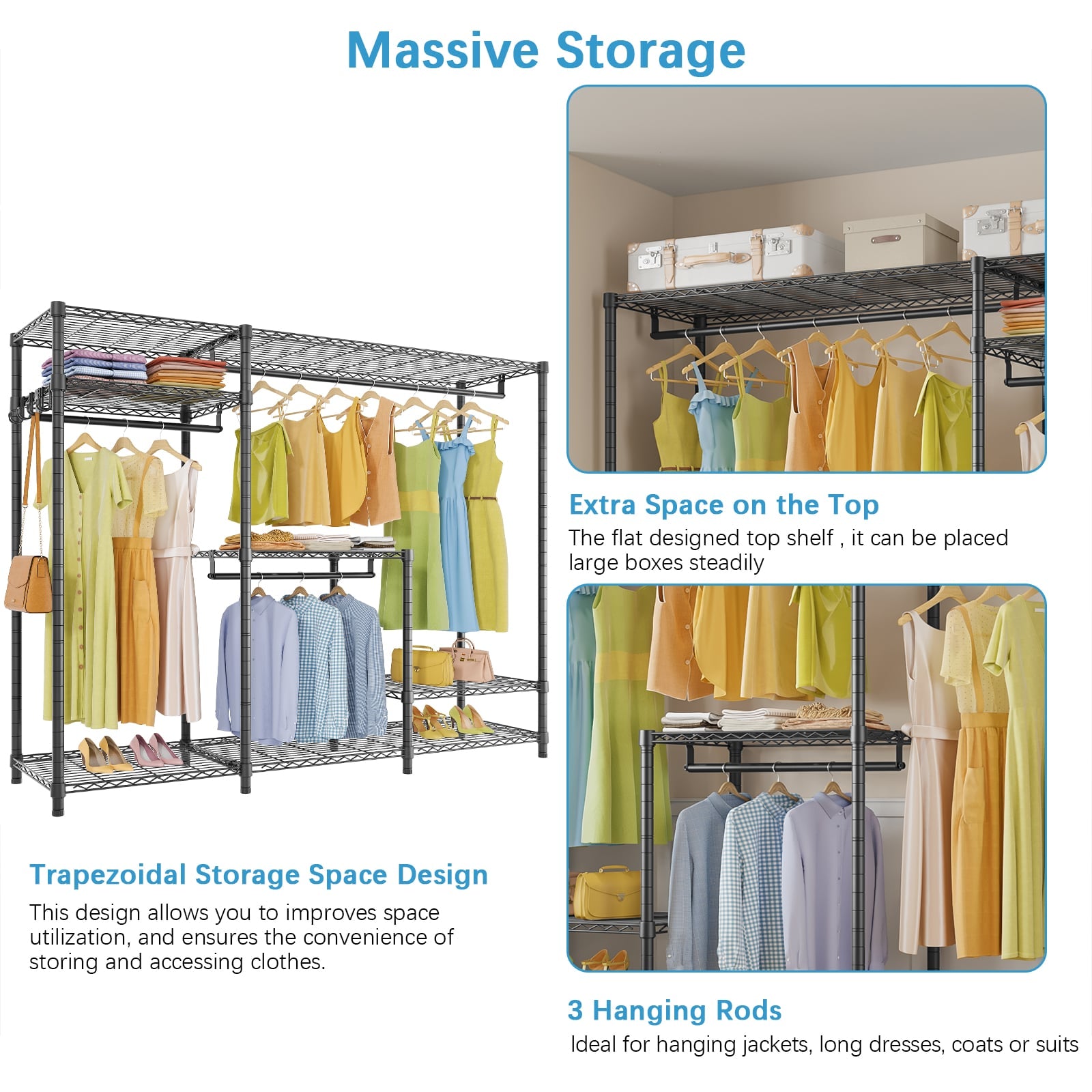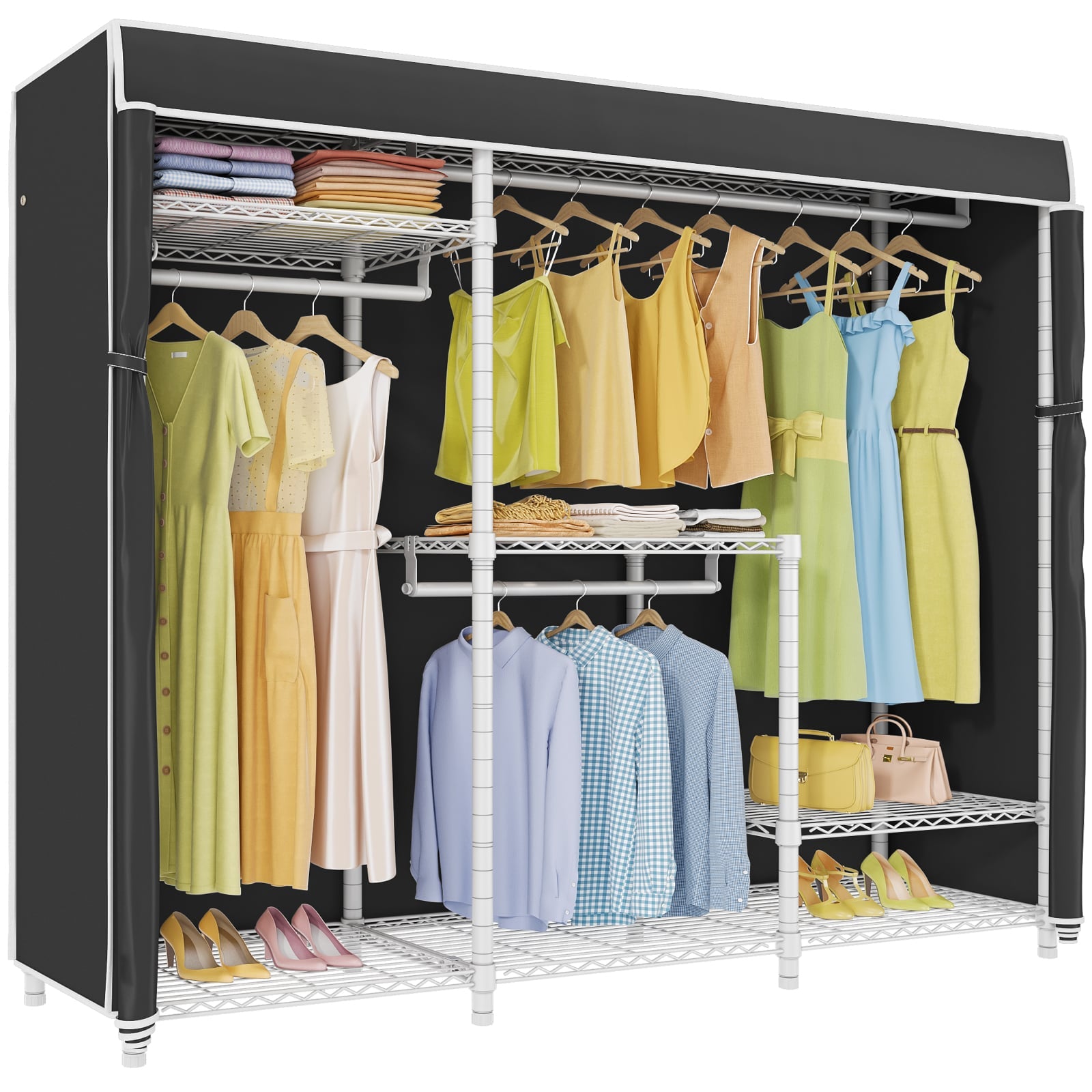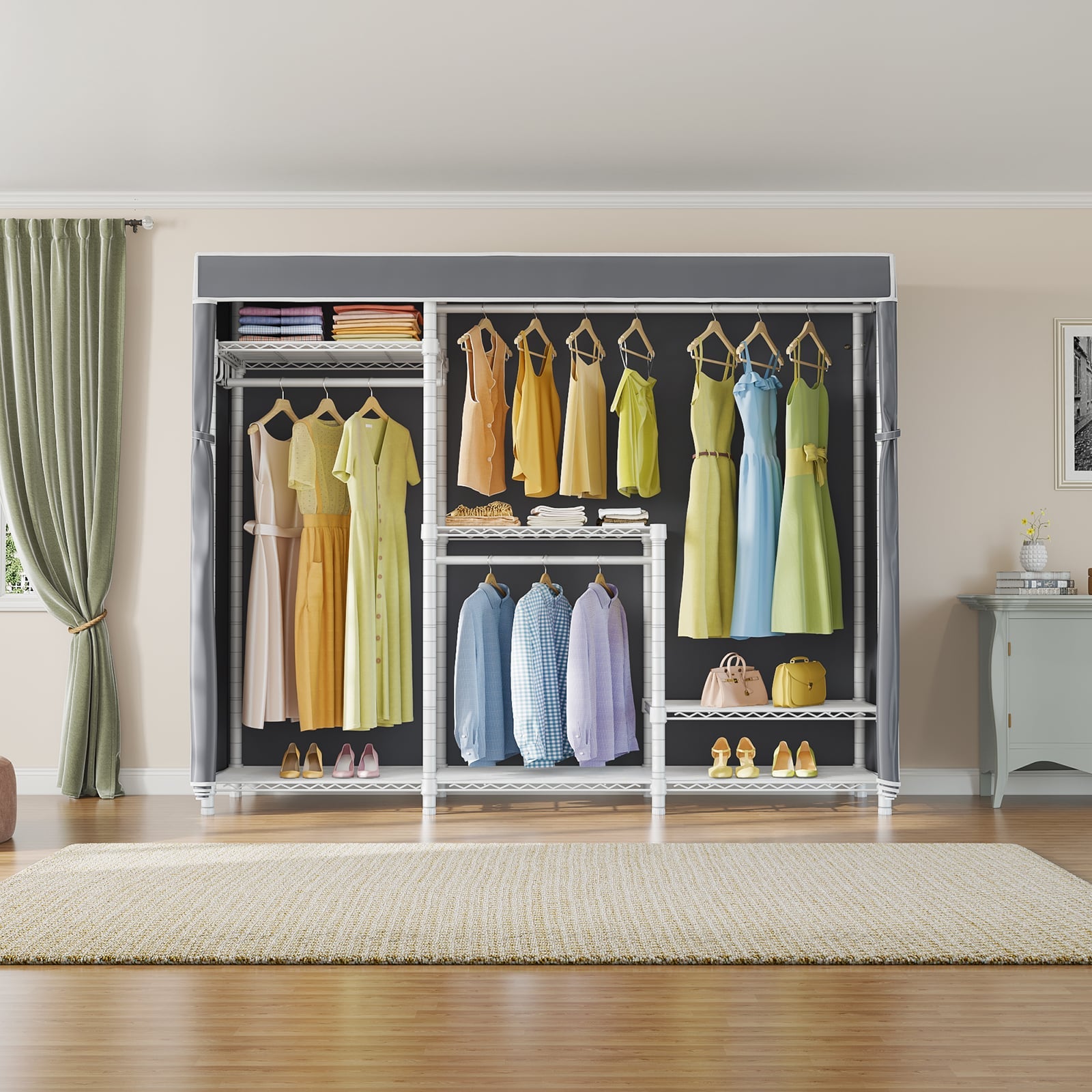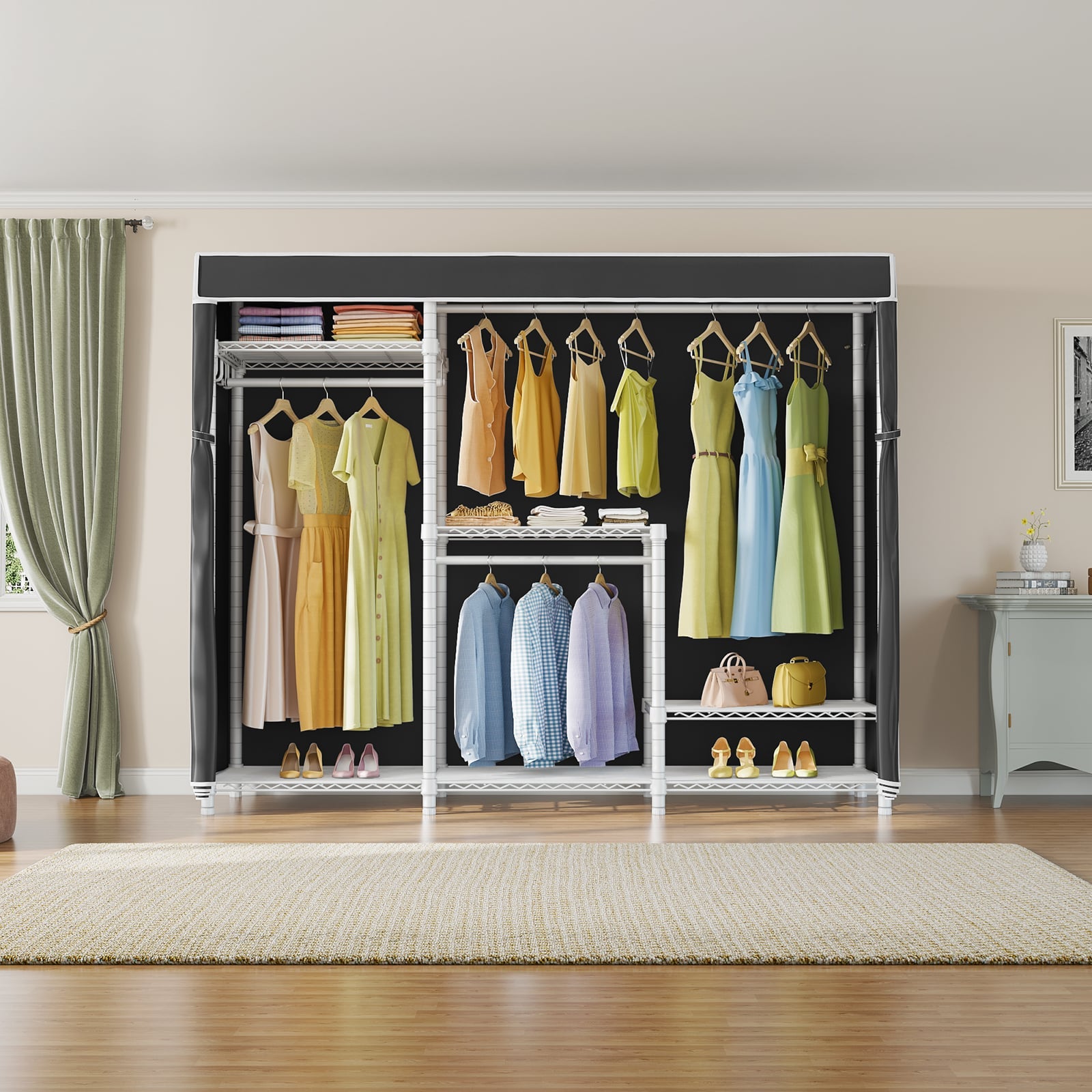 - ADJUSTABLE SHELVES & HANG RODS : Customize the storage space according to your needs. The adjustable shelves allow you to create a personalized closet layout, accommodating different garment lengths, shoes, and accessories.