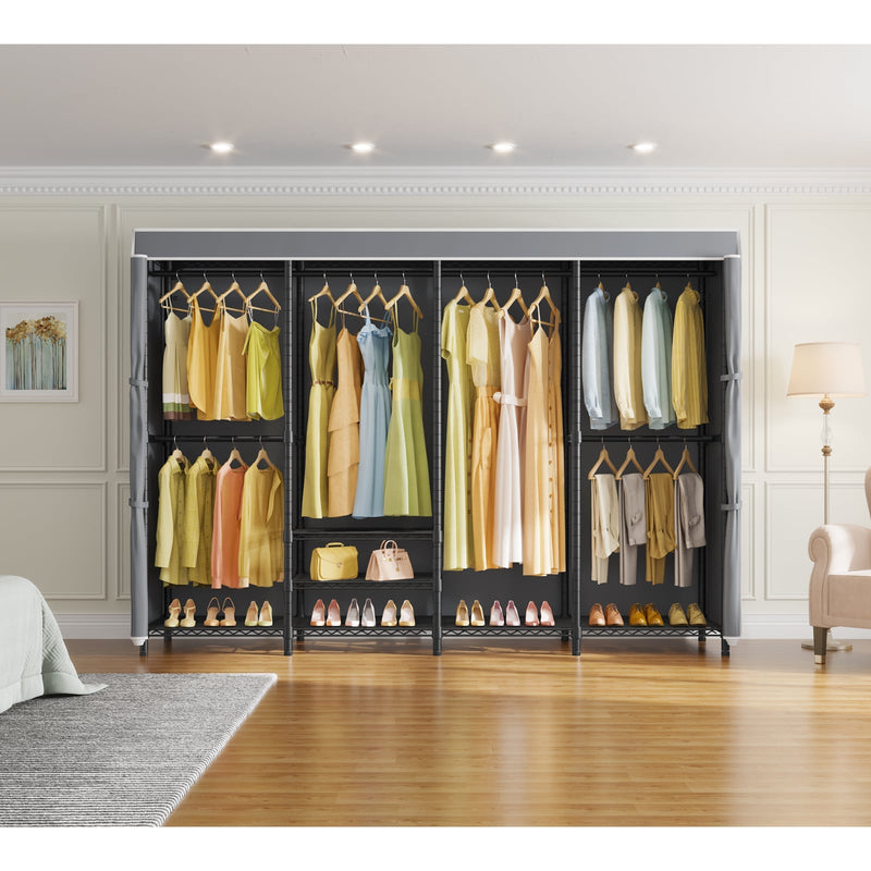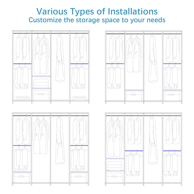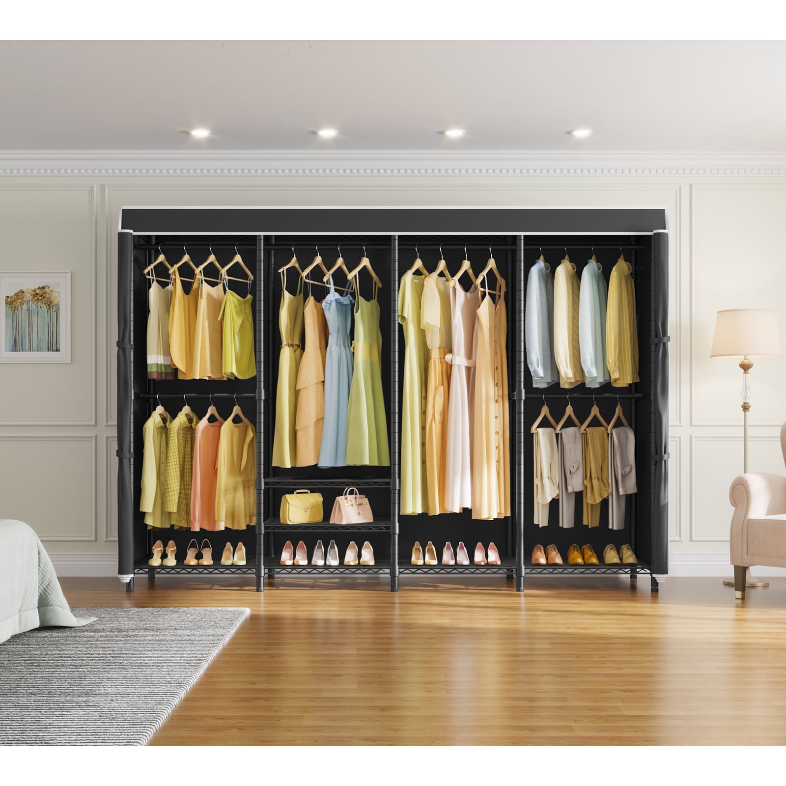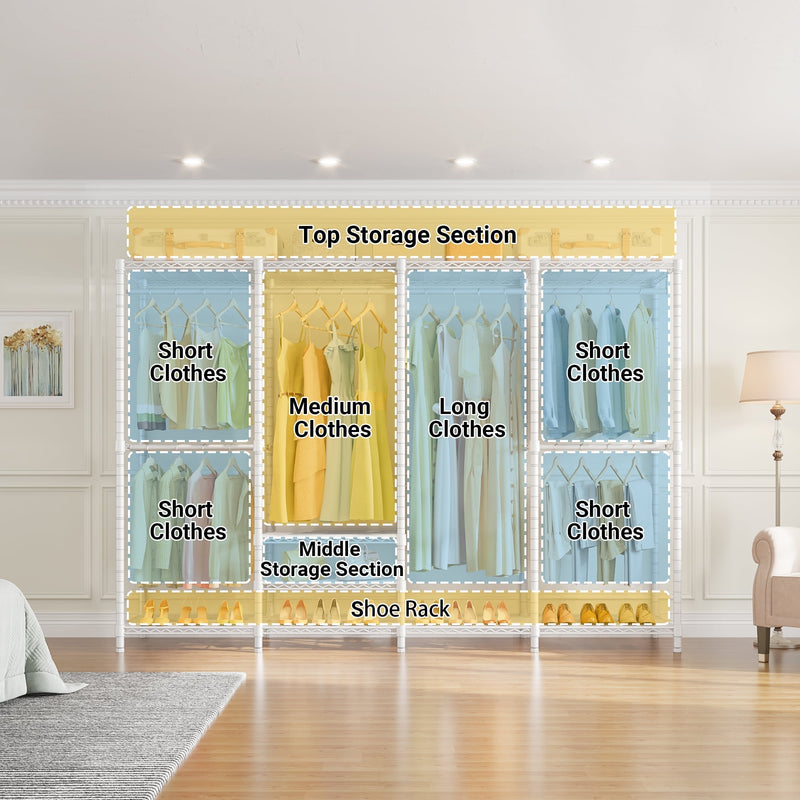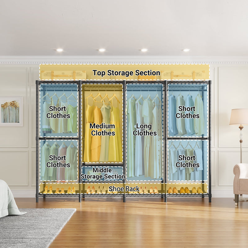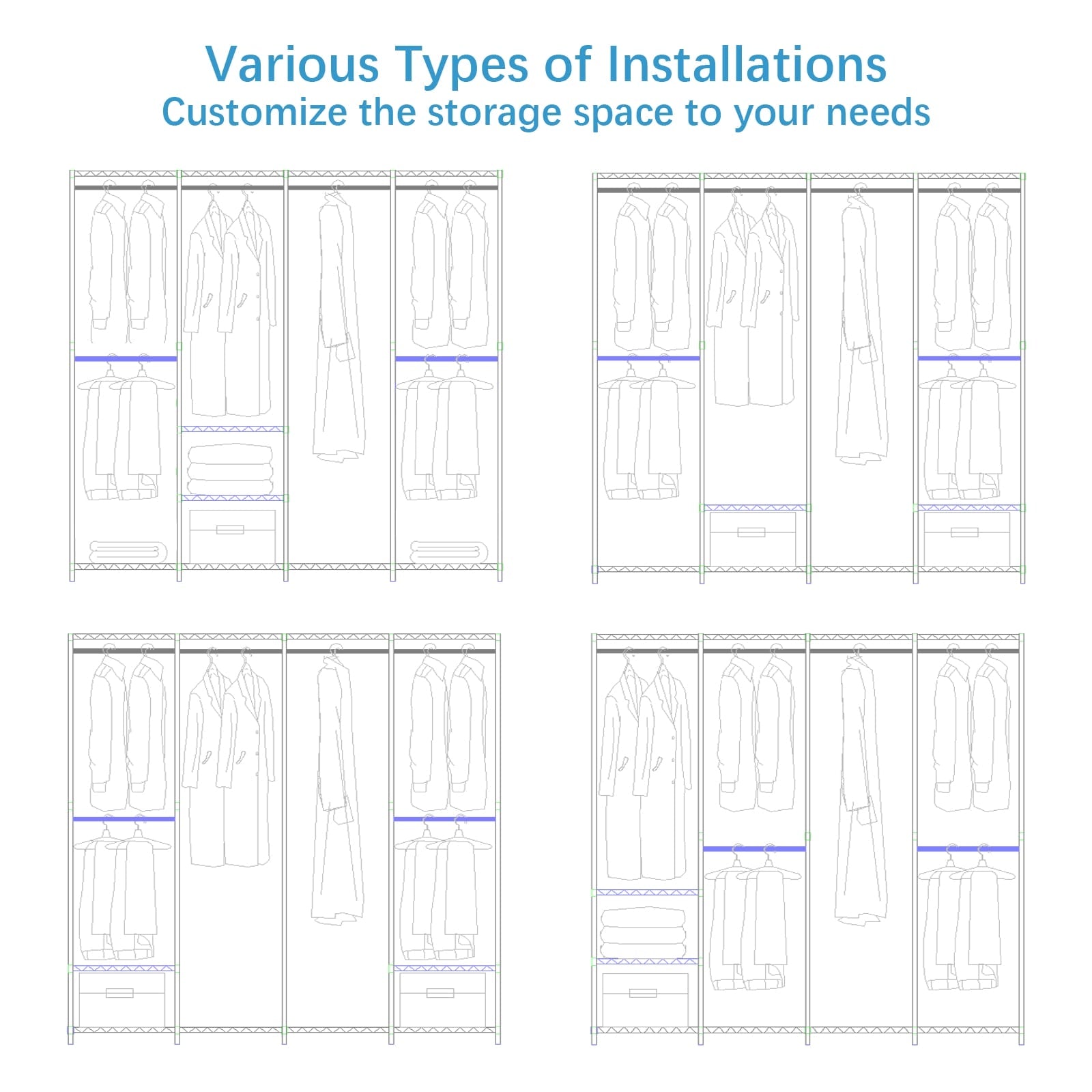 - All-in-one Multifunction Closet Rack: 4 Tiers Extra Large Wardrobe Closet V40 offers you various storage area to place your clothes, accessories, shoes, etc. It features 6 height adjustable shelves for extra storage capacity, 4 detachable hanging bars that easily accommodates to the length and size of your garments.