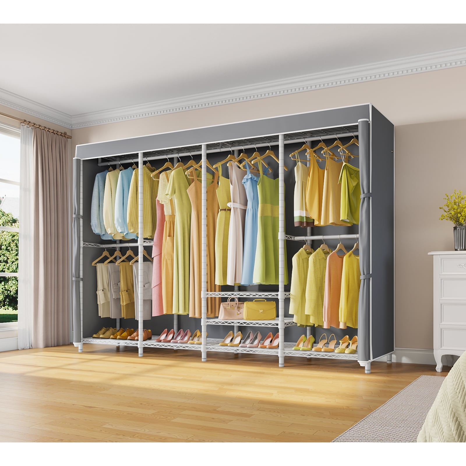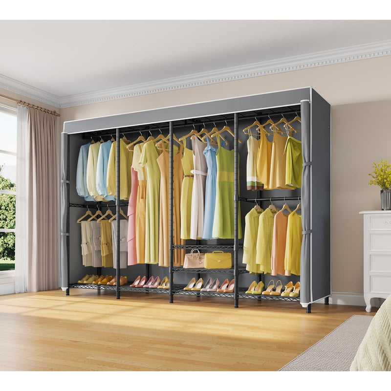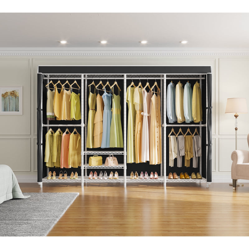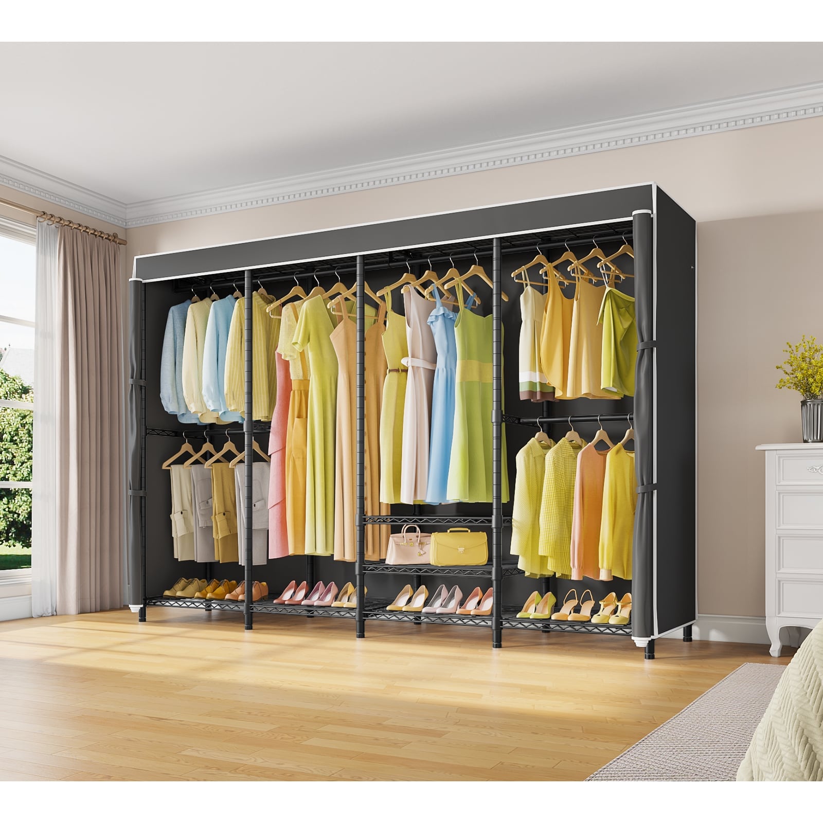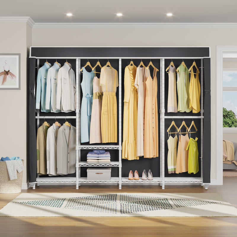 - All-in-one Multifunction Closet Rack: 4 Tiers Extra Large Wardrobe Closet V40 offers you various storage area to place your clothes, accessories, shoes, etc. It features 6 height adjustable shelves for extra storage capacity, 4 detachable hanging bars that easily accommodates to the length and size of your garments.