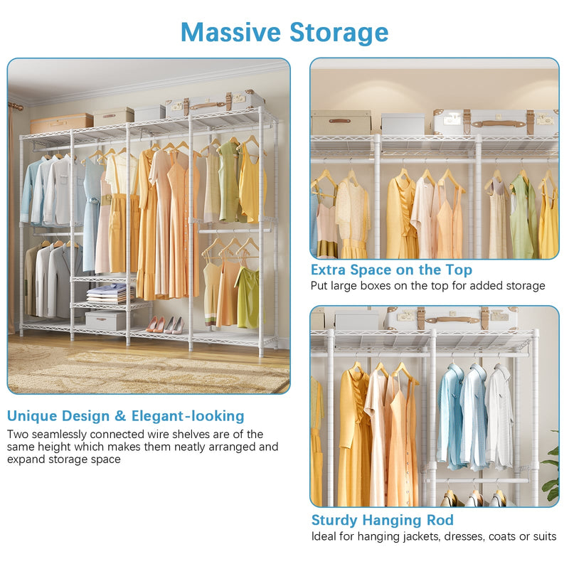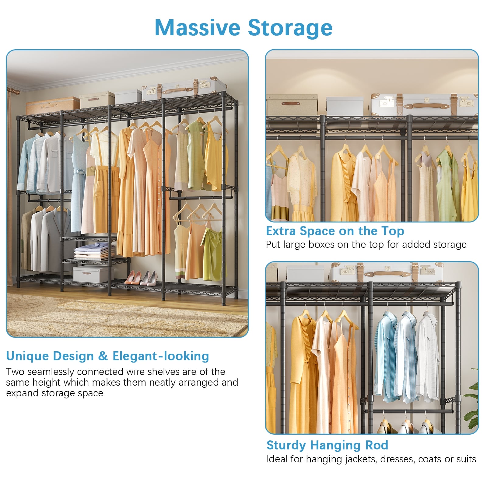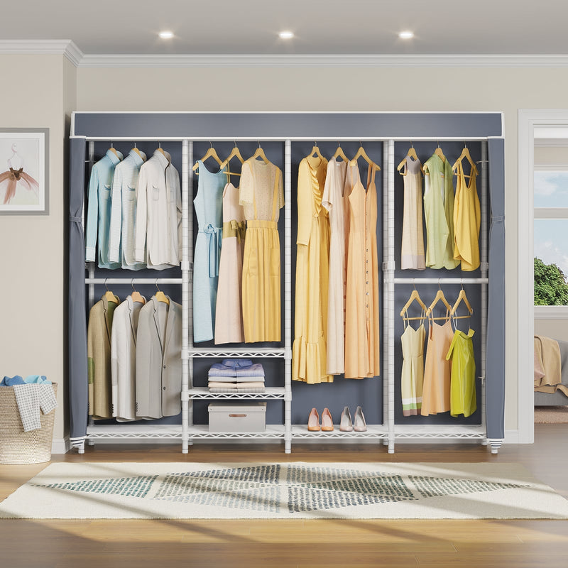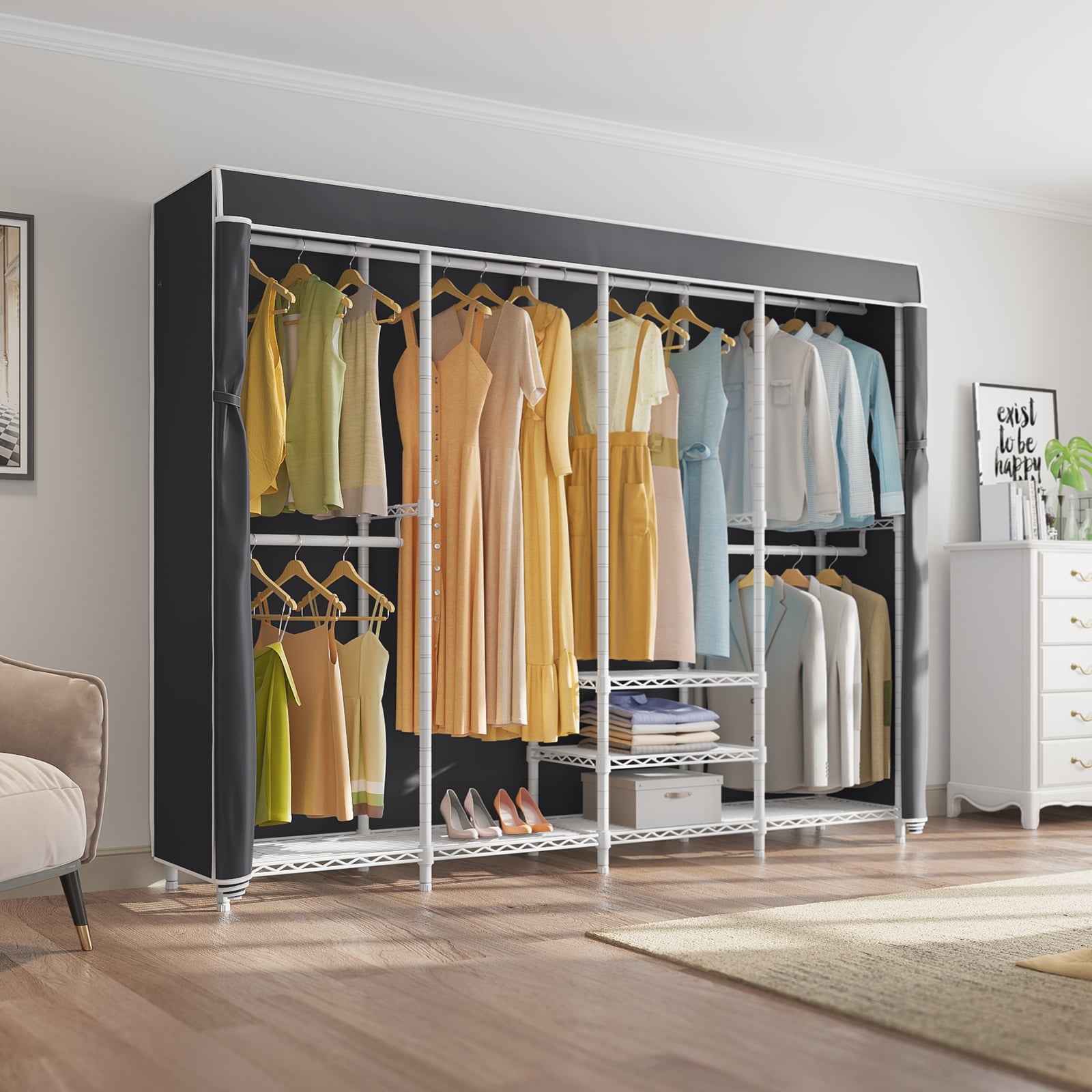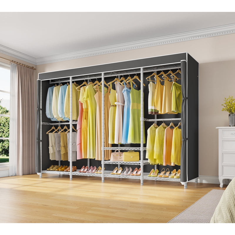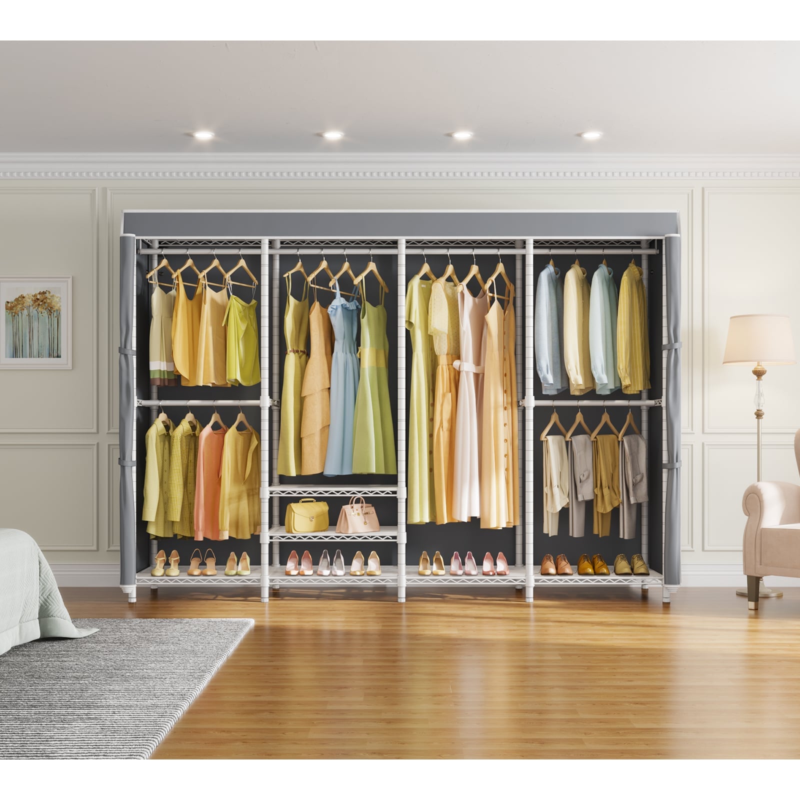 - All-in-one Multifunction Closet Rack: 4 Tiers Extra Large Wardrobe Closet V40 offers you various storage area to place your clothes, accessories, shoes, etc. It features 6 height adjustable shelves for extra storage capacity, 4 detachable hanging bars that easily accommodates to the length and size of your garments.