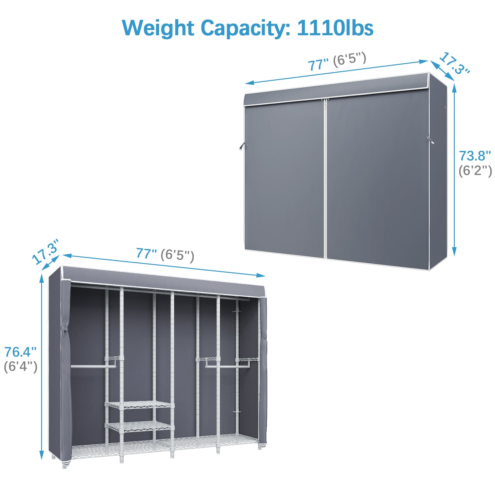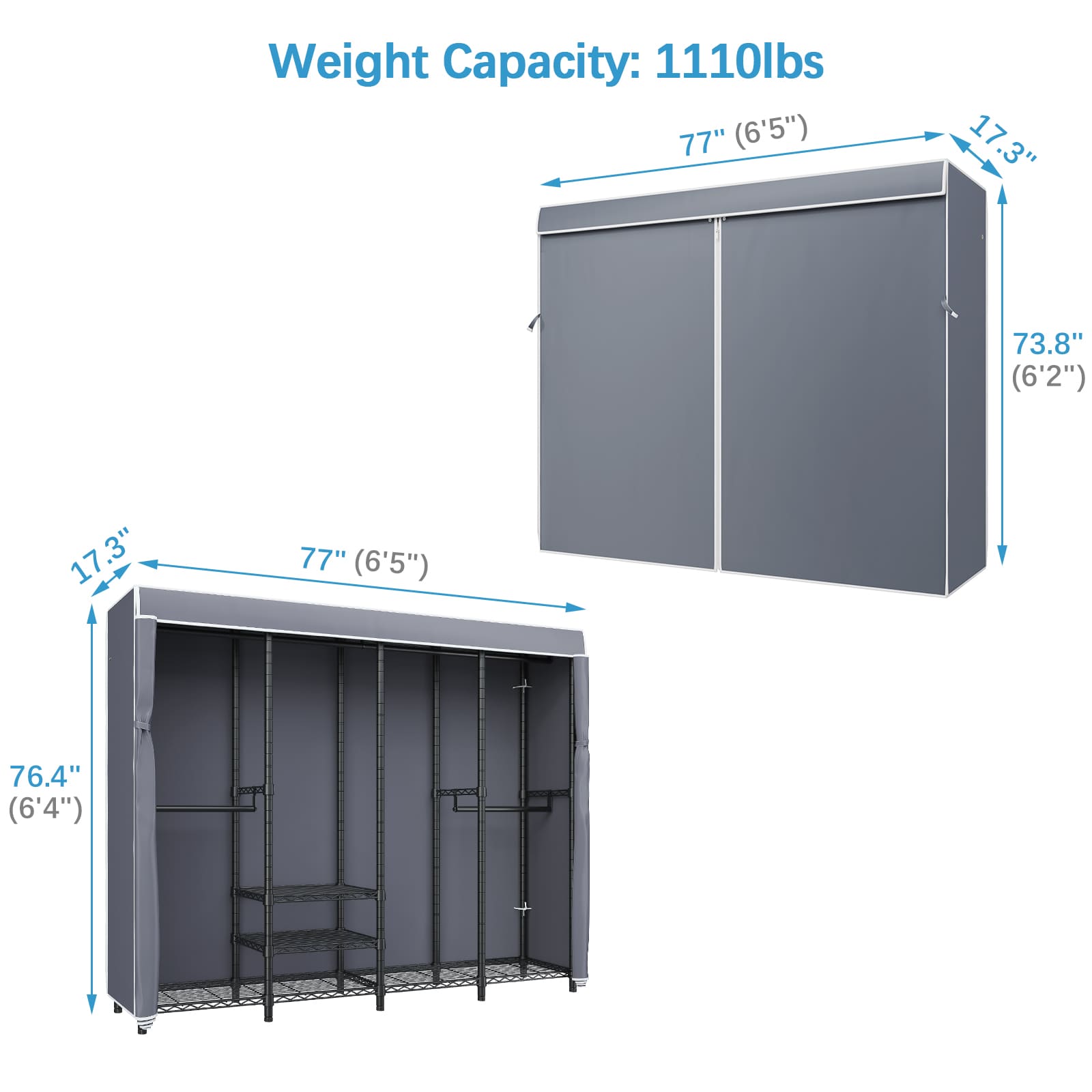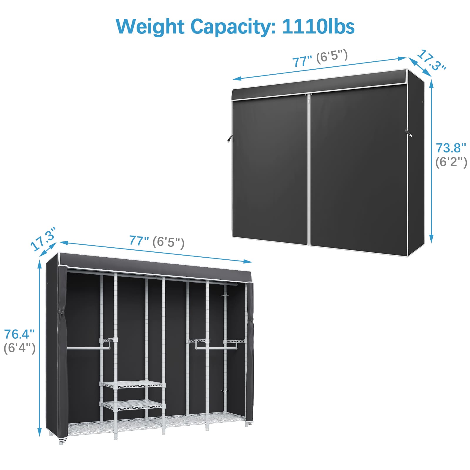 - Dimensions & Load Capacity: 77" L x 16.9" W x 76.4" H. Load capacity up to 1110 lbs. Single hanging rod can support up to 75 lbs, wire shelf can support up to 88 lbs for each.