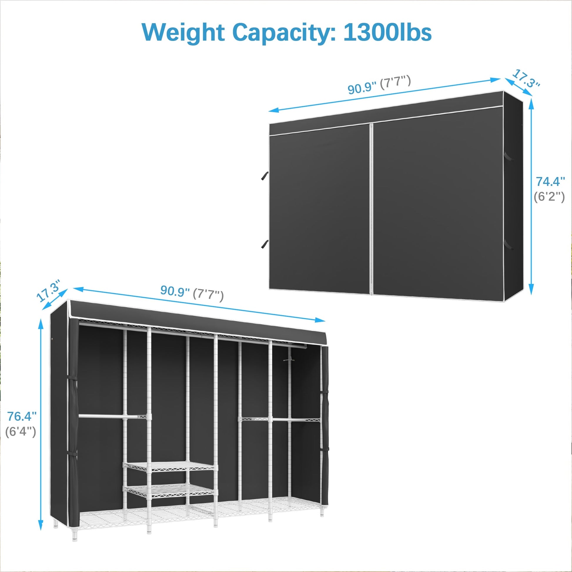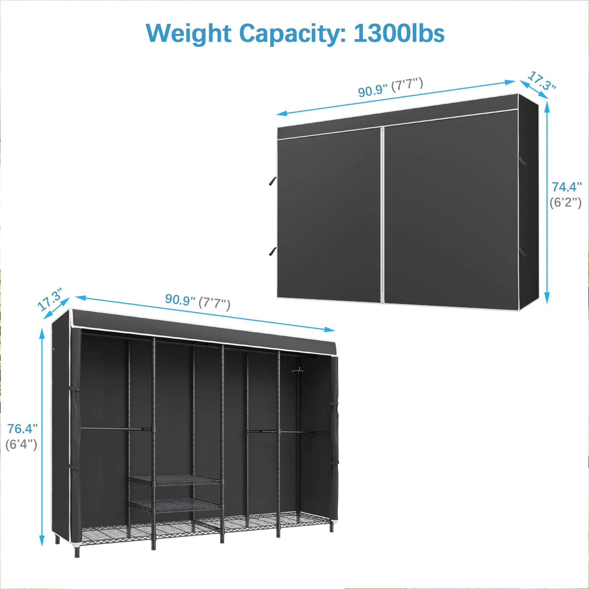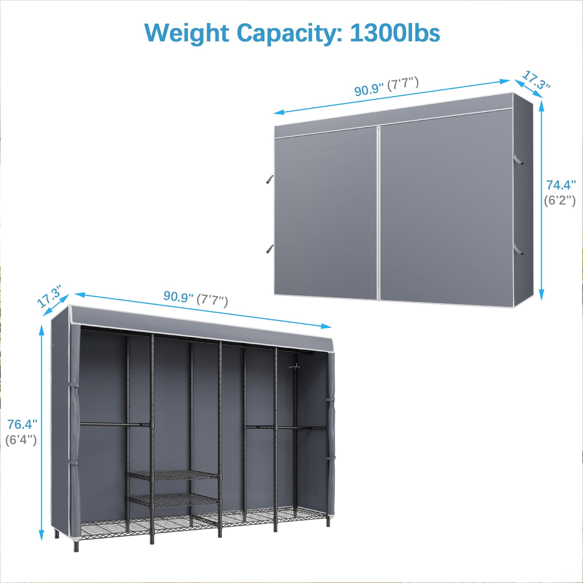 - Dimensions & Load Capacity: 77" L x 16.9" W x 76.4" H. Load capacity up to 1110 lbs. Single hanging rod can support up to 75 lbs, wire shelf can support up to 88 lbs for each.