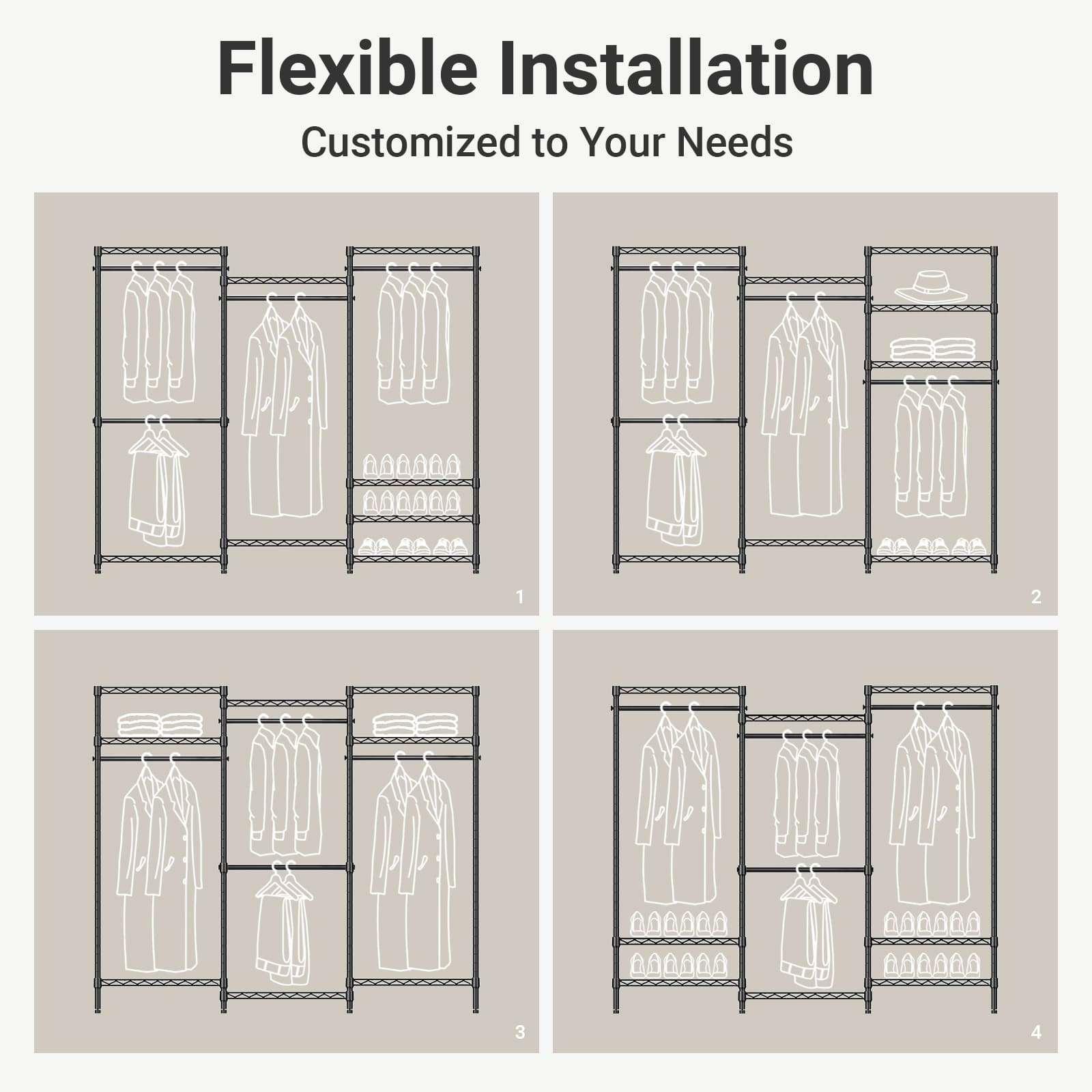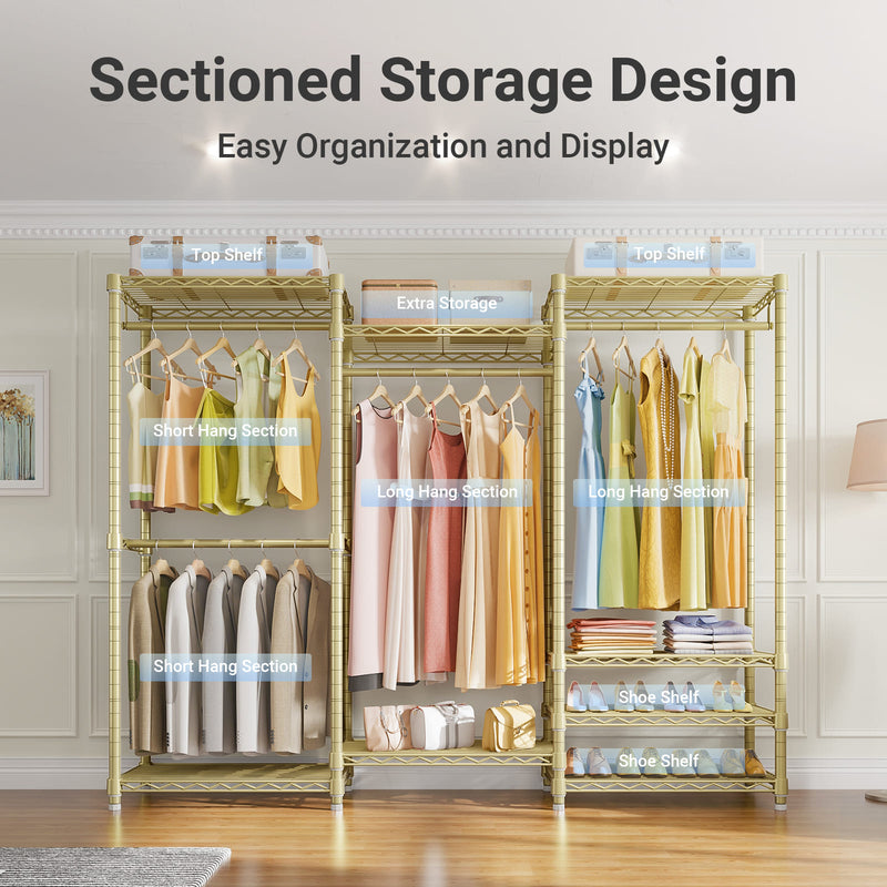 - Multifunction Closet Rack: 6 Tiers Closet Rack maximize the storage area, ensure you enough space to place your clothes, accessories, bedding, lining, shoes, etc. The 4 pcs clothes hanging rods hold up to 60 lbs for each, it is great for hanging suits, coats, long dresses, jackets, pants, shirts or other heavy clothes.