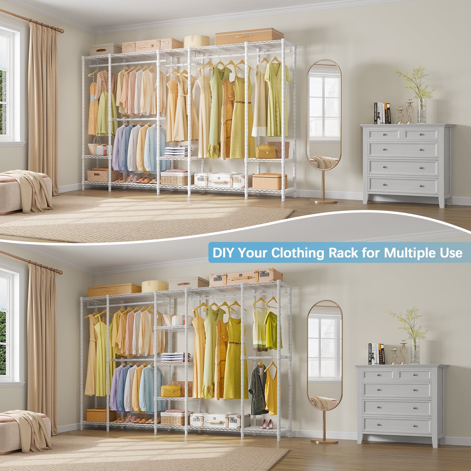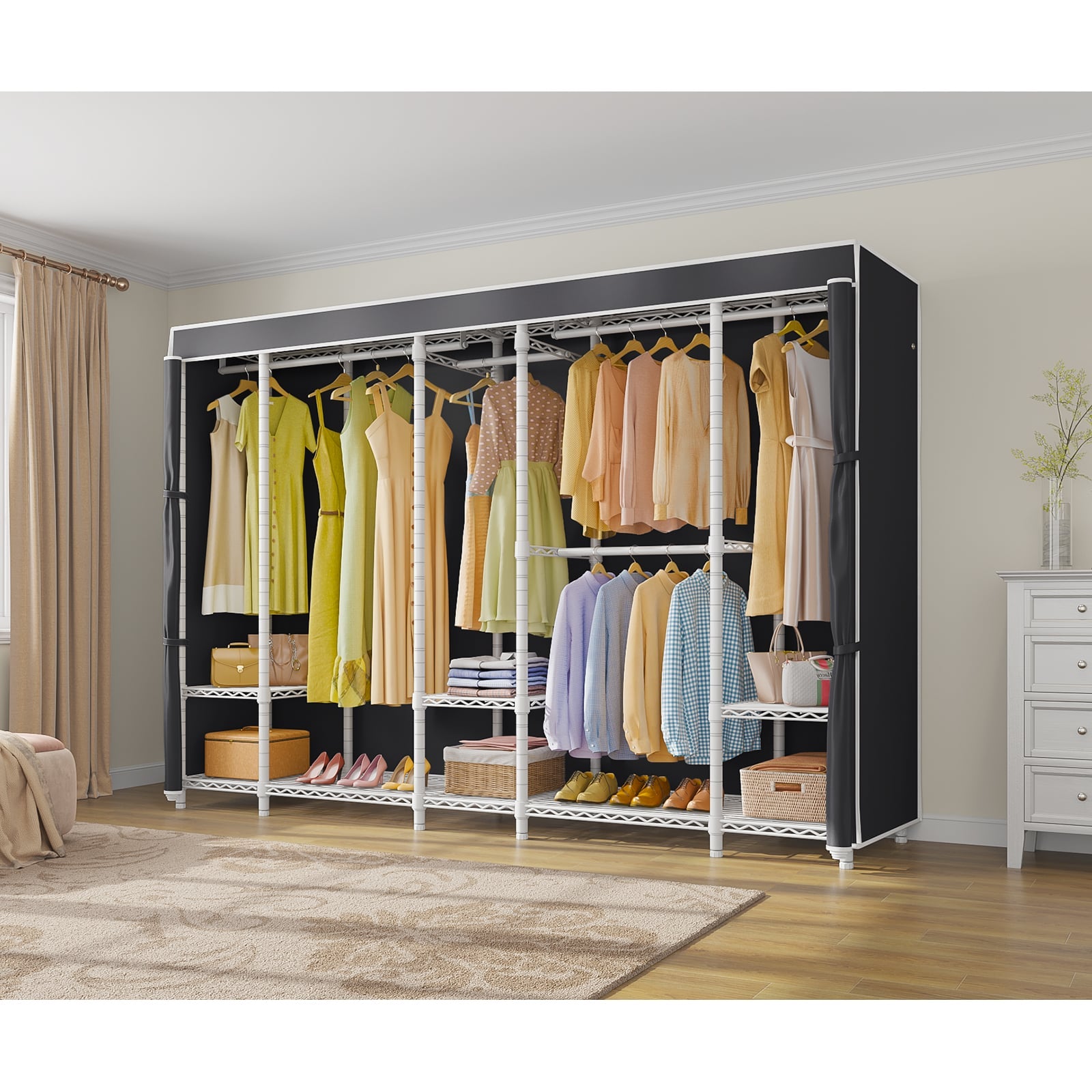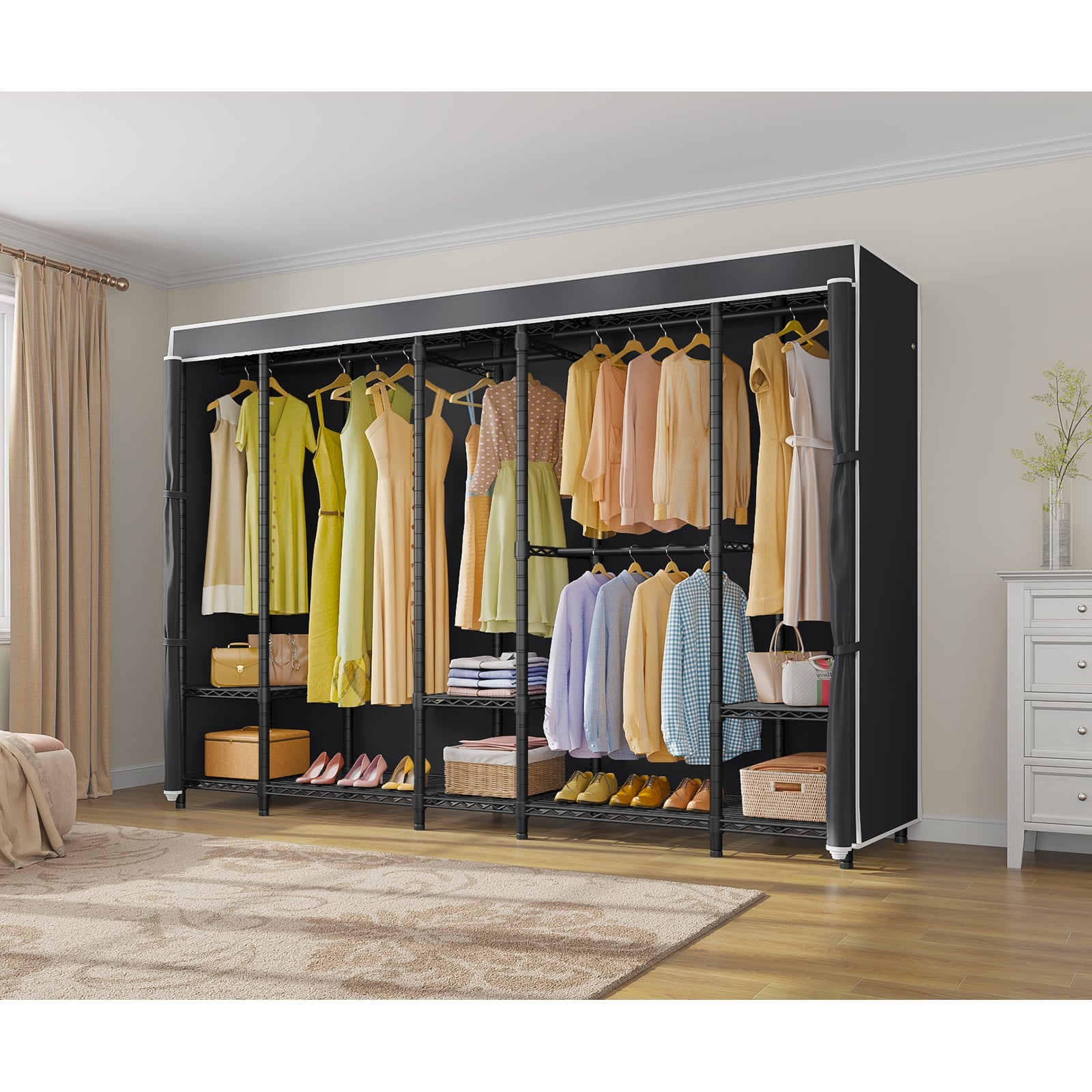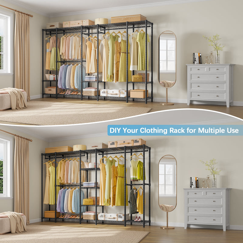 - Sturdy & Reliable:This metal clothes rack is made of thickened carbon steel with a matte powder coating to resist scratches and rust. Reinforced connectors, safety locks, and a sturdy frame ensure stability even when fully loaded. Max Load capacity up to 1300 lbs.