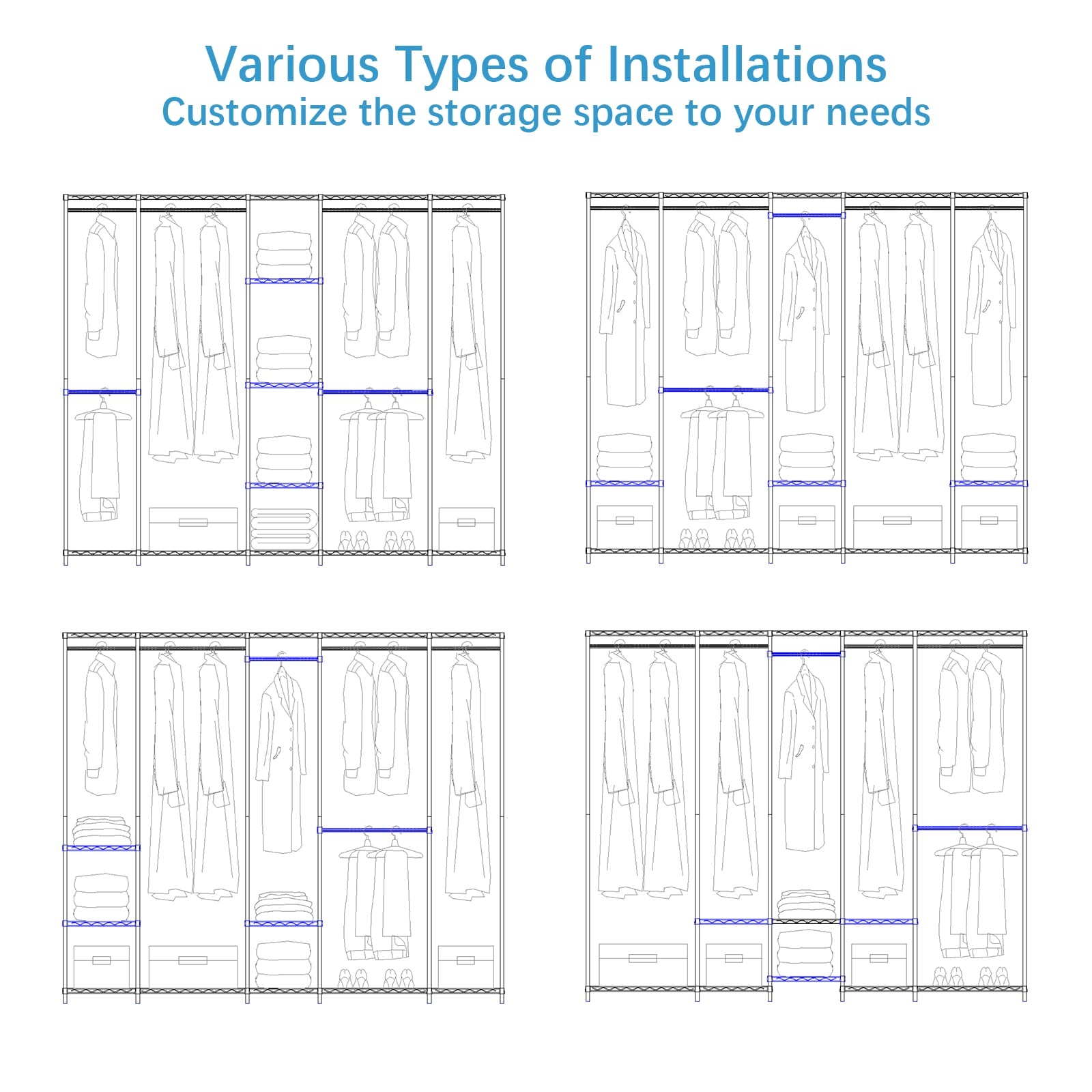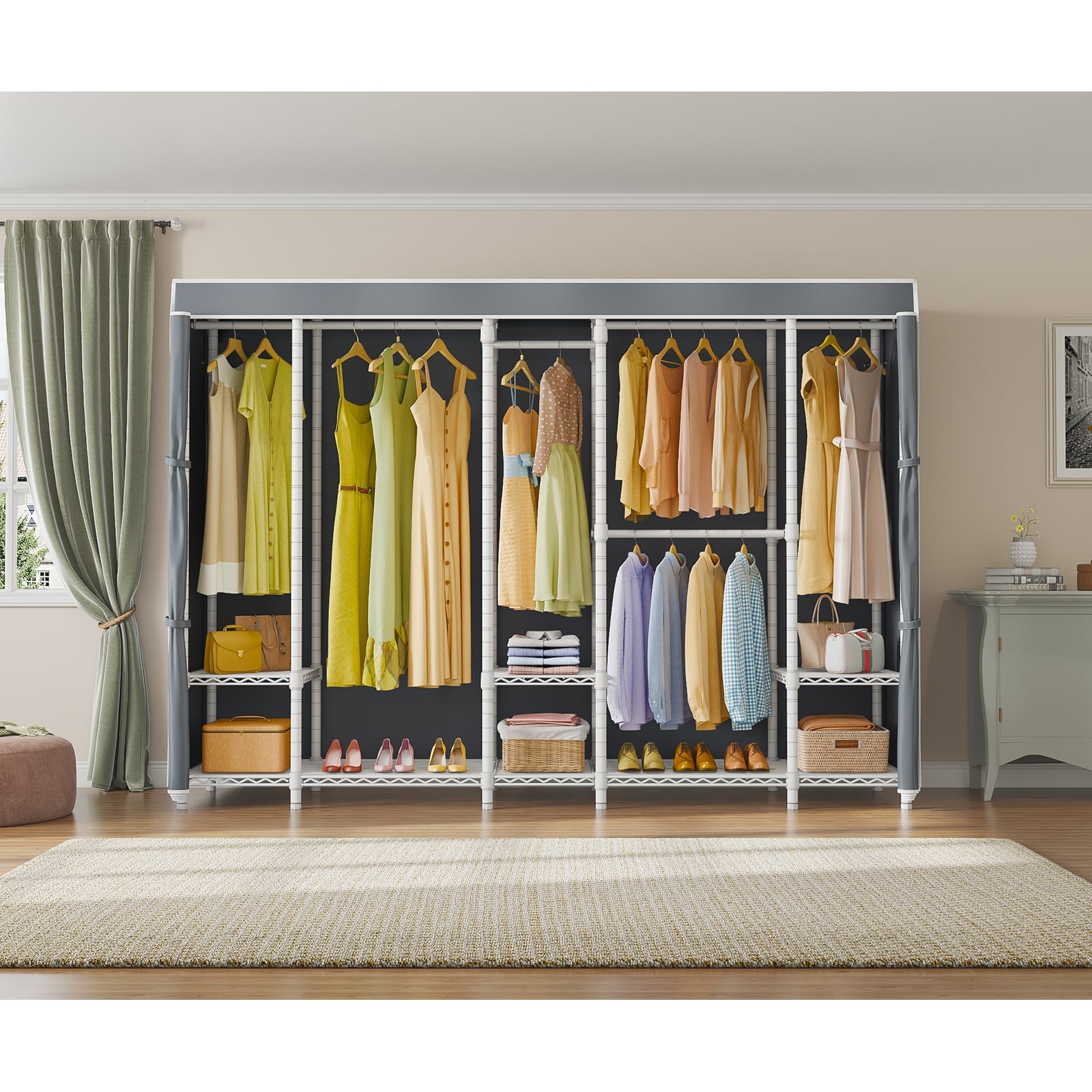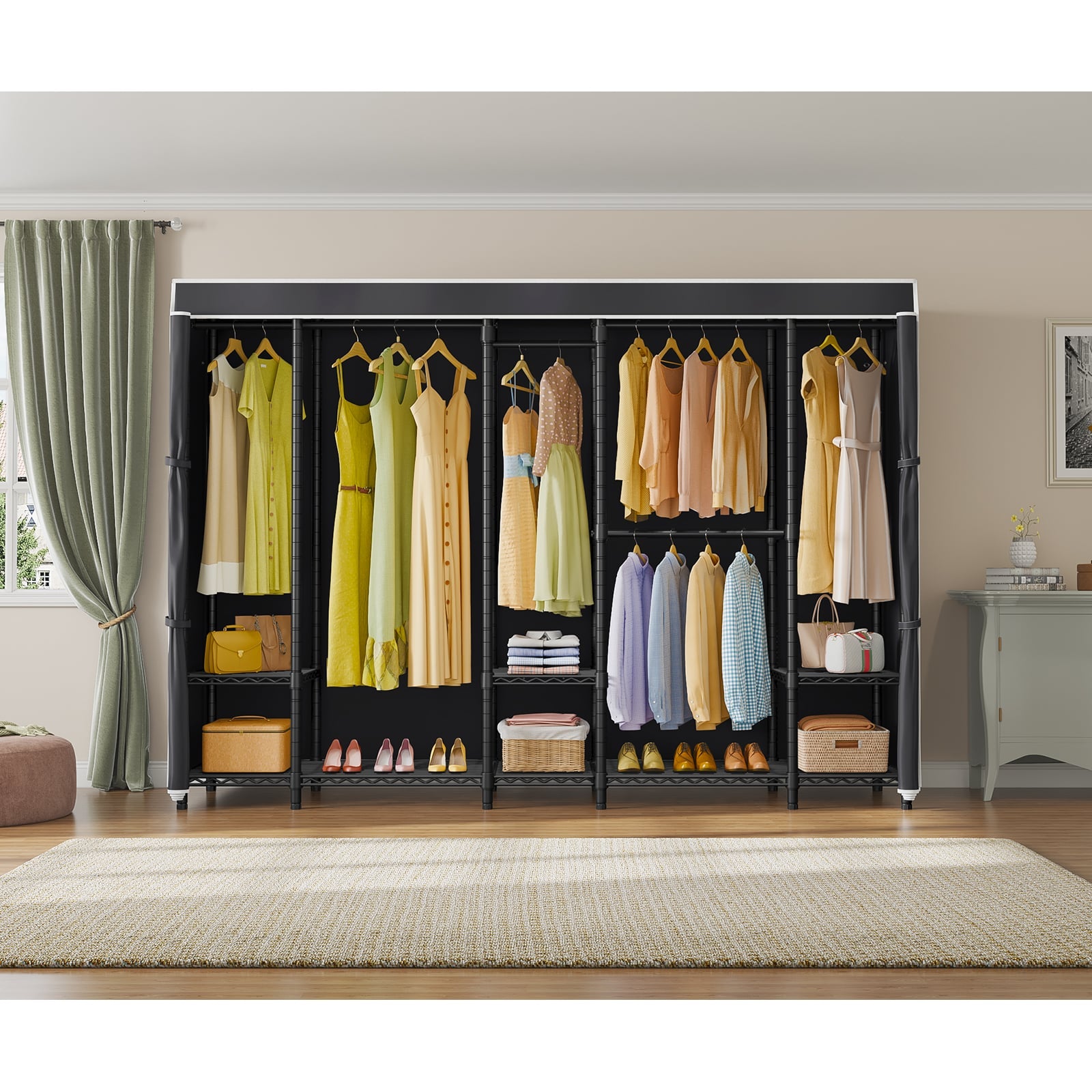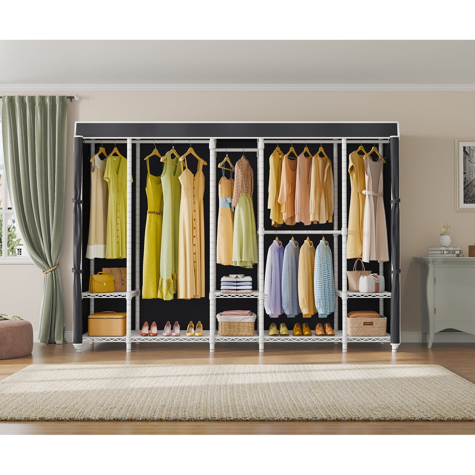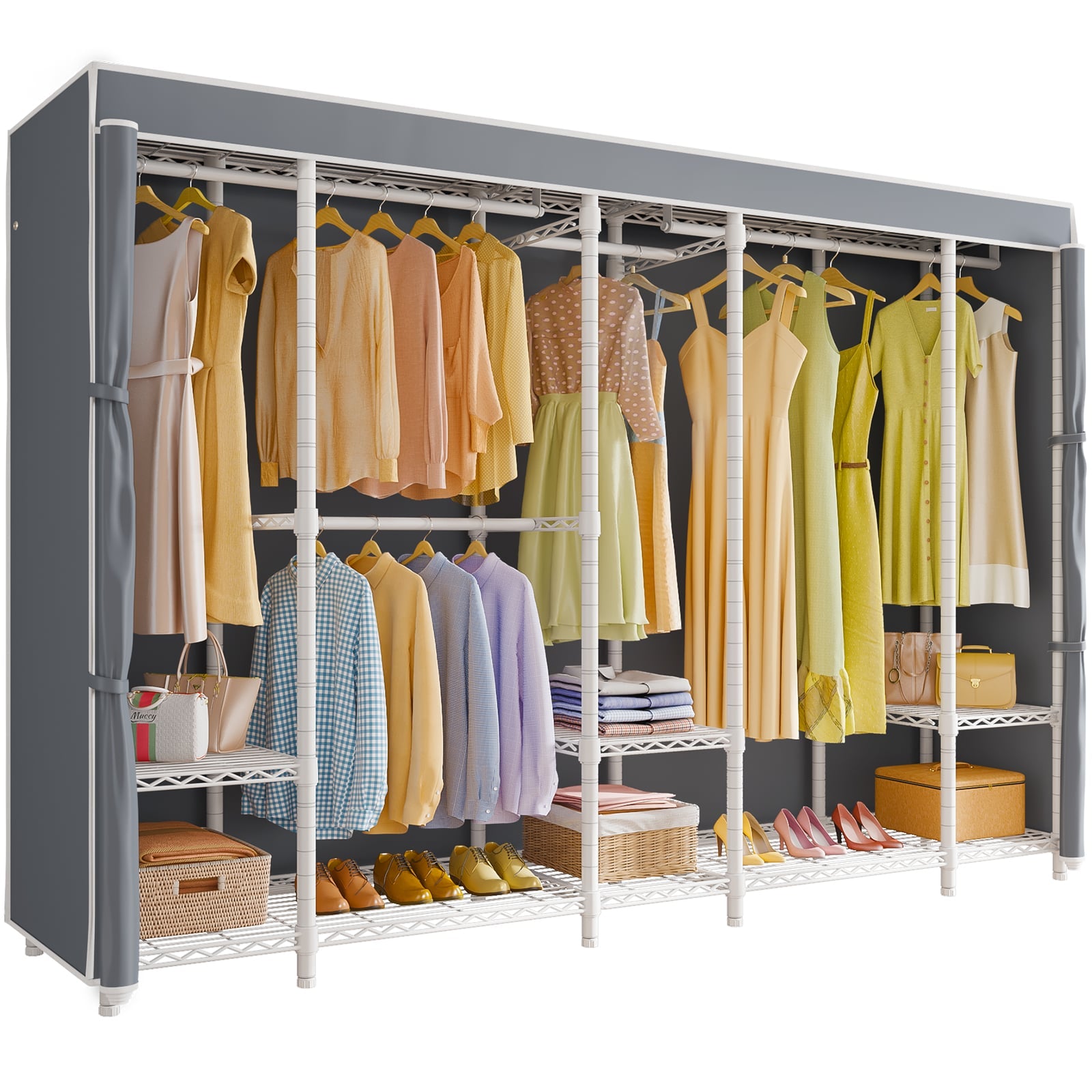 - Versatile and Flexible Closet: Transform your space with this versatile open wardrobe, configurable in multiple layouts. Boasting 9 adjustable shelves and 4 detachable hanging bars, it offers limitless possibilities for personalized storage solutions.