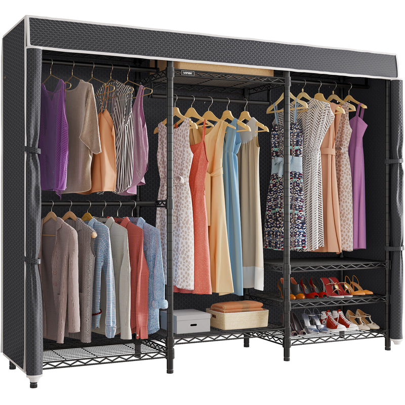 - Multifunction Closet Rack: VIPEK V5C Garment Rack comes with 8 adjustable Shelves & 4 removable hanging rods, it's possible to configure in different ways. Assembly was quick and easy. Raise or lower the shelving to customize the Well-Organized wardrobe closet of your dreams, and MAXIMIZE YOUR SPACE!