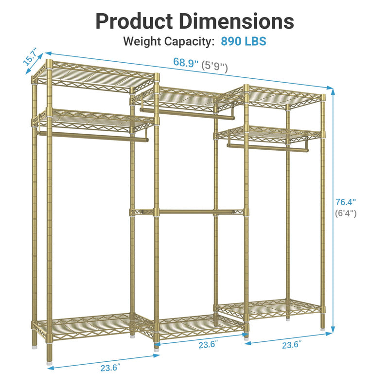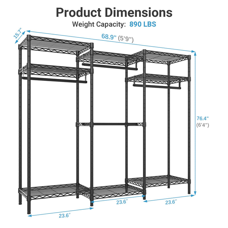 - STURDY & Reliable: Made of high quality iron, it features stable and sturdy, and all metal parts are powder-coated which protects heavy duty clothes rack from water and rust to ensure years of use. Single hanging rod can support up to 60 lbs, Wire shelf can support up to 88 lbs for each. Easy access in bedroom, cloakroom, clothing store, laundry room, walk-in closet and more.Load capacity up to 890lbs, not easily deformed. Single hanging rod can support up to 60 lbs, Wire shelf can support up to 88 lbs for each.