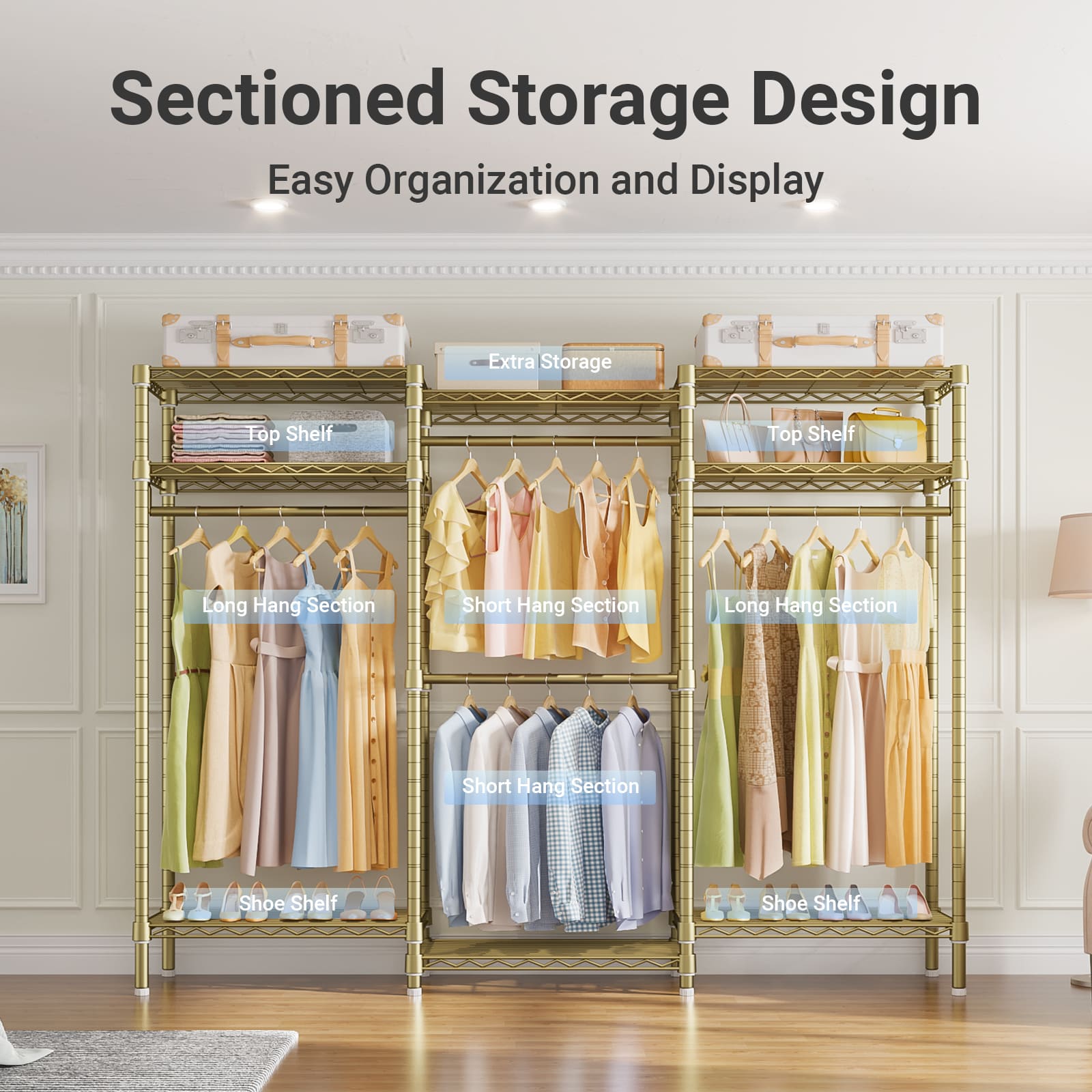 - MULTIFUNCTION CLOSET RACK: Muti-style assembly, customize the storage space to your needs. 5 Tiers Adjustable Wire Closet Rack maximize the storage area, ensure you enough space to place your clothes, accessories, bedding, lining, shoes, etc. The 4pcs clothes hanging rods are great for hanging suits, coats, long dresses, jackets, pants, shirts or other heavy clothes.