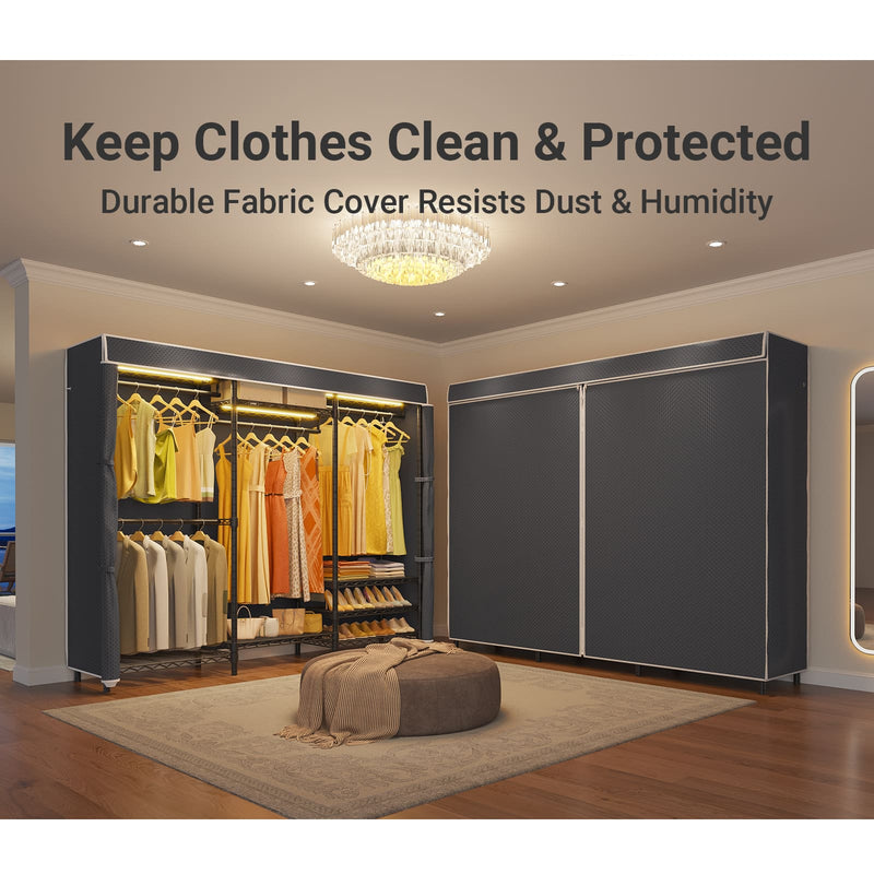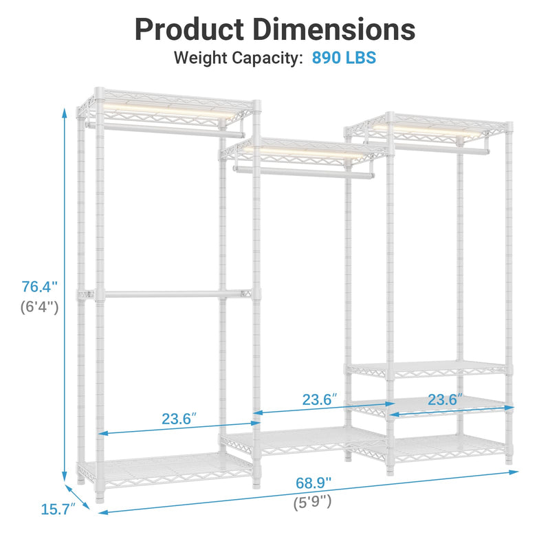 - Dimensions & Load Capacity: 70.1" L x 17.3" W x 76.4" H (includes cover). Load capacity up to 890 lbs. Single hanging rod can support up to 88 lbs, Wire shelf can support up to 90 lbs for each.