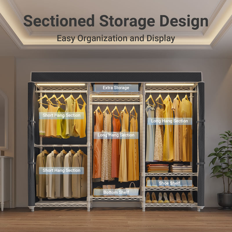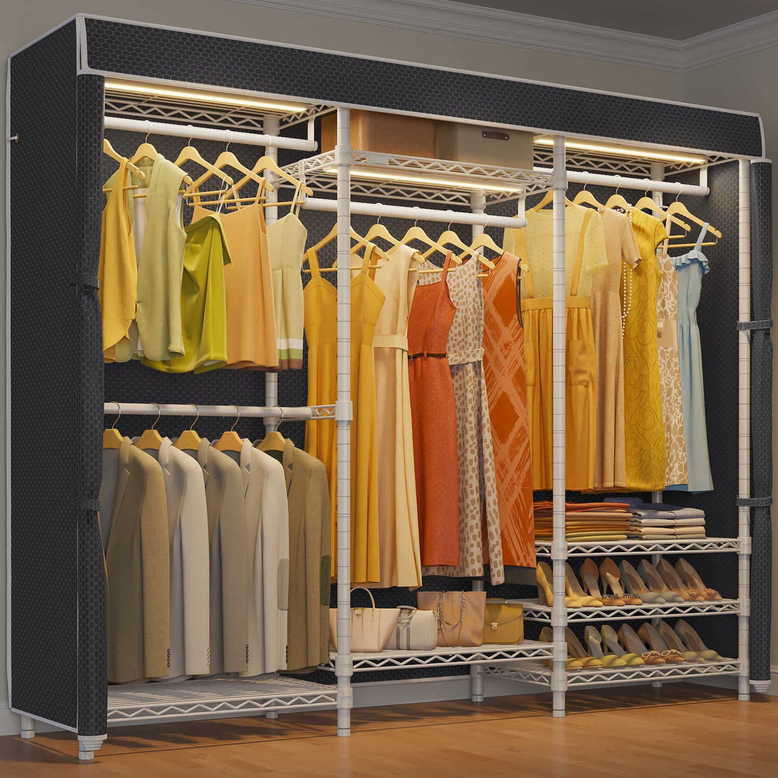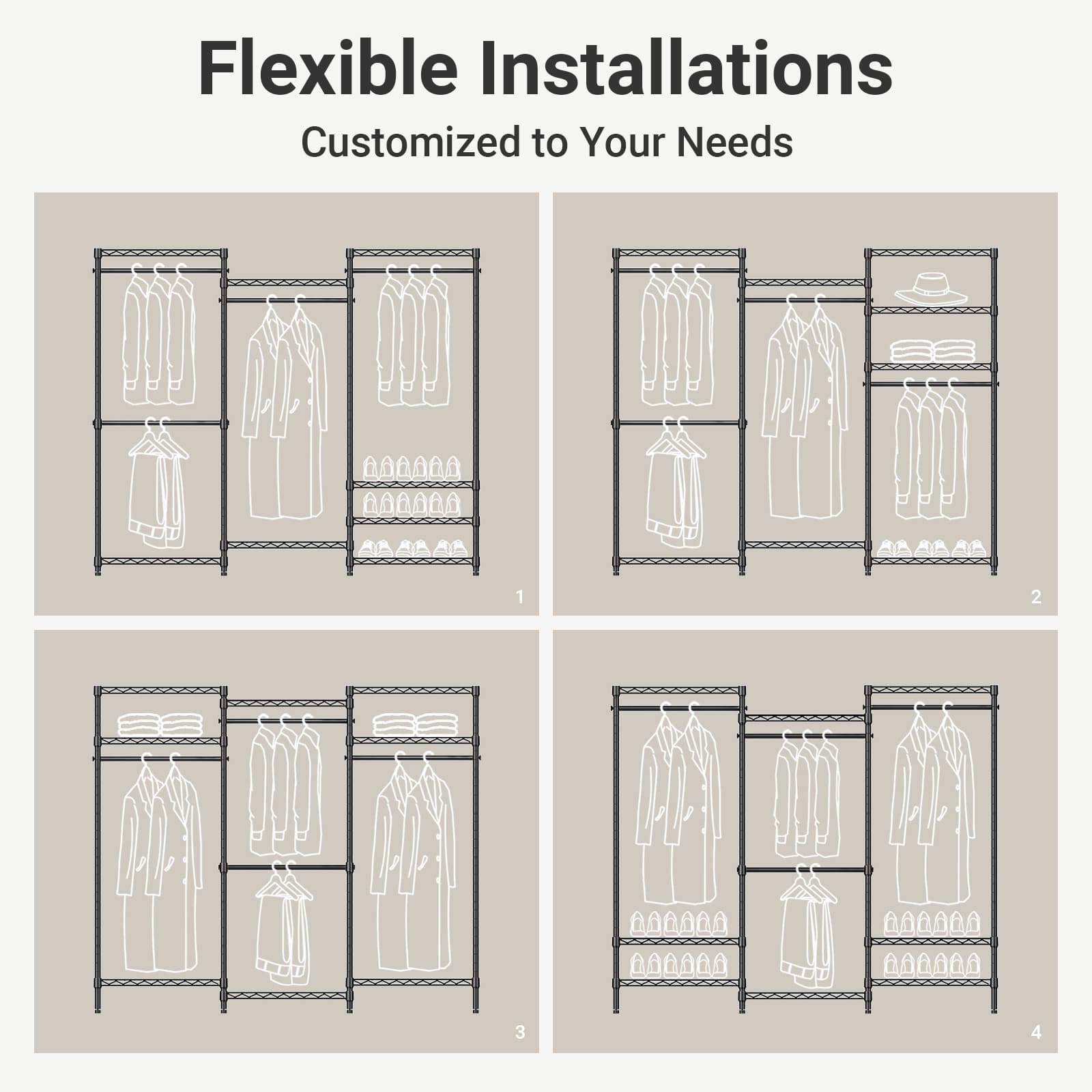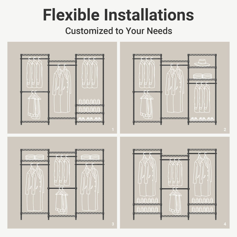 - Sturdy Closet Rack: VIPEK V5L Garment Rack comes with 8 adjustable Shelves & 4 removable hanging rods, it's possible to configure in different ways. Assembly was quick and easy. Raise or lower the shelving to customize the Well-Organized wardrobe closet of your dreams, and MAXIMIZE YOUR SPACE! Made of high quality iron, it features stable and sturdy; all metal parts are powder-coated which protects sturdy clothes rack from water and rust to ensure years of use.