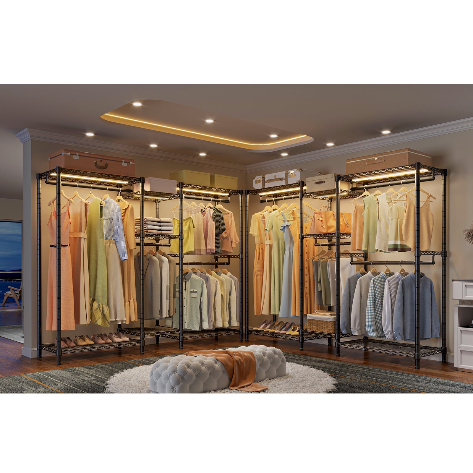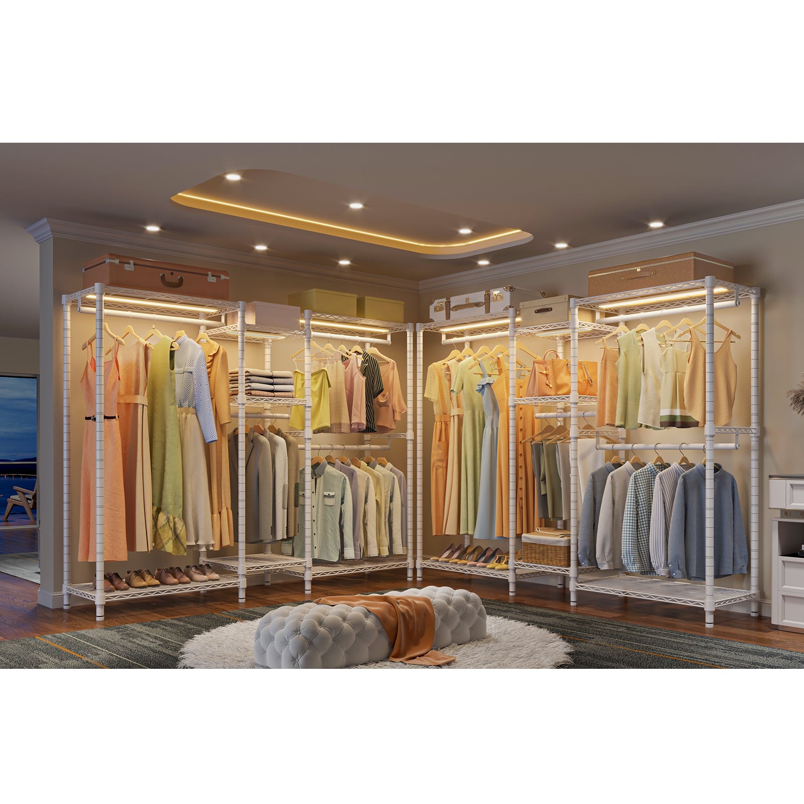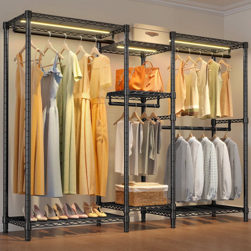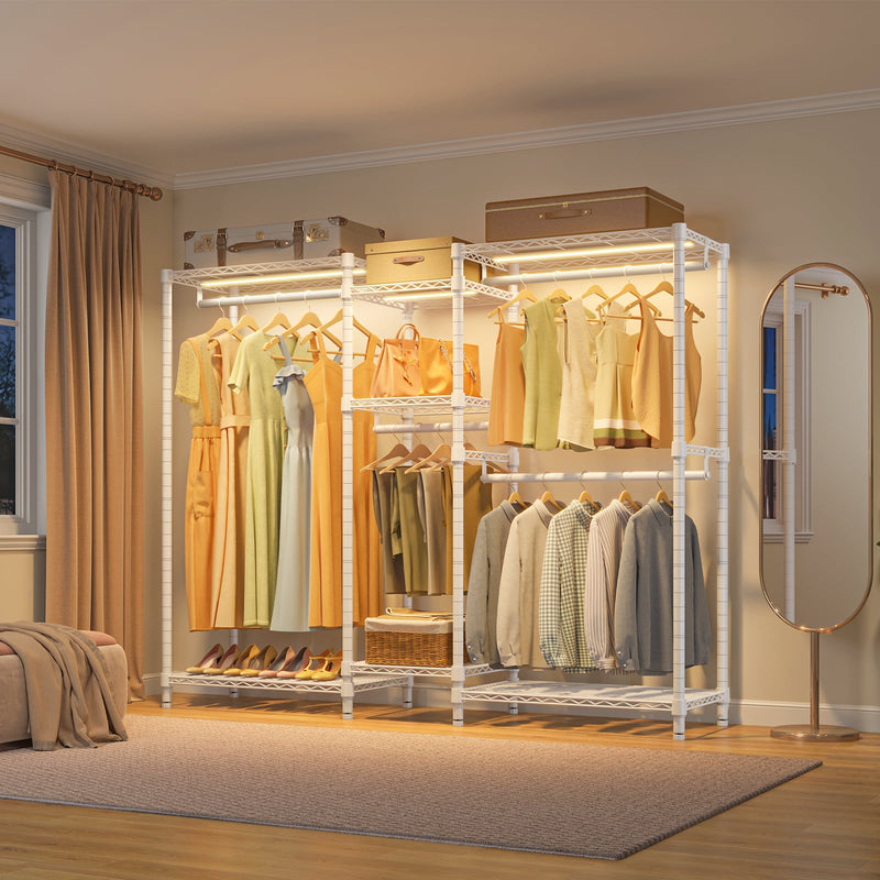 - Dimmable LED Lights -- This portable closet rack features built-in 3000K warm white LED lighting. The closet lights are bright and eye-protection, thanks to 120pcs energy-saving LEDs and stepless dimming brightness to allows you to brighten or dim them for your needs.