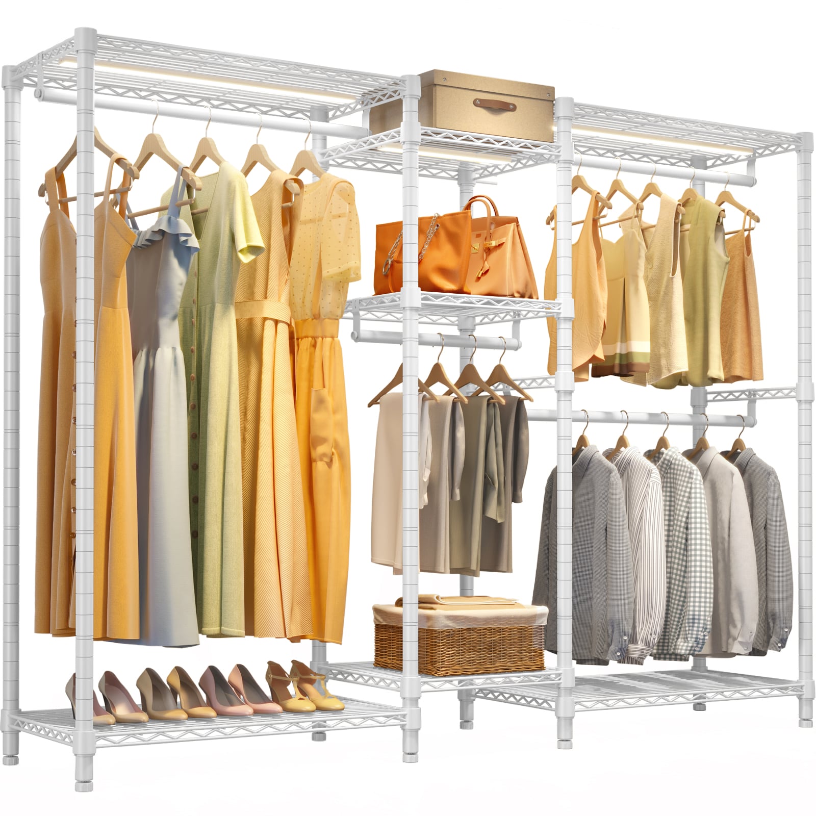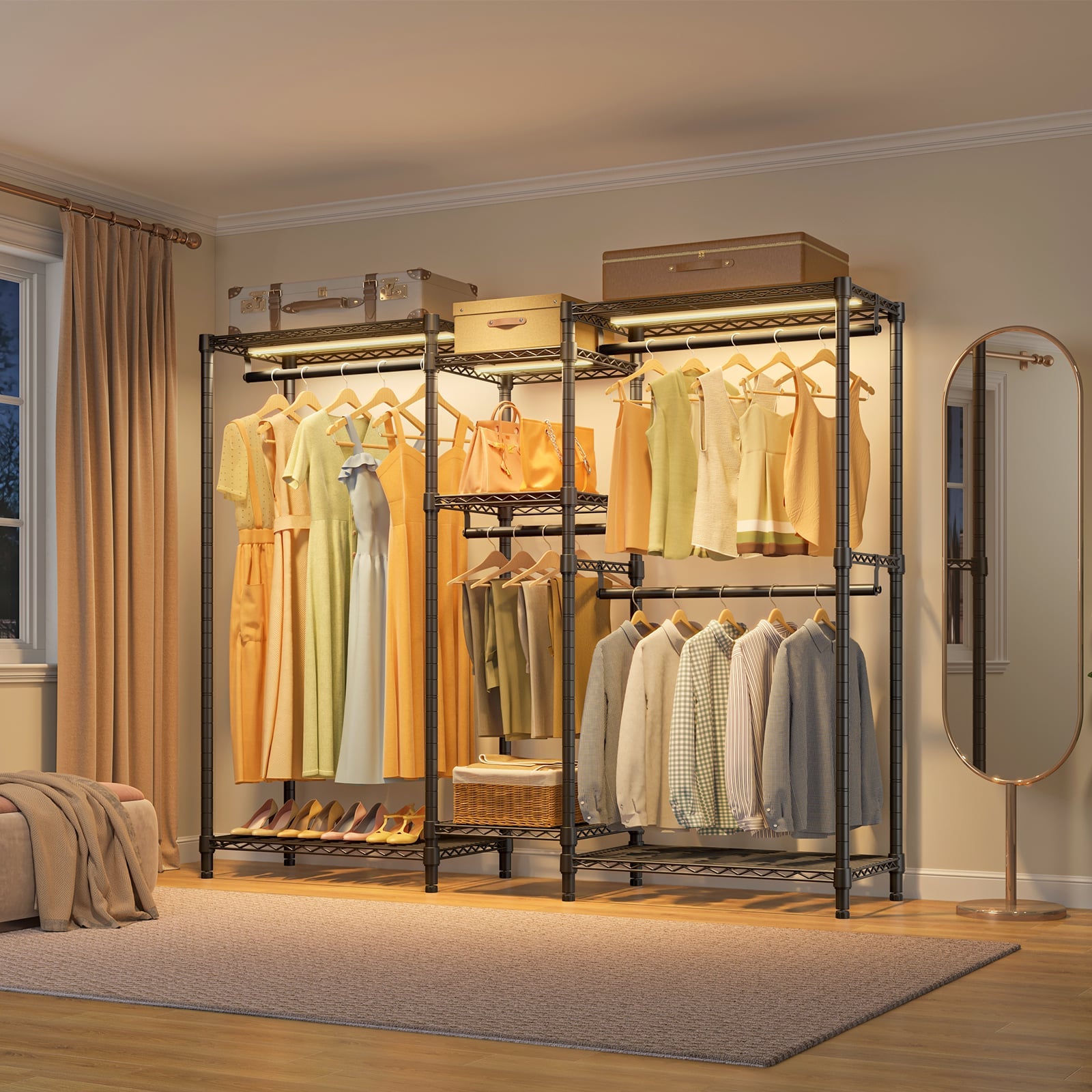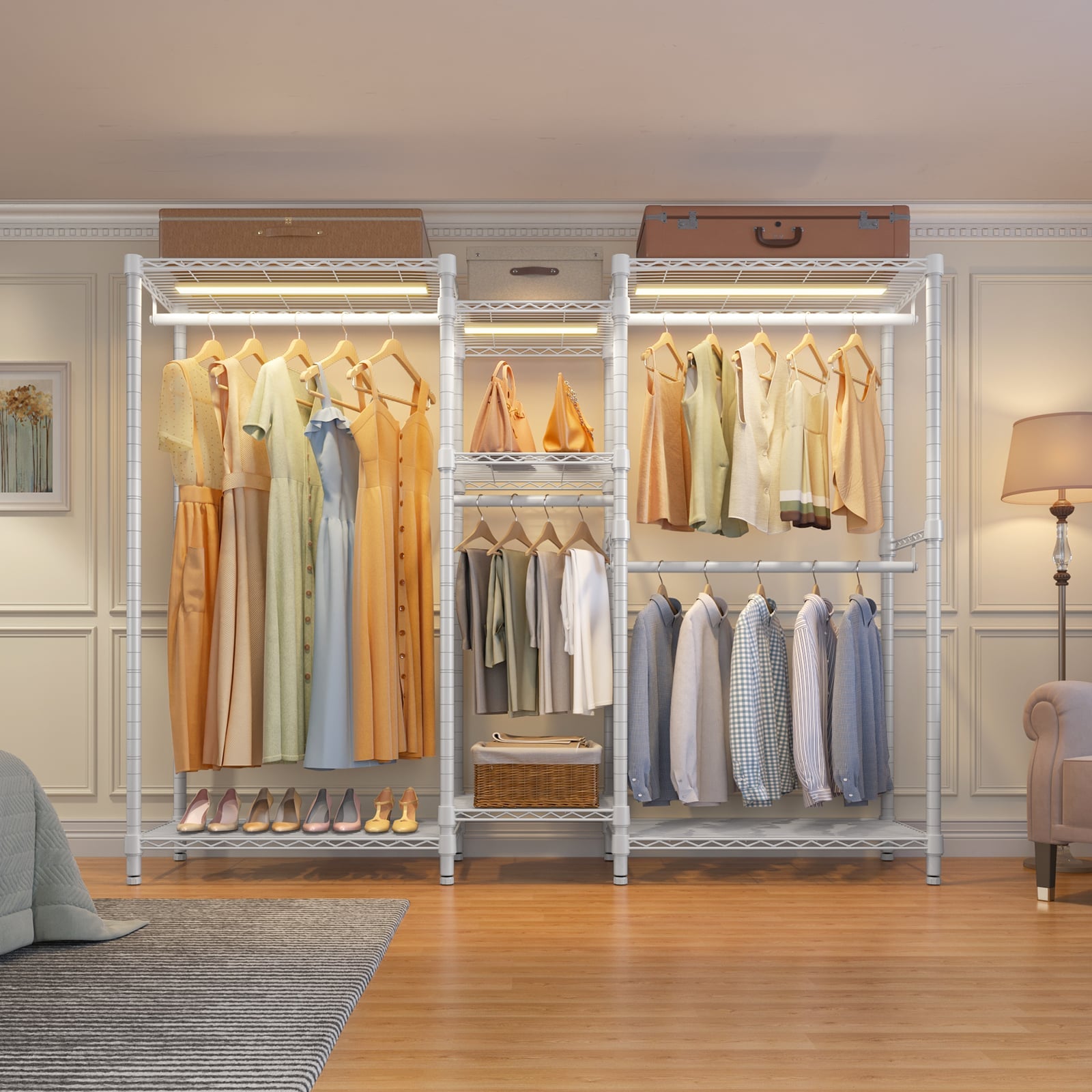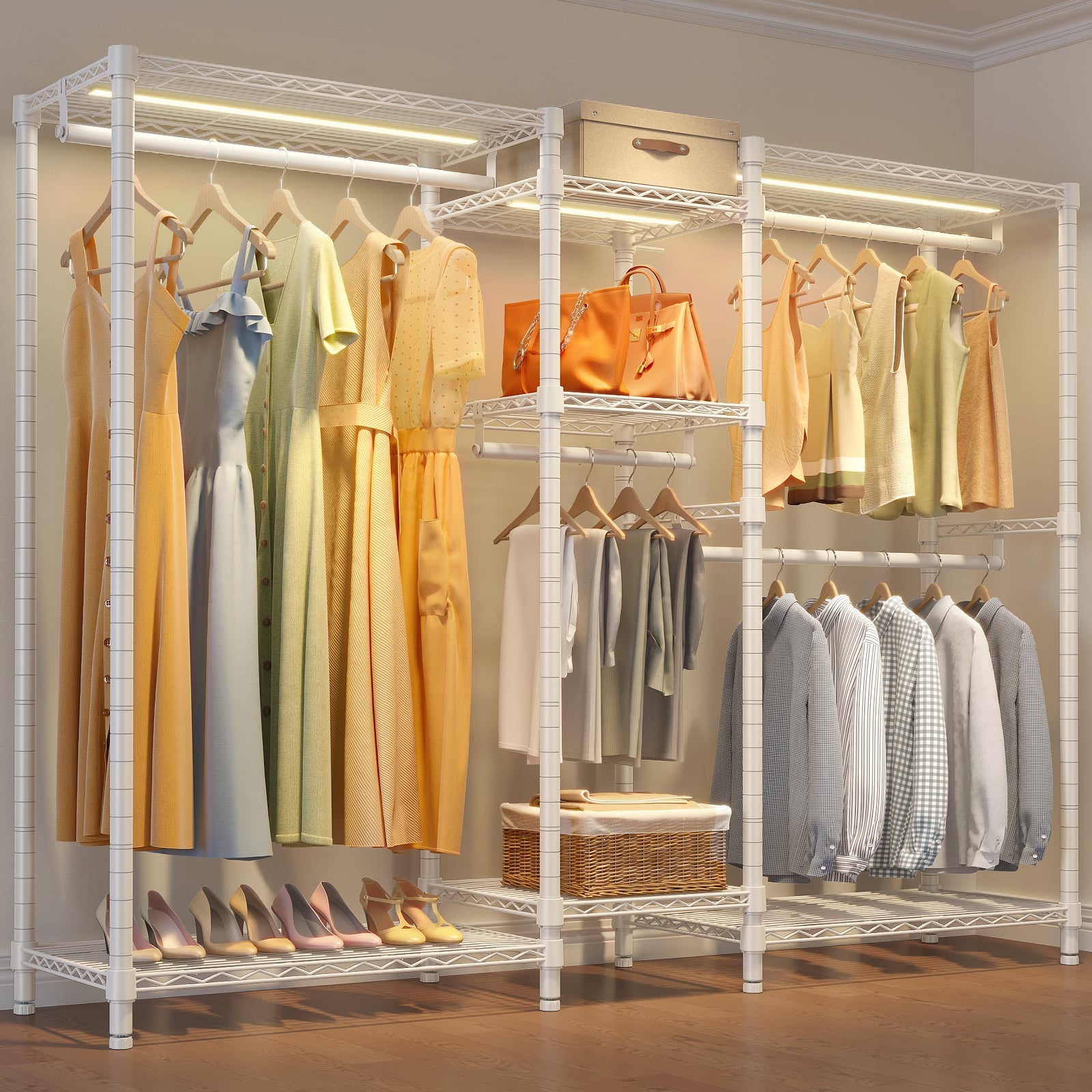 - Dimmable LED Lights -- This portable closet rack features built-in 3000K warm white LED lighting. The closet lights are bright and eye-protection, thanks to 120pcs energy-saving LEDs and stepless dimming brightness to allows you to brighten or dim them for your needs.