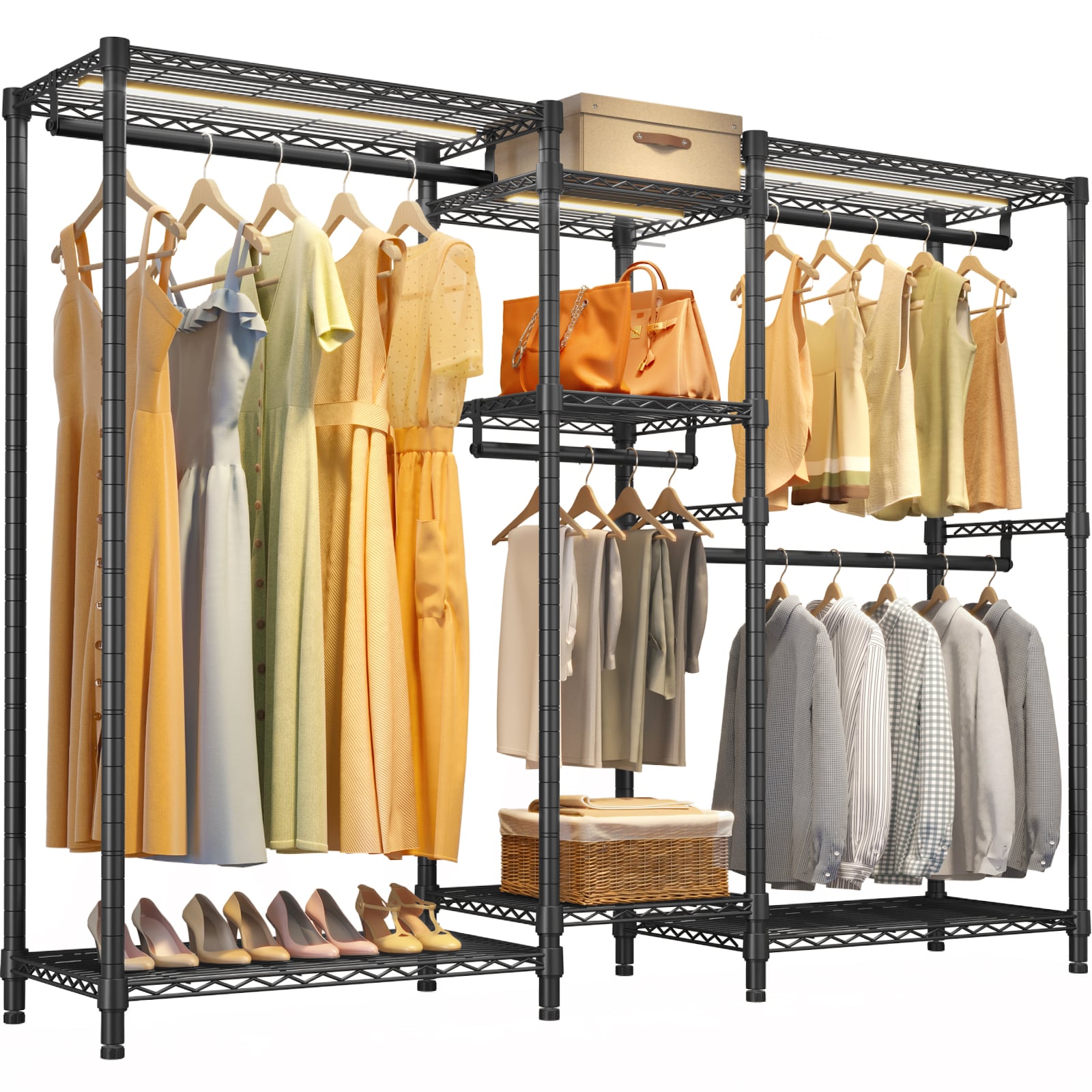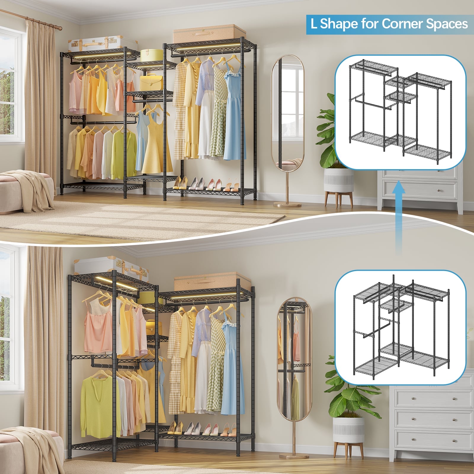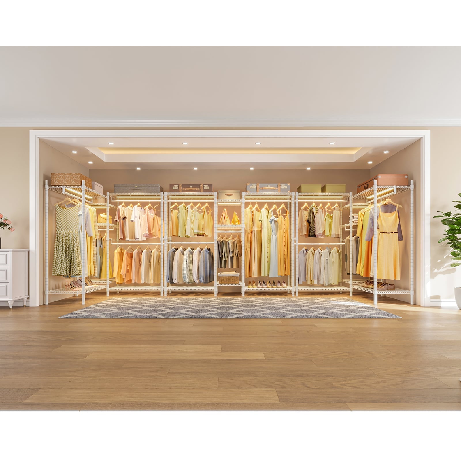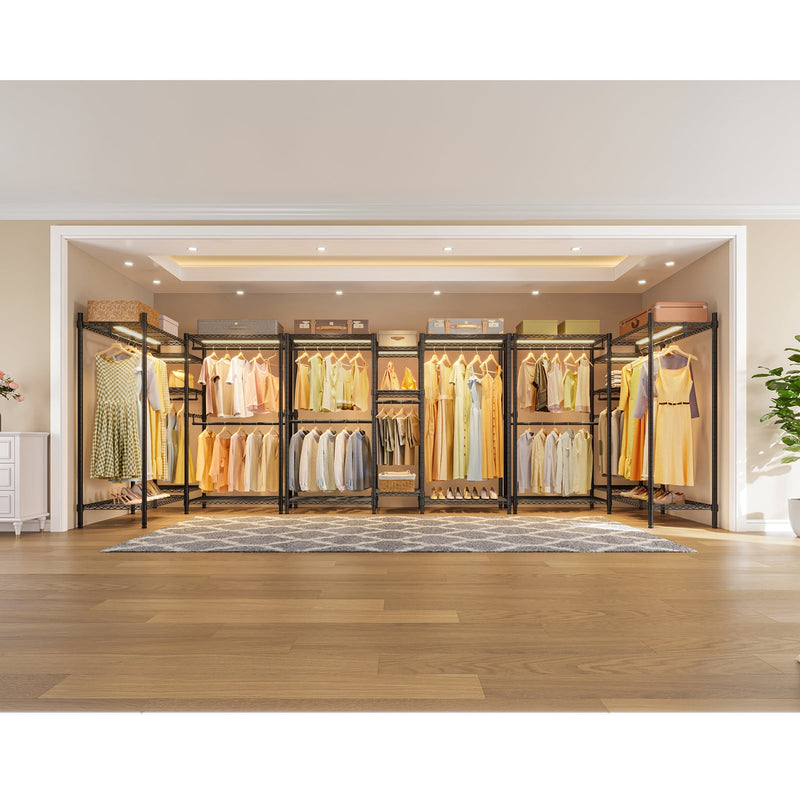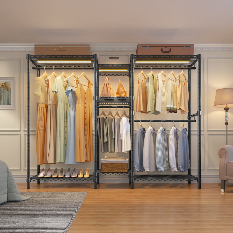 - Customized Storage Closet -- Our V6L standing closet system features 7 adjustable closet shelves and 3 hanging rod, which giving you the flexibility to store a wide variety of items, from shoes and bags to luggage and folded clothing. You can also remove a piece of shelves to create additional space for long dress.