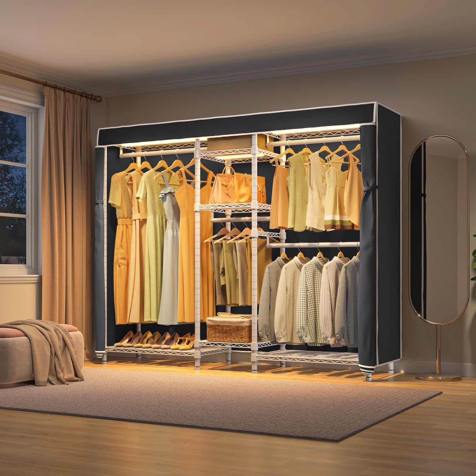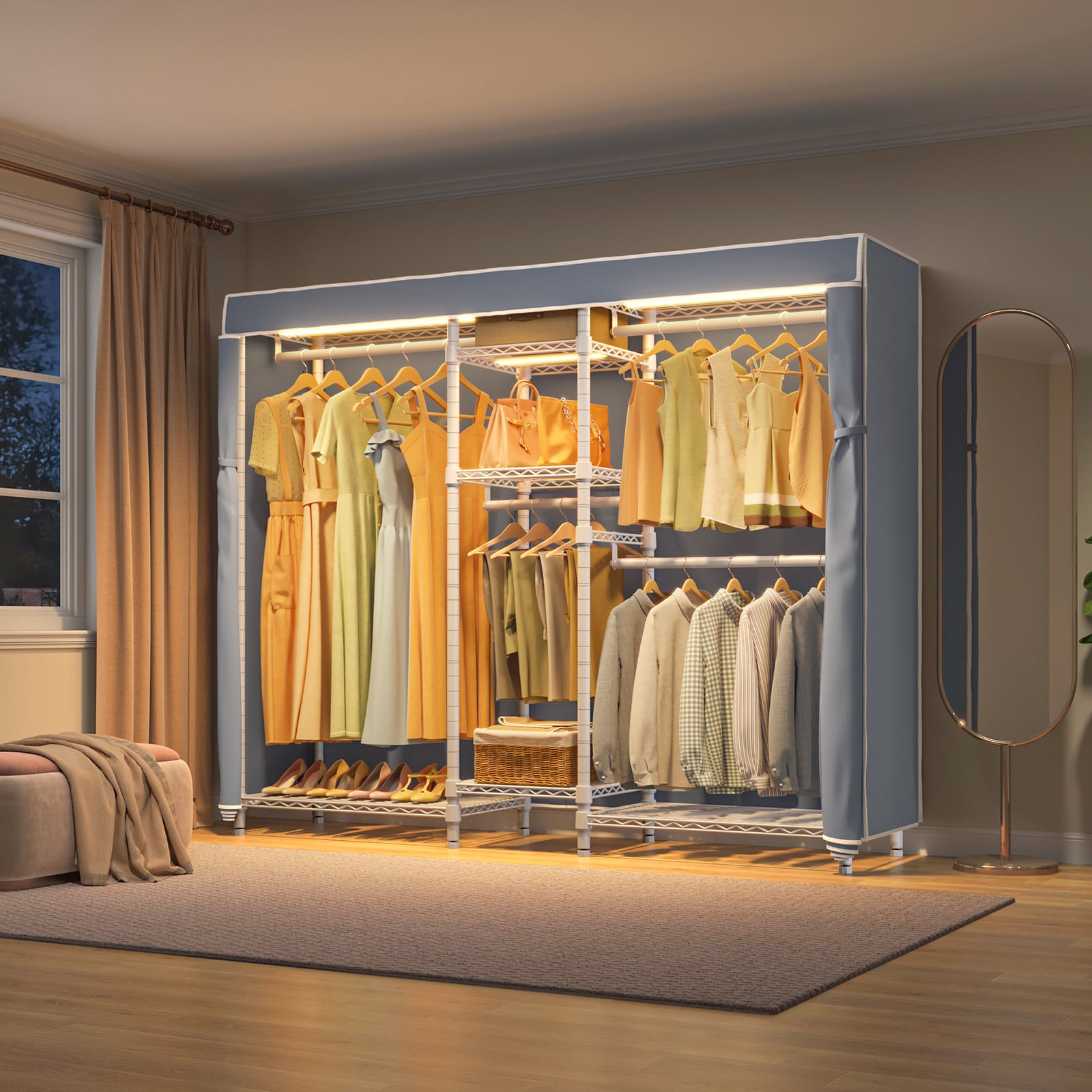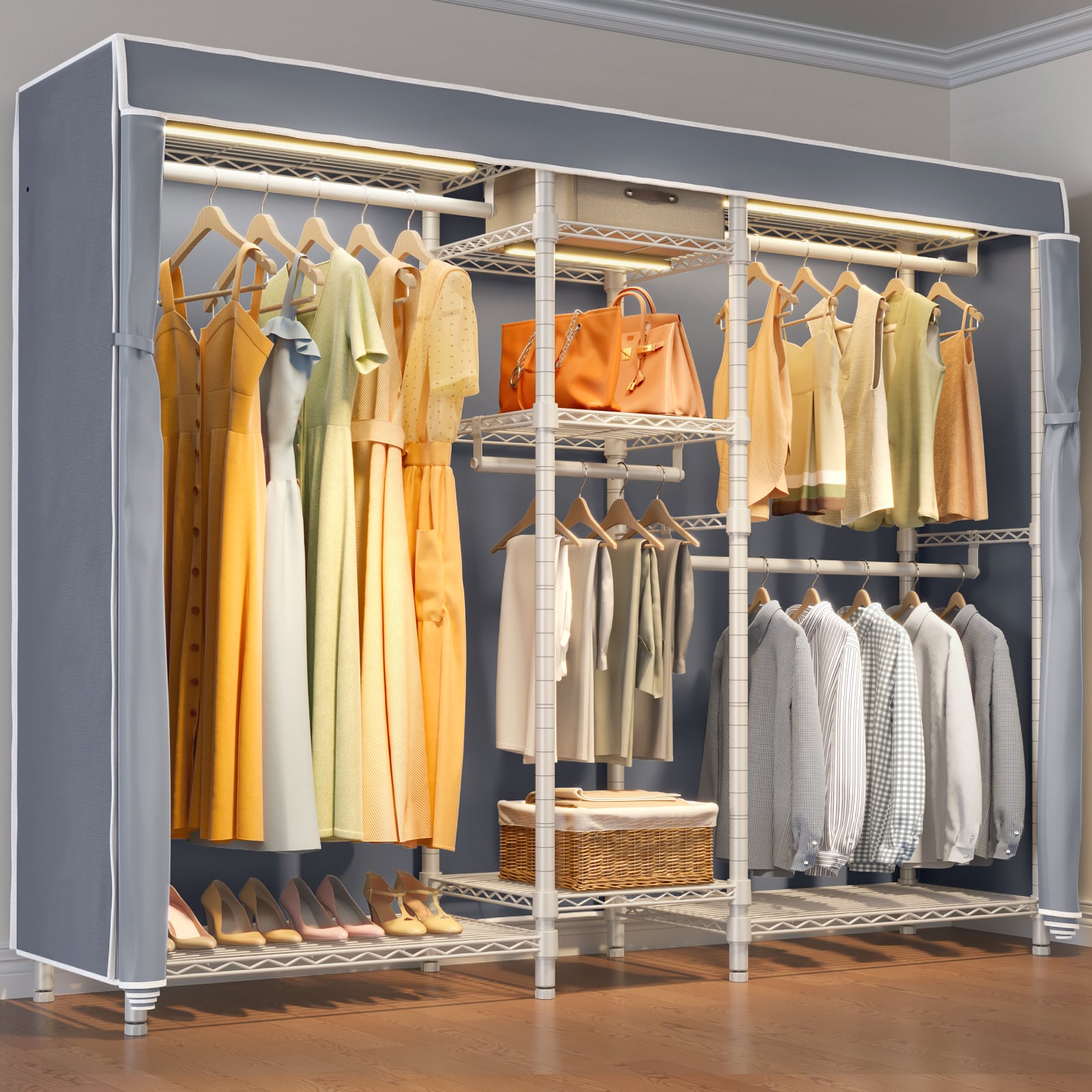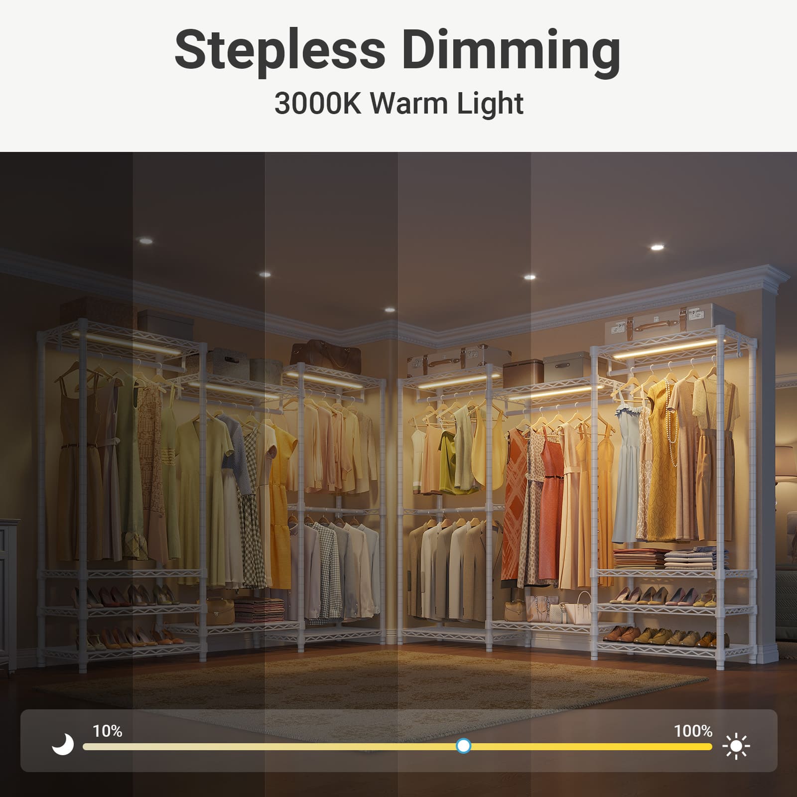 - Dimmable LED Lights -- This portable closet rack features built-in 3000K warm white LED lighting. The closet lights are bright and eye-protection, thanks to 120pcs energy-saving LEDs and stepless dimming brightness to allows you to brighten or dim them for your needs.