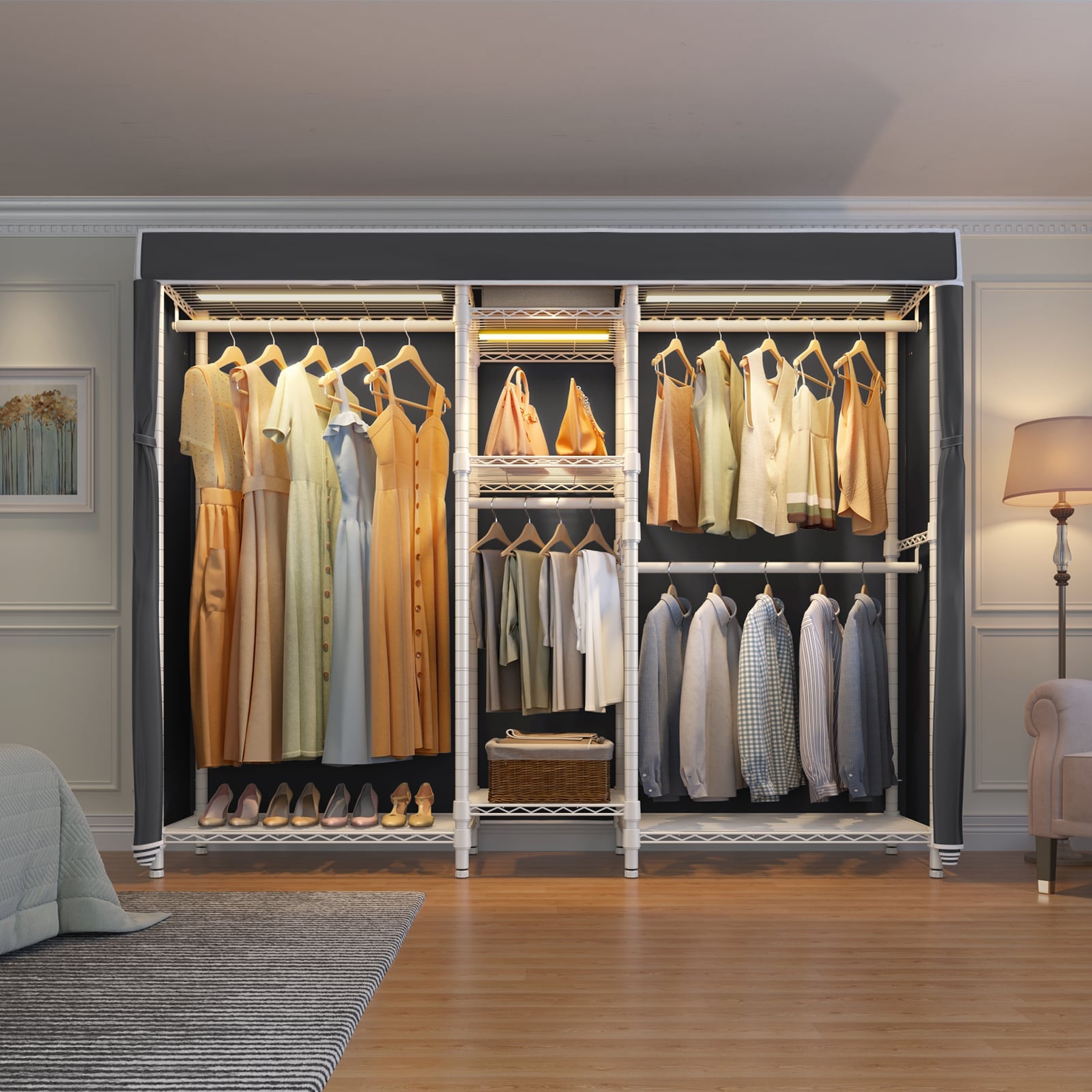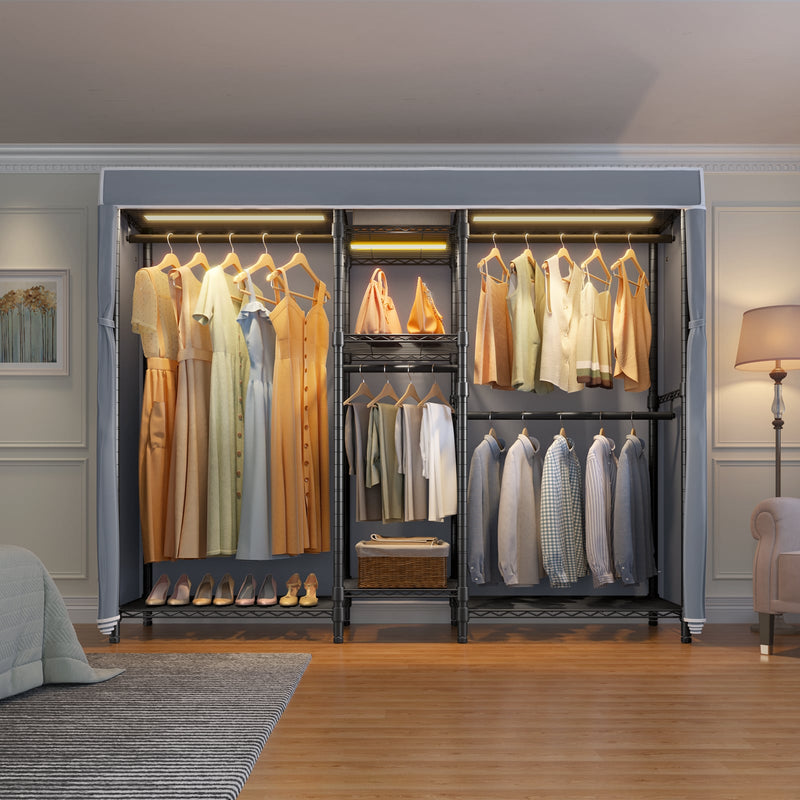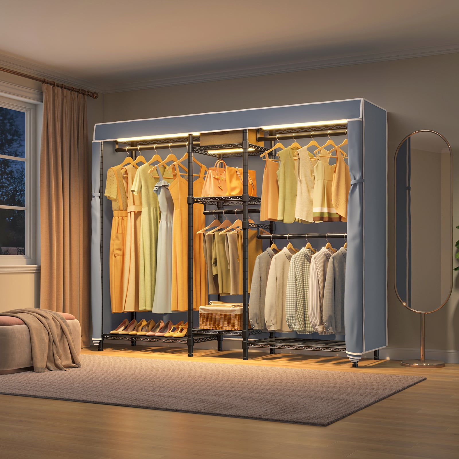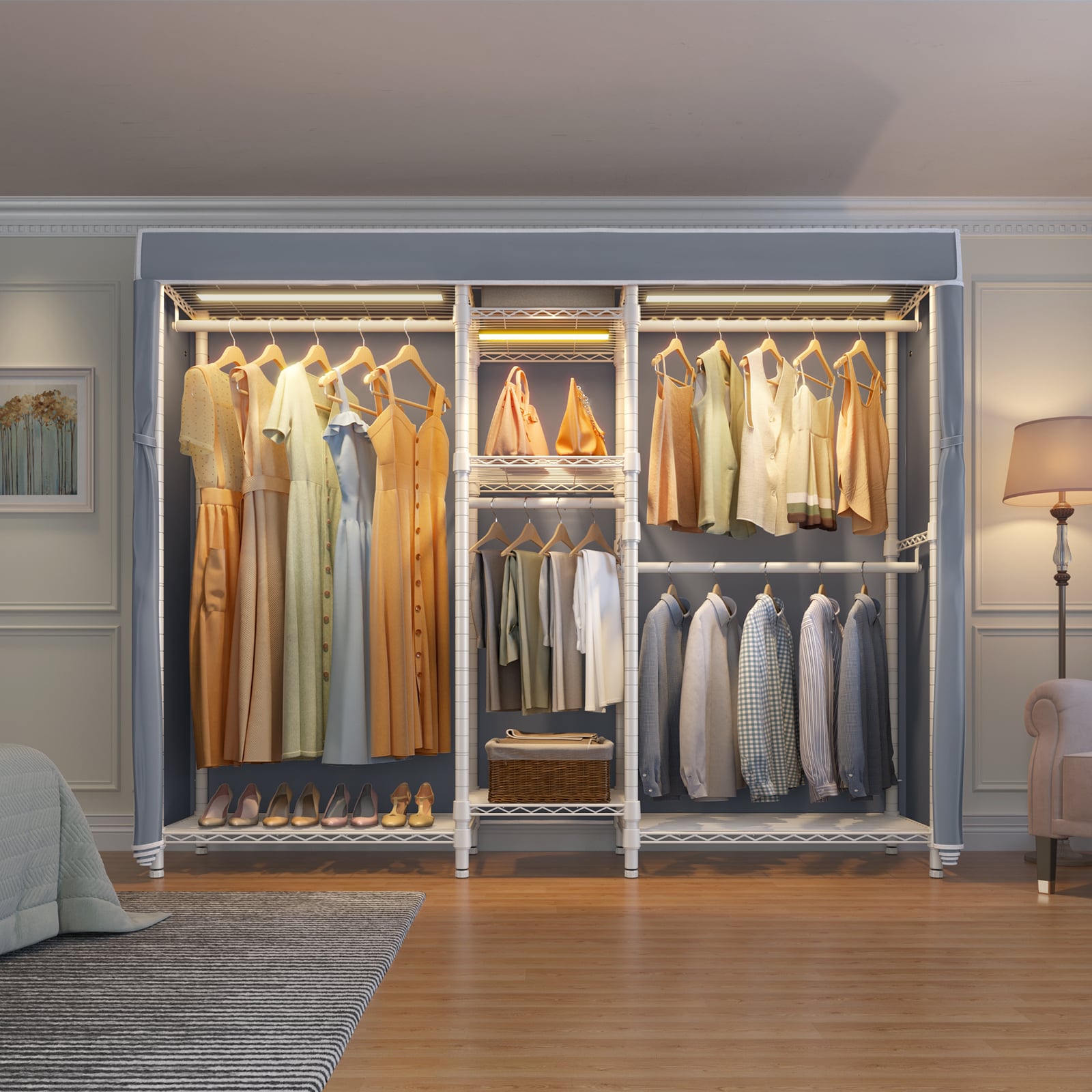 - Dimmable LED Lights -- This portable closet rack features built-in 3000K warm white LED lighting. The closet lights are bright and eye-protection, thanks to 120pcs energy-saving LEDs and stepless dimming brightness to allows you to brighten or dim them for your needs.