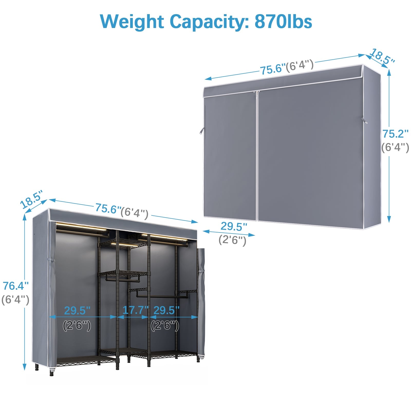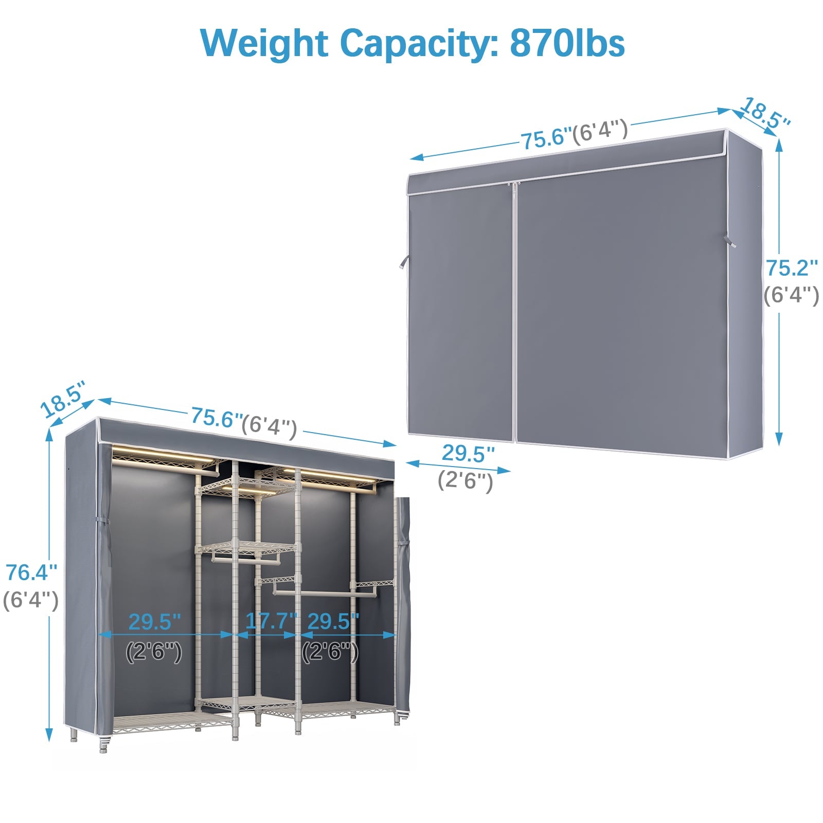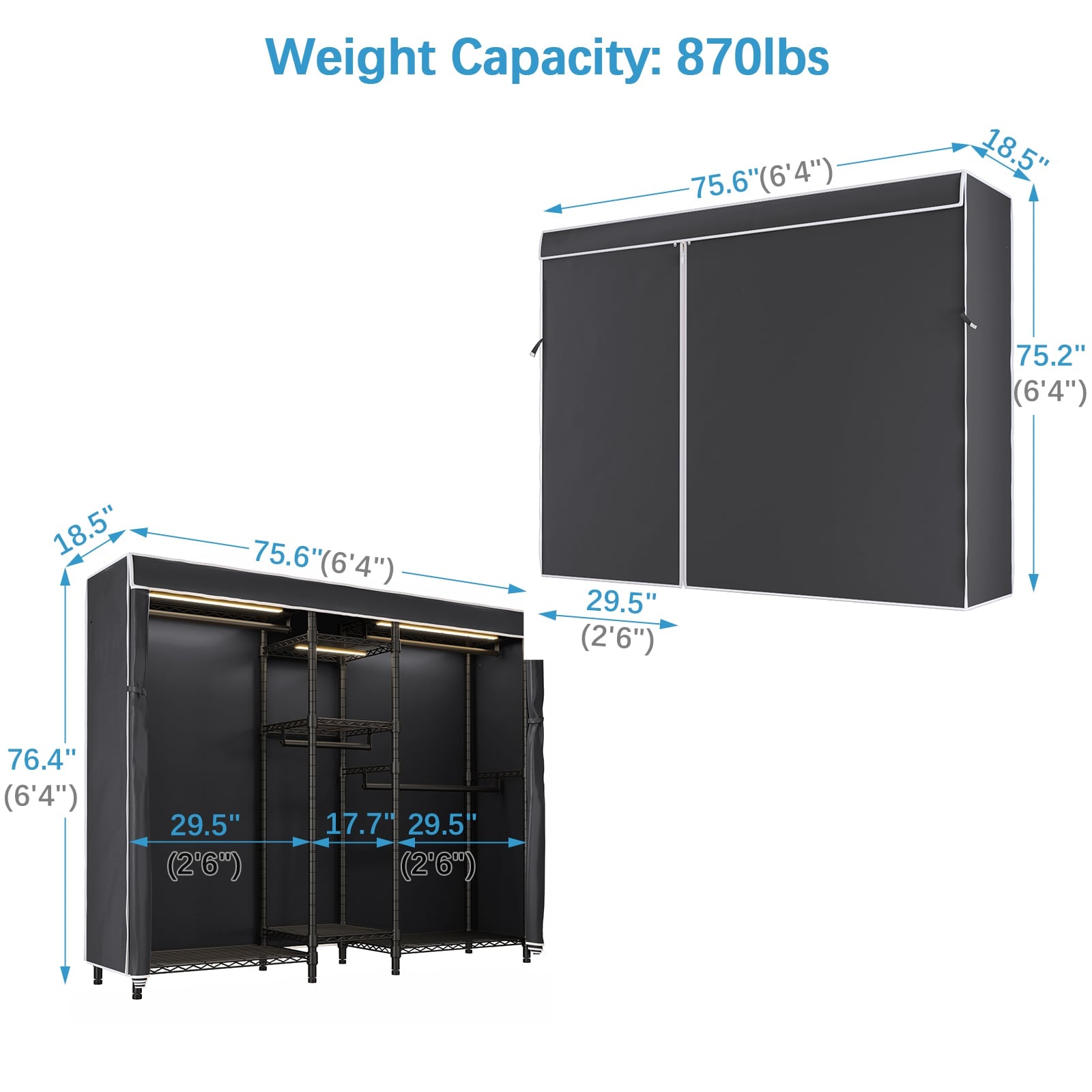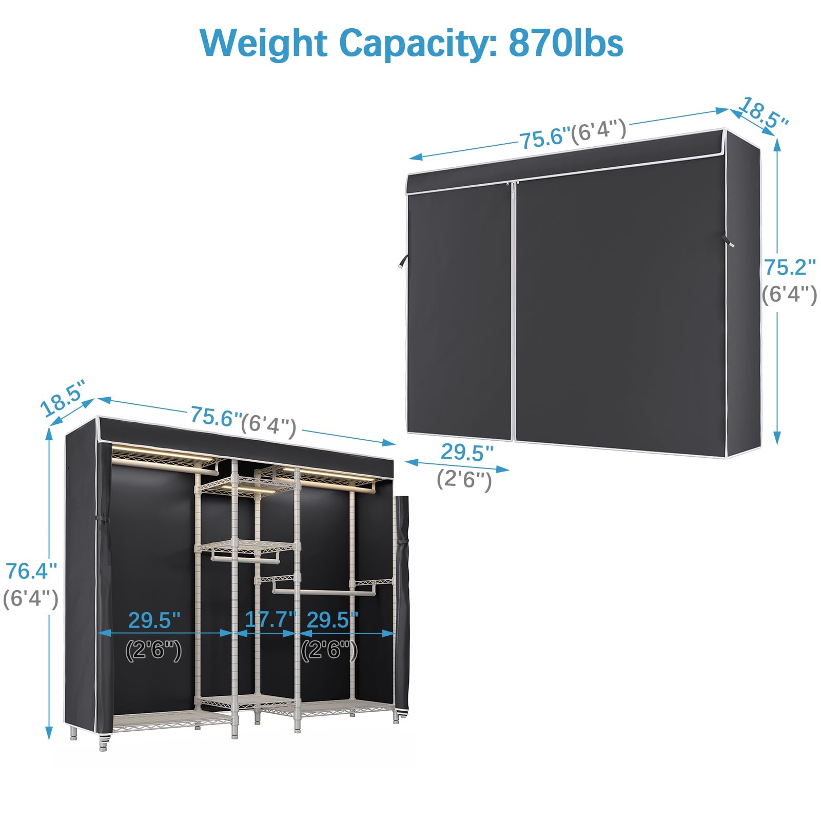 - Design and Strong Load Capacity -- VIPEK V6L portable closet for hanging clothes dimensions 73.6''Lx17.3'W'x76.4''H, max load capacity up to 850 lbs. This compact metal clothes rack provides ample space for all your clothing storage.