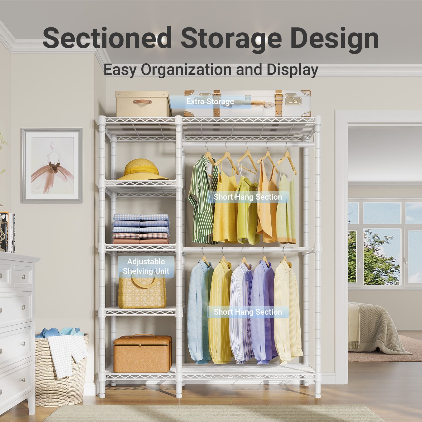 - 【Well-Organized Garment Rack】Double hanging rod is for hanging dress, suits, shirts, pants without wrinkle. And 5 tiers storage shelves provide enough place for handbag, hat, fold clothes, storage box, bedding. Say goodbye to messy!