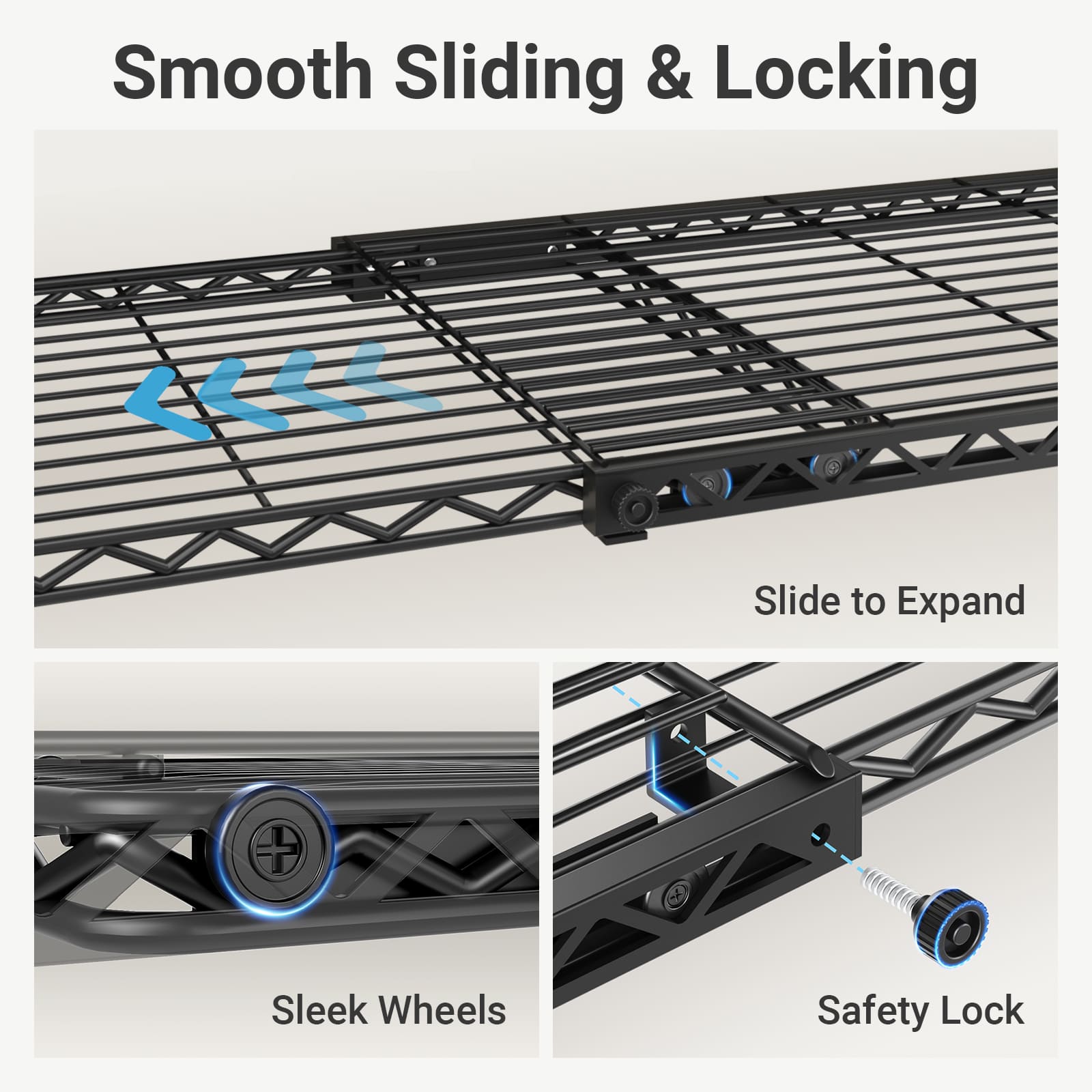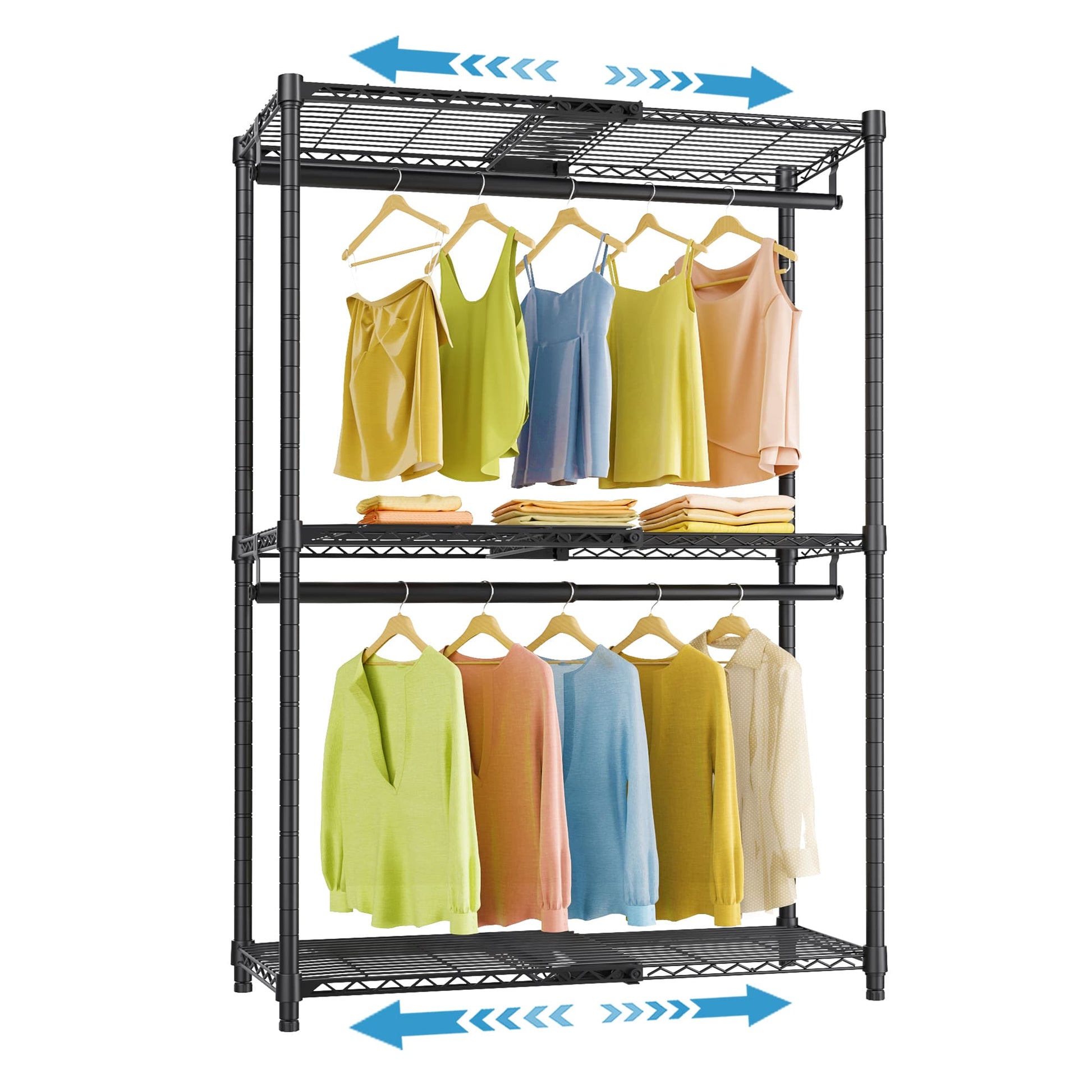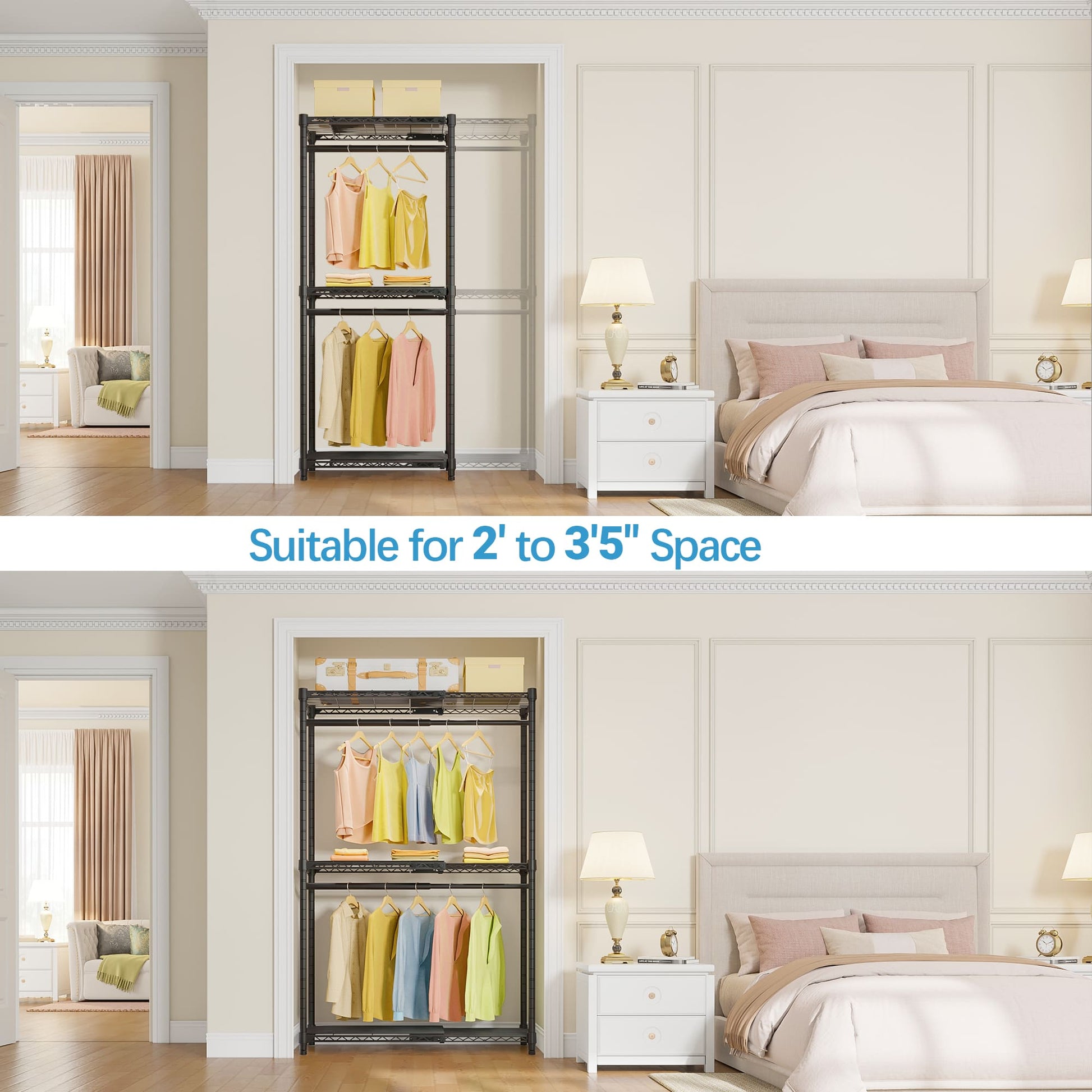- Flexible Adjustment & Secured Locking: All the clothes rack wire shelves and hanging rods can be lengthened or shortened (24" to 41") based on your needs. They are equipped with secured locking gadgets, eliminating the annoyance of overextending.