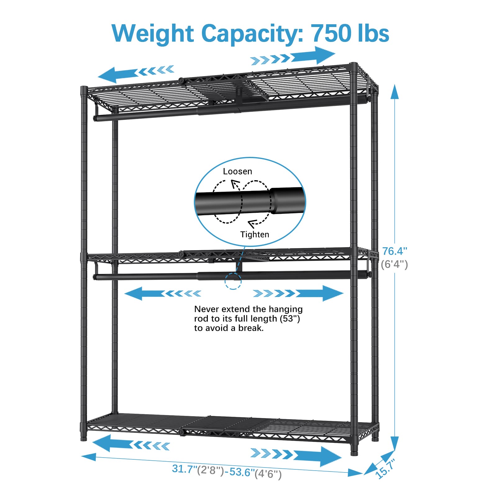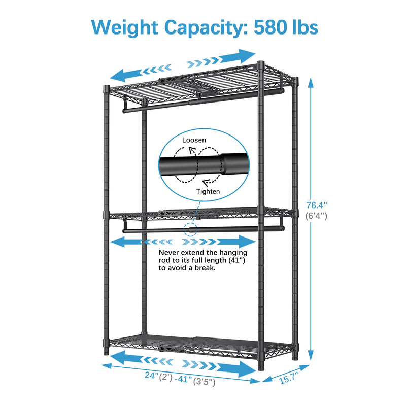 - Dimensions & Load Capacity: (24"-41")W x 15.8"D x 76.4"H, X1 clothing rack maximum load capacity 580 lbs, constructed of high-quality carbon steel, sturdy and reliable, it is long-lasting and features anti-tip devices to prevent unexpected falling.