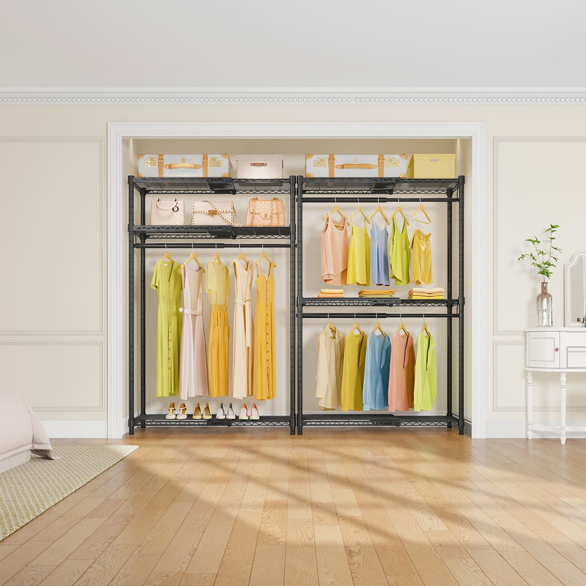 - Multifunctional Garment Rack: The wardrobe rack can be used in multiple types of rooms, suitable for cloakrooms, bedrooms, apartments, school dormitories, and laundry rooms. Shoes can be put on the bottom of the shelf neatly, and clothes can be folded and organized on the shelves.