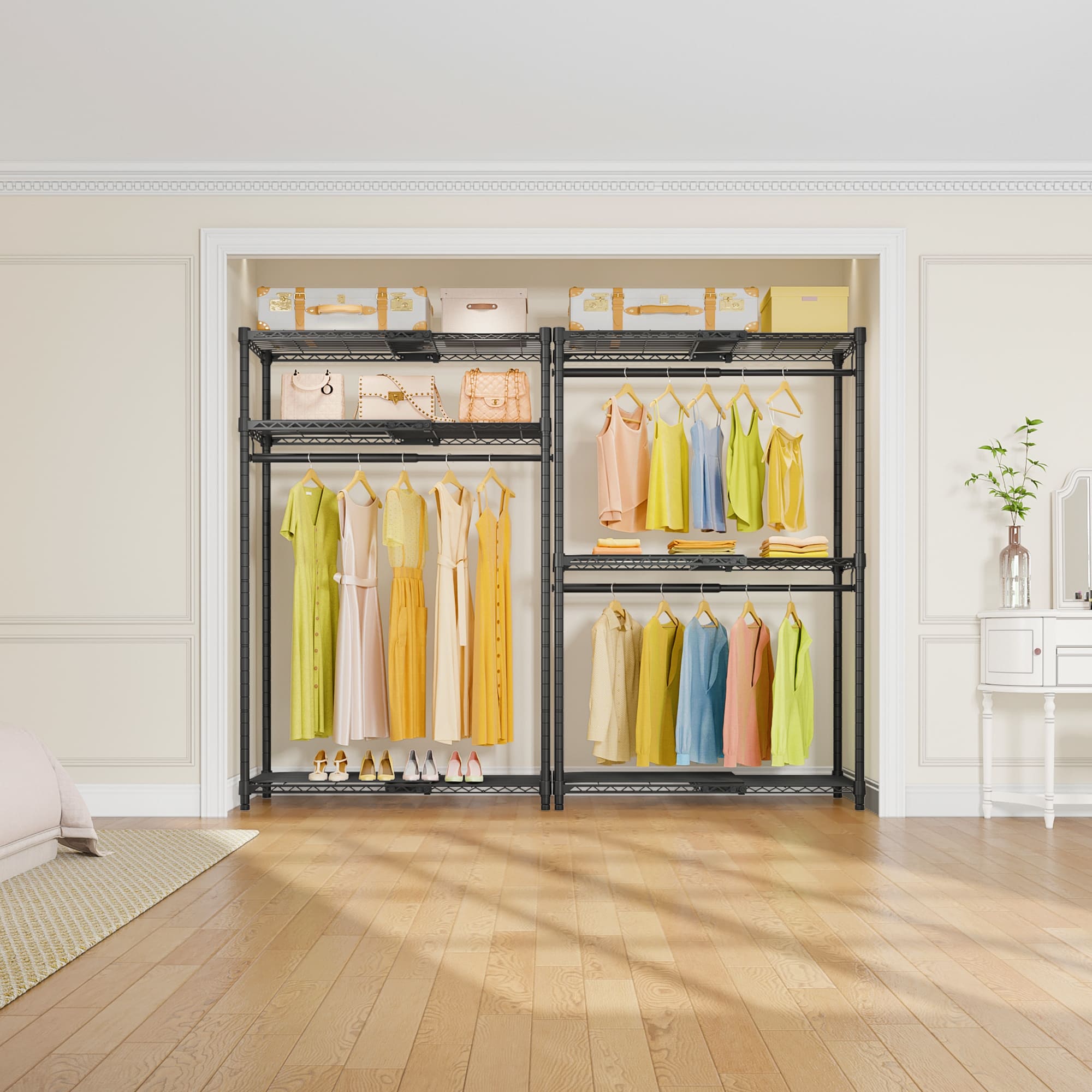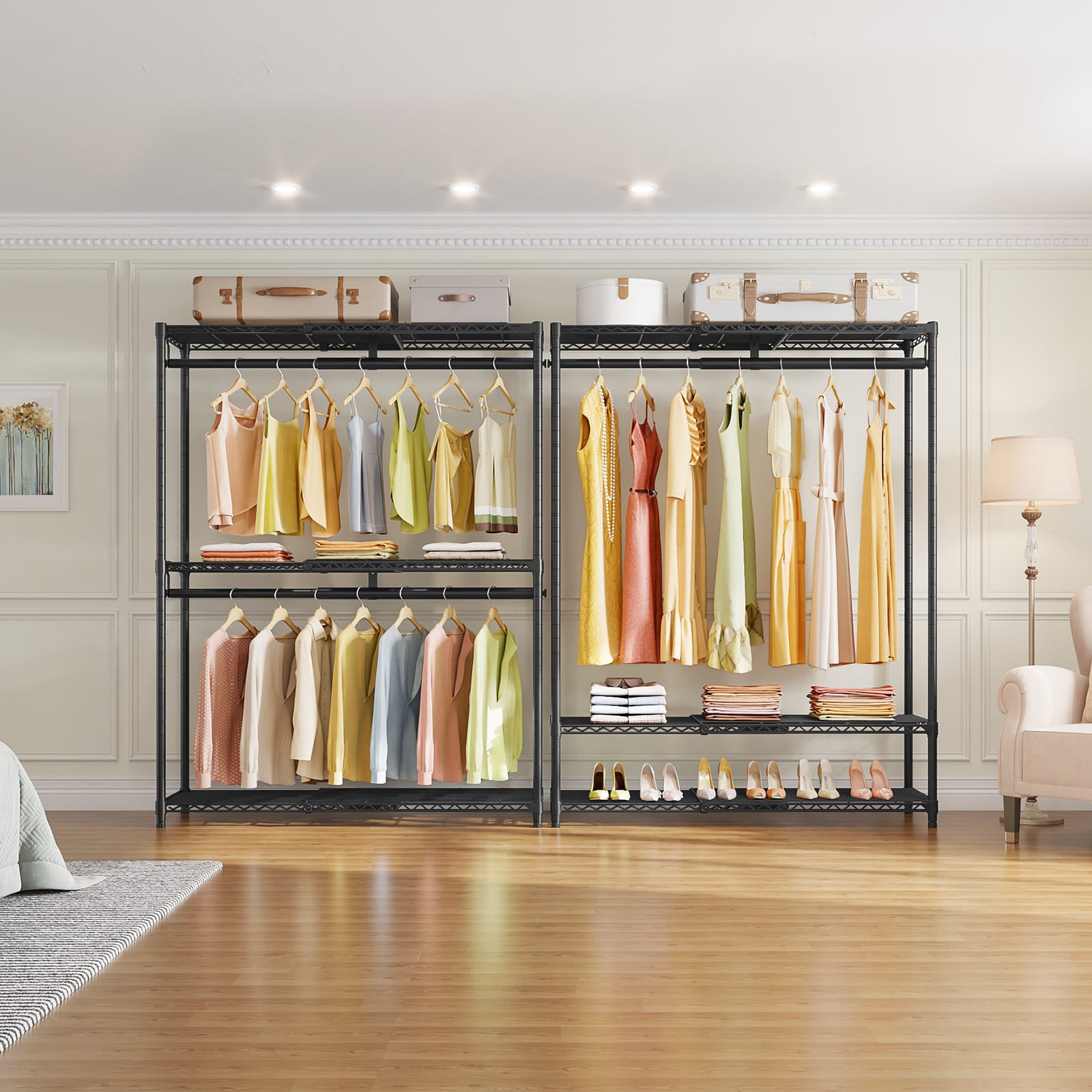 - STURDY & RELIABLE CLOSET ORGANIZER: Made of high quality iron, it features stable, sturdy and reliable freestanding closet system. Each hanging rod can support up to 75 lbs. Easy access in bedroom, cloakroom, clothing store, laundry room, walk-in closet and more.