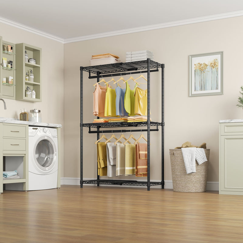 VIPEK X1 Expandable Clothes Rack is a versatile storage solution, adjustable from 2' to 3'5", featuring 3 expandable shelves and 2 extendable hanging rods. Ideal for small spaces, this heavy-duty rack supports up to 580 lbs, ensuring stability with its high-quality carbon steel construction. Perfect for bedrooms, dorms, and laundry rooms, it offers flexible organization for clothing and accessories while being easy to assemble with clear instructions.